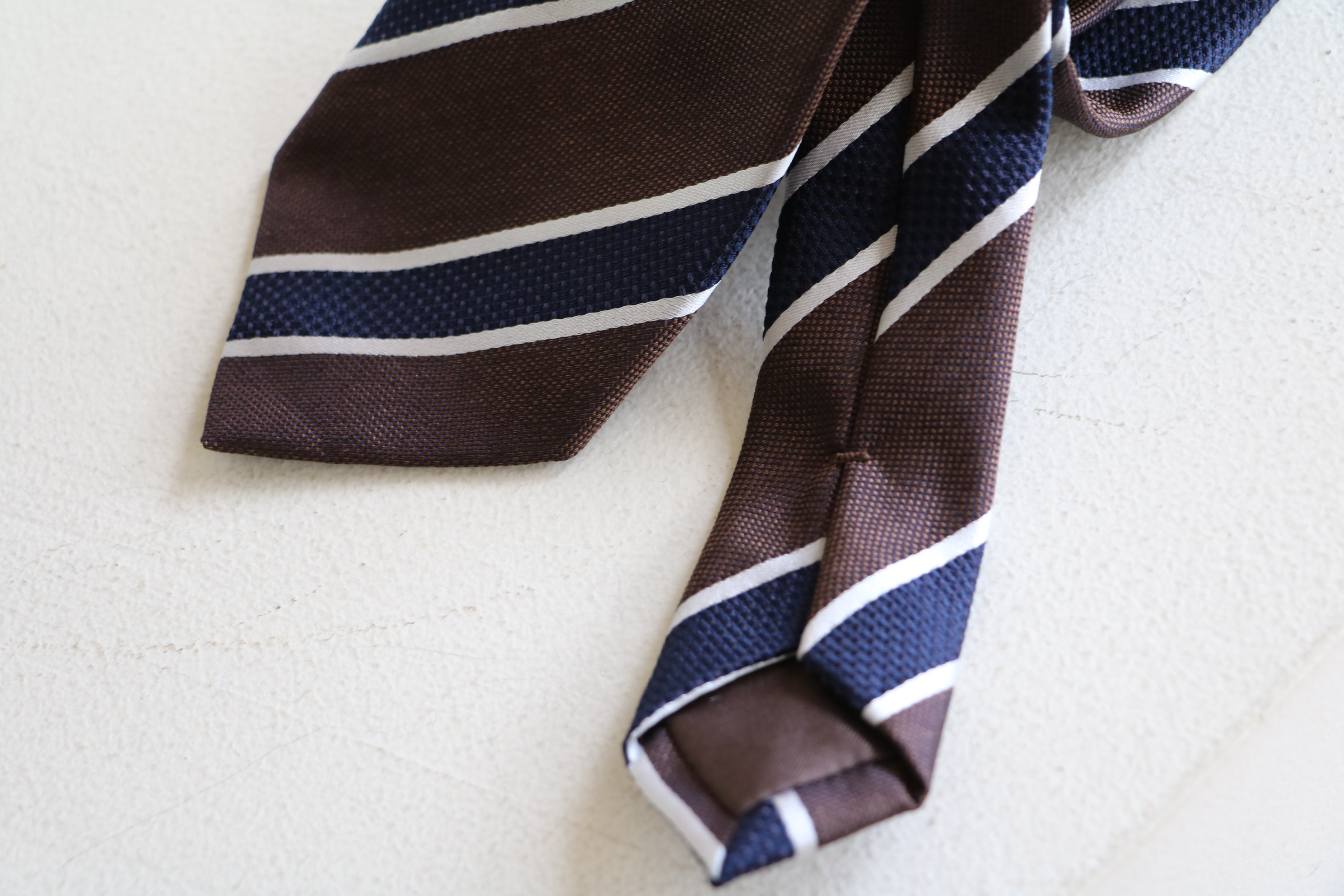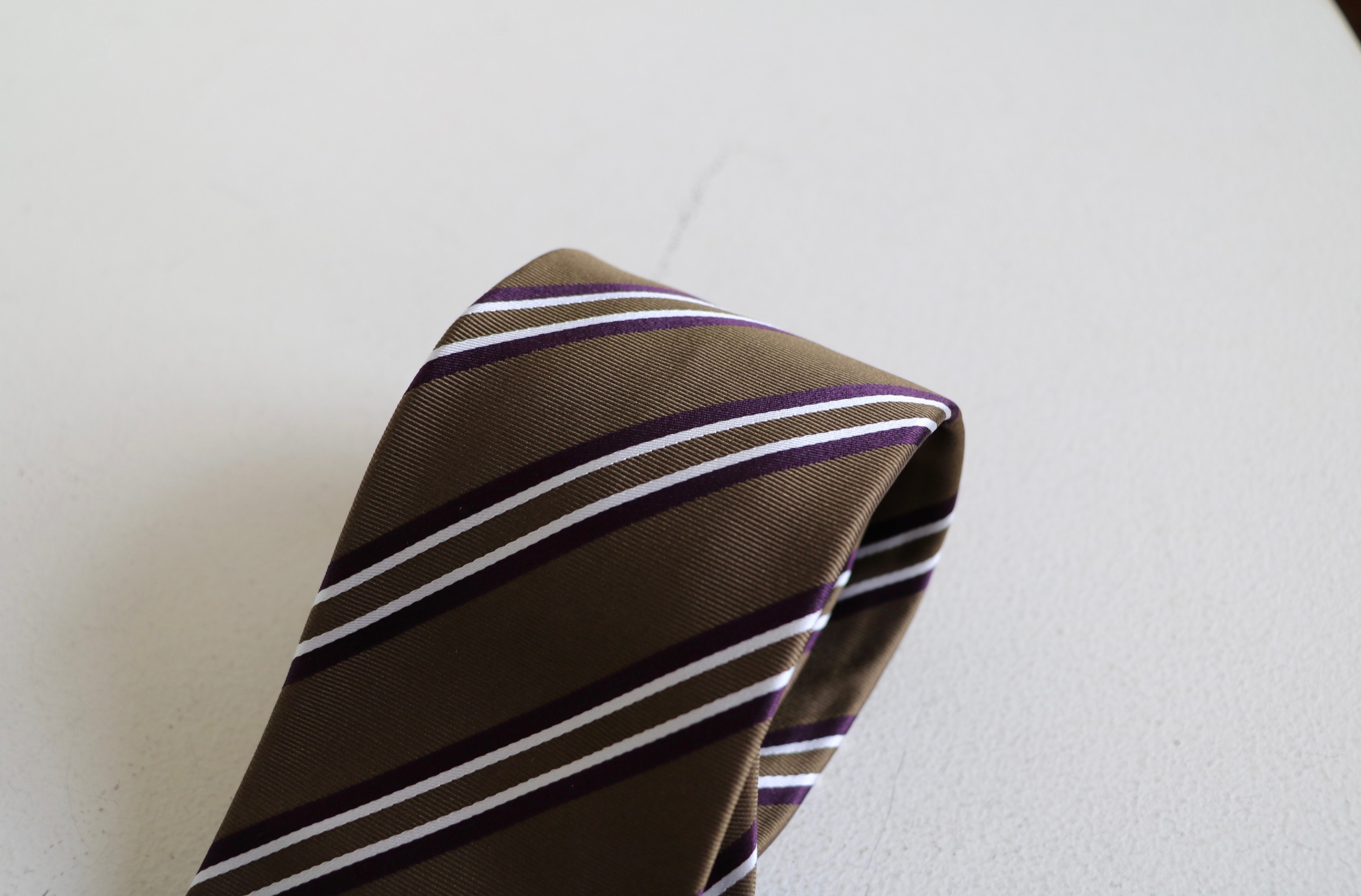 ベーシックなシルクのストライプ柄ですが、配色が新鮮。オリーブドラムをベースにグレープとホワイトのラインがアクセントです。