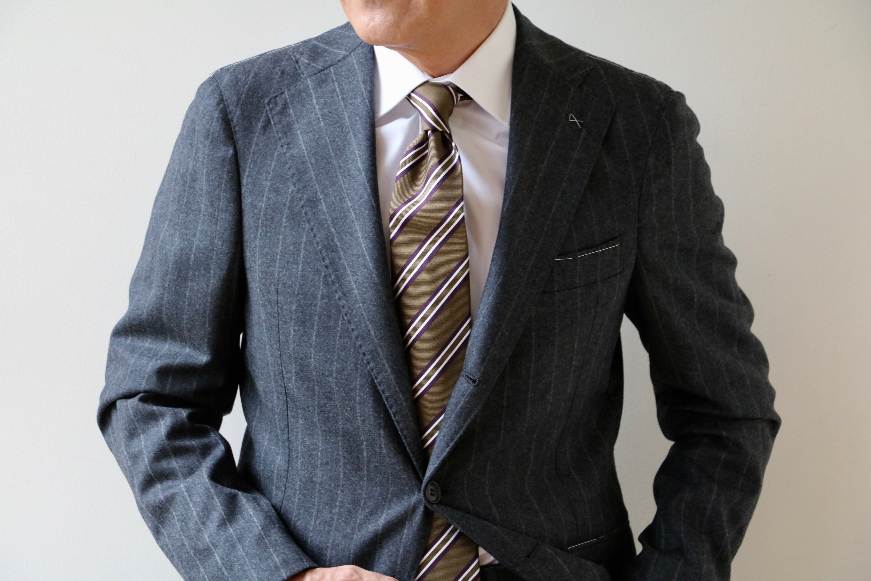 スーツが売れる時代ではないとはいえ、オトコが最も輝いて見えるのが、スーツスタイル。時代に合わせて、ラフでイージーなものもいいけど、やっぱり作りのしっかりしたクラシックなものを。そうなると、選びたくなるのは、ストライプ柄。ナポリの【gabo/ガボ】から、グレイとネイビーのバンカーストライプをフランネルタッチでご提案します。
