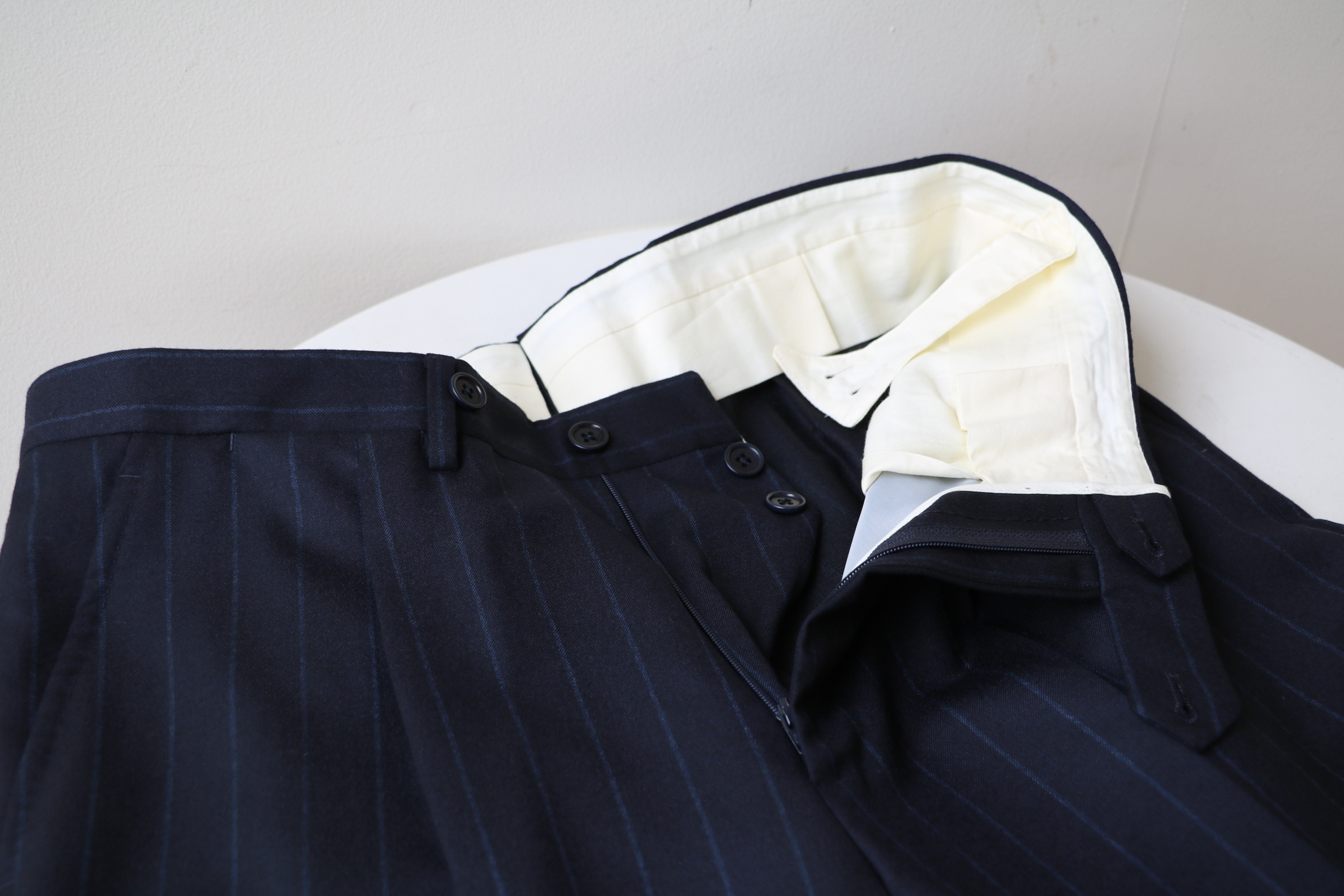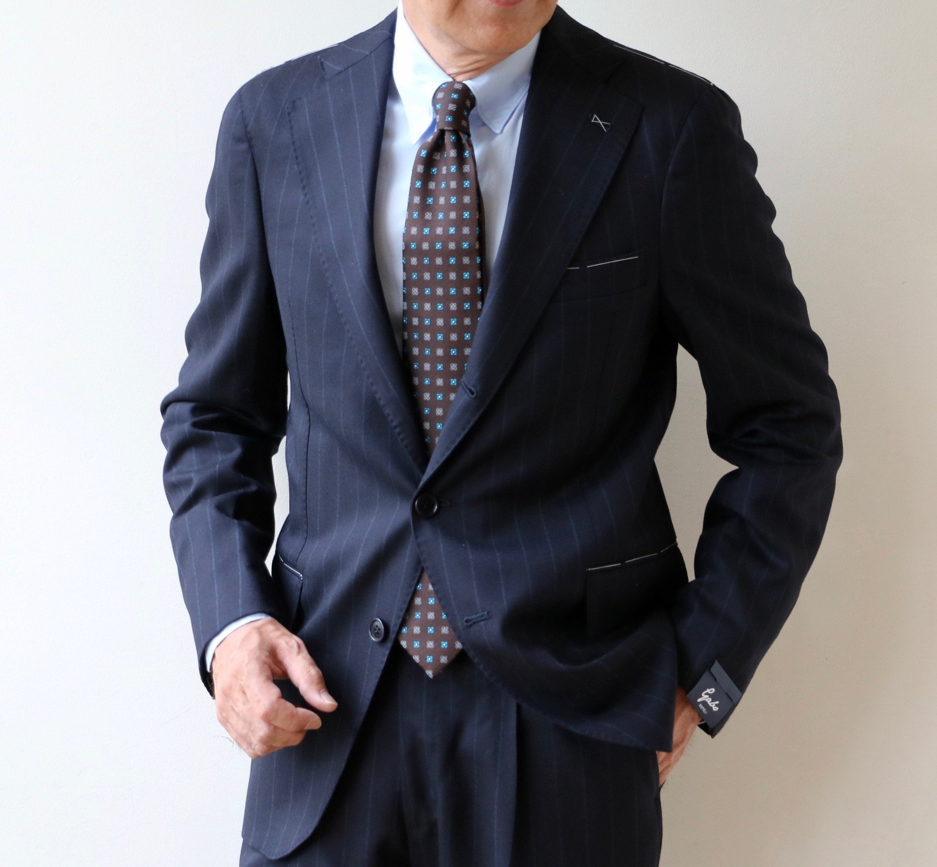 もう少しベースのネイビーが濃くなるでしょうか。バンカーストライプによく見るホワイト系のストライプではなく、同色のブルーを配することで、柄にきつさが出ずに、柔らかな表情を持ちます。派手すぎず、地味すぎず、キザにならない知的なネイビーのバンカーストライプ柄スーツです。