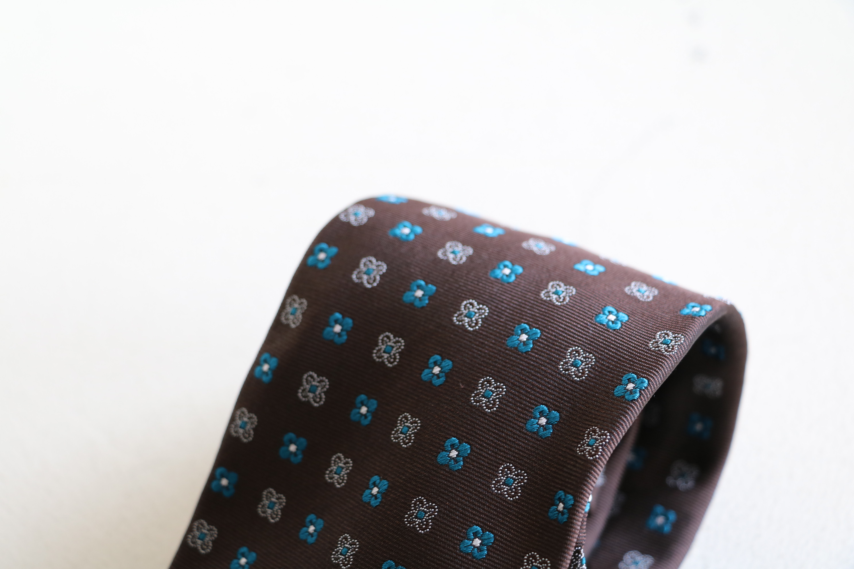 ダークブラウンにアクセントカラーはターコイズブルーです。やや緑がかった鮮やかなセルリアンブルーといった方が分かりやすいでしょうか。単色としては派手でも、ブラウンとホワイトの配色が素敵なハーモニーを生み出し、沈みがちなVゾーンを生き生きさせてくれます。