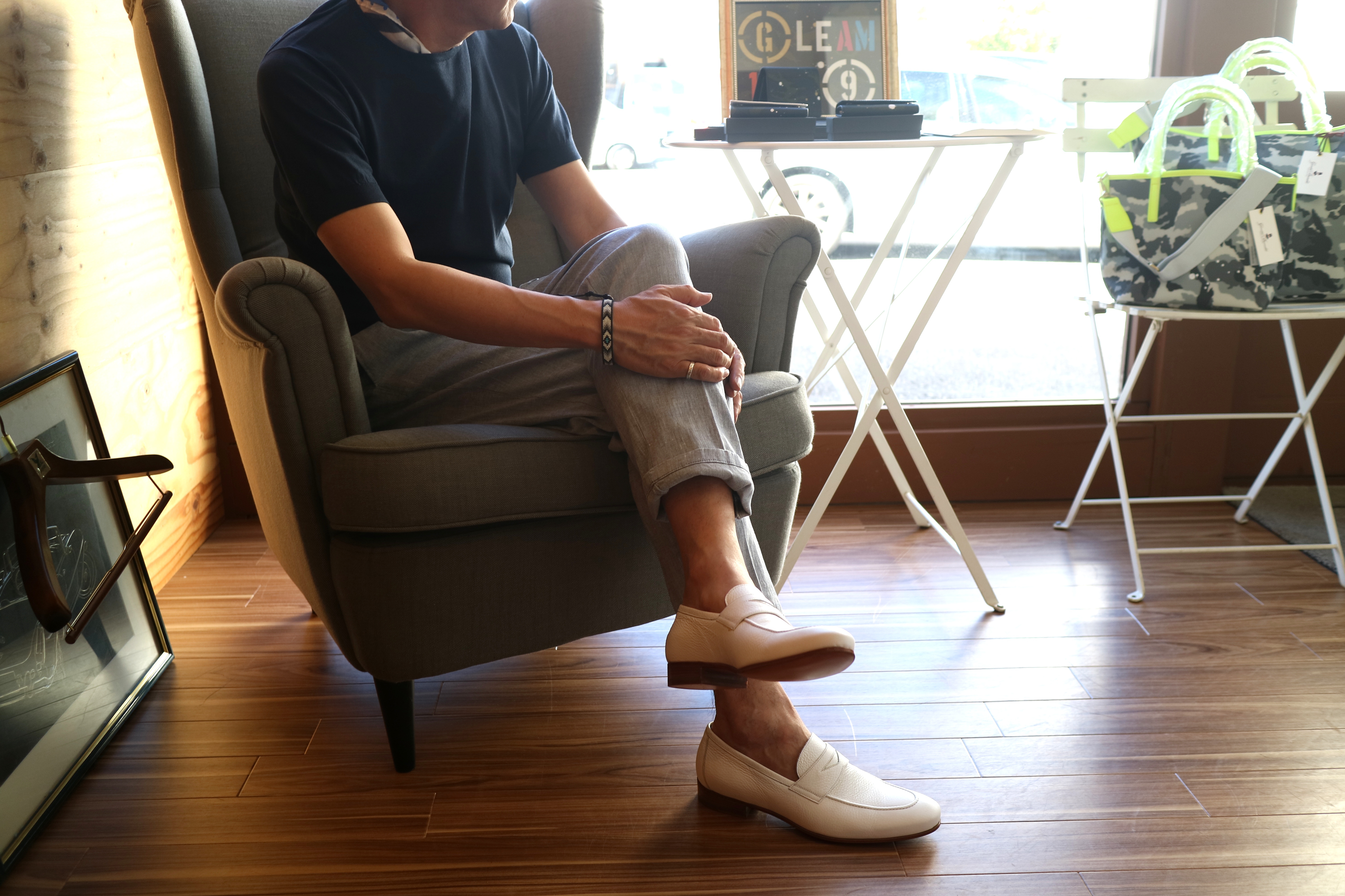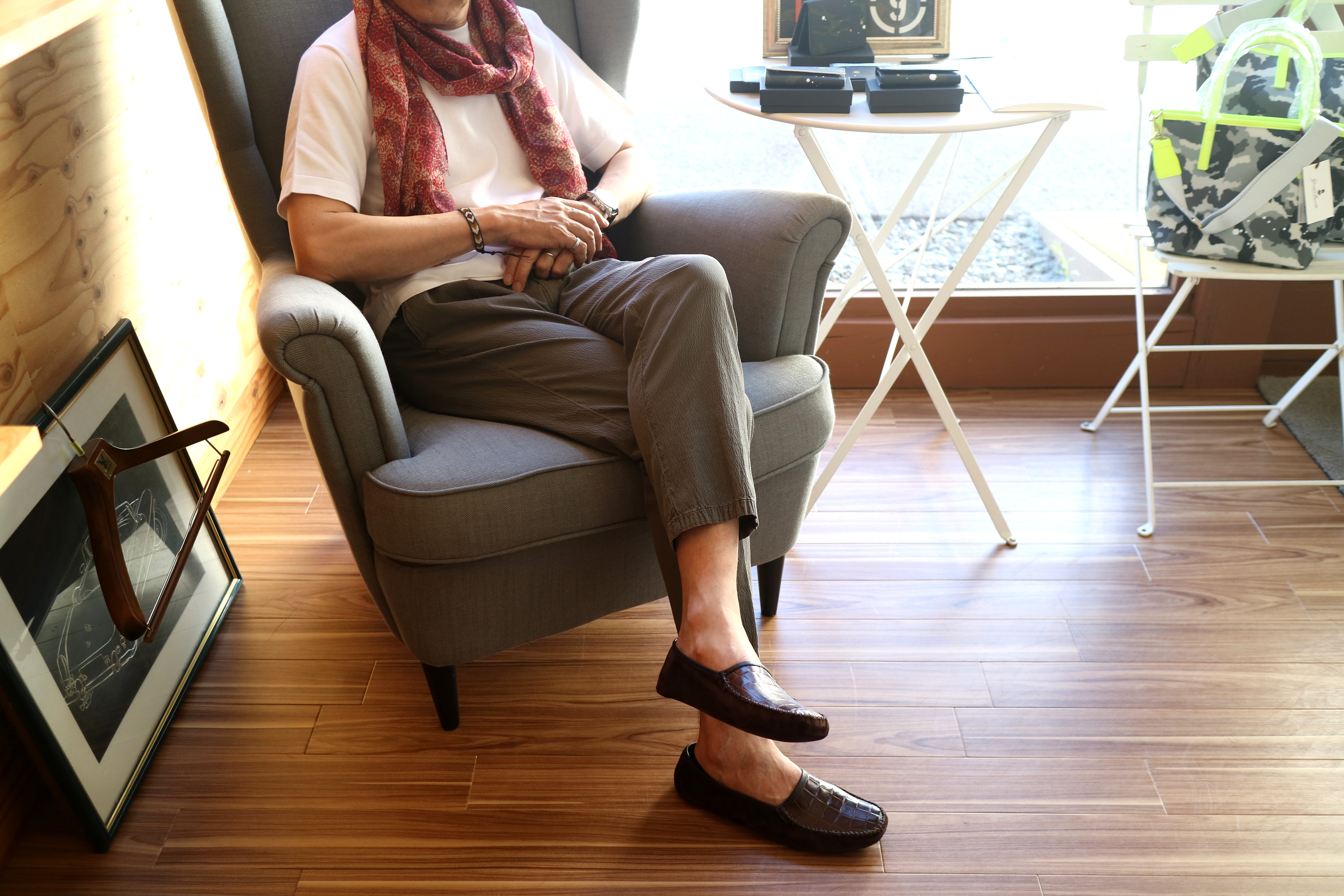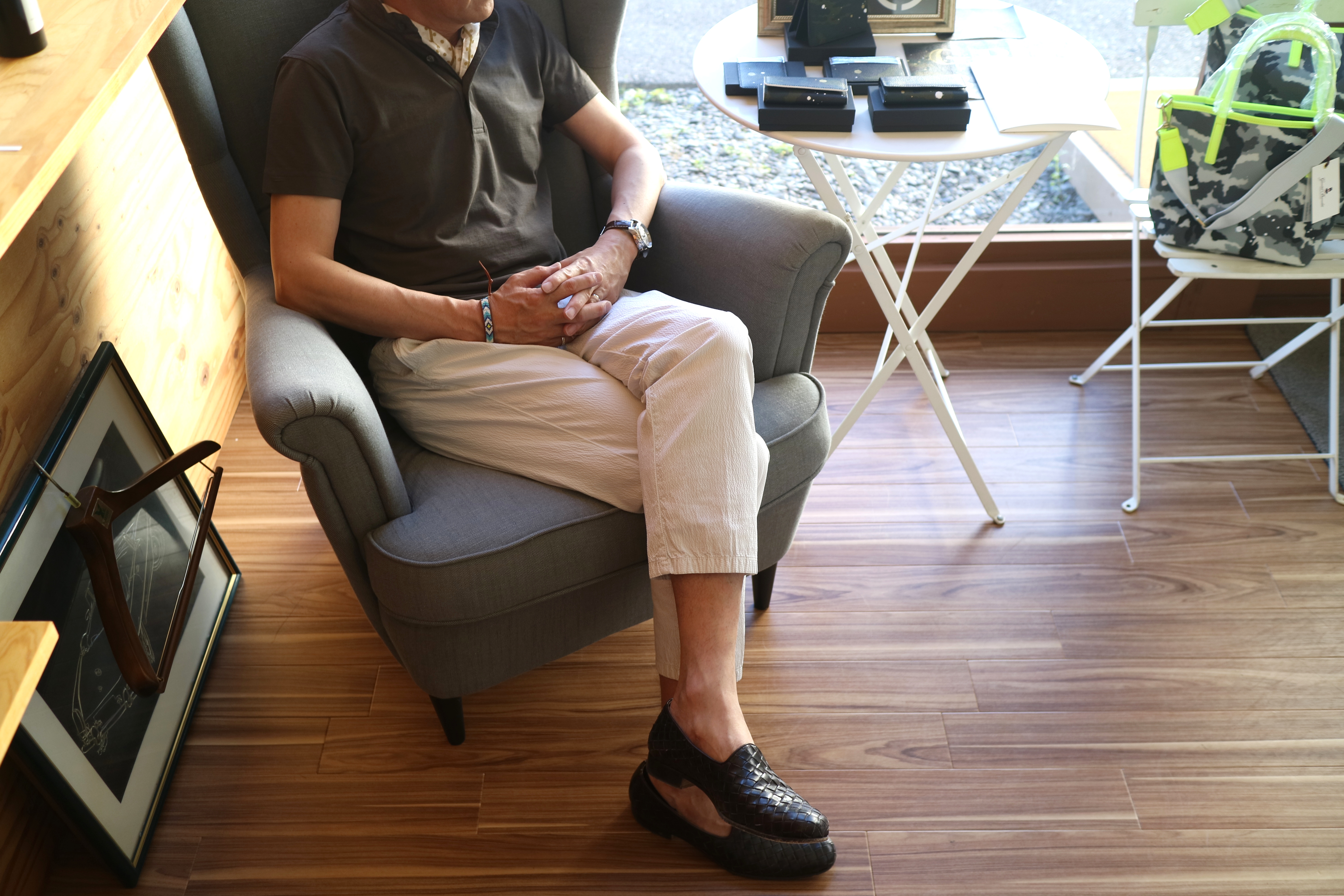 合わせたパンツは、RICHARD J. BROWN(リチャード ジェイ ブラウン)のデニム。お勧めのデニムとしてバイニングしているのに持っていないのはおかしい...そんな指摘がジュニアからあり、この後、早速購入です。たぶん、「父の日」のプレゼントではないかと期待しております。靴は私物のFERRANTE(フェランテ)、手に巻いたブレスはD'AMICO(アンドレア ダミコ)です。
