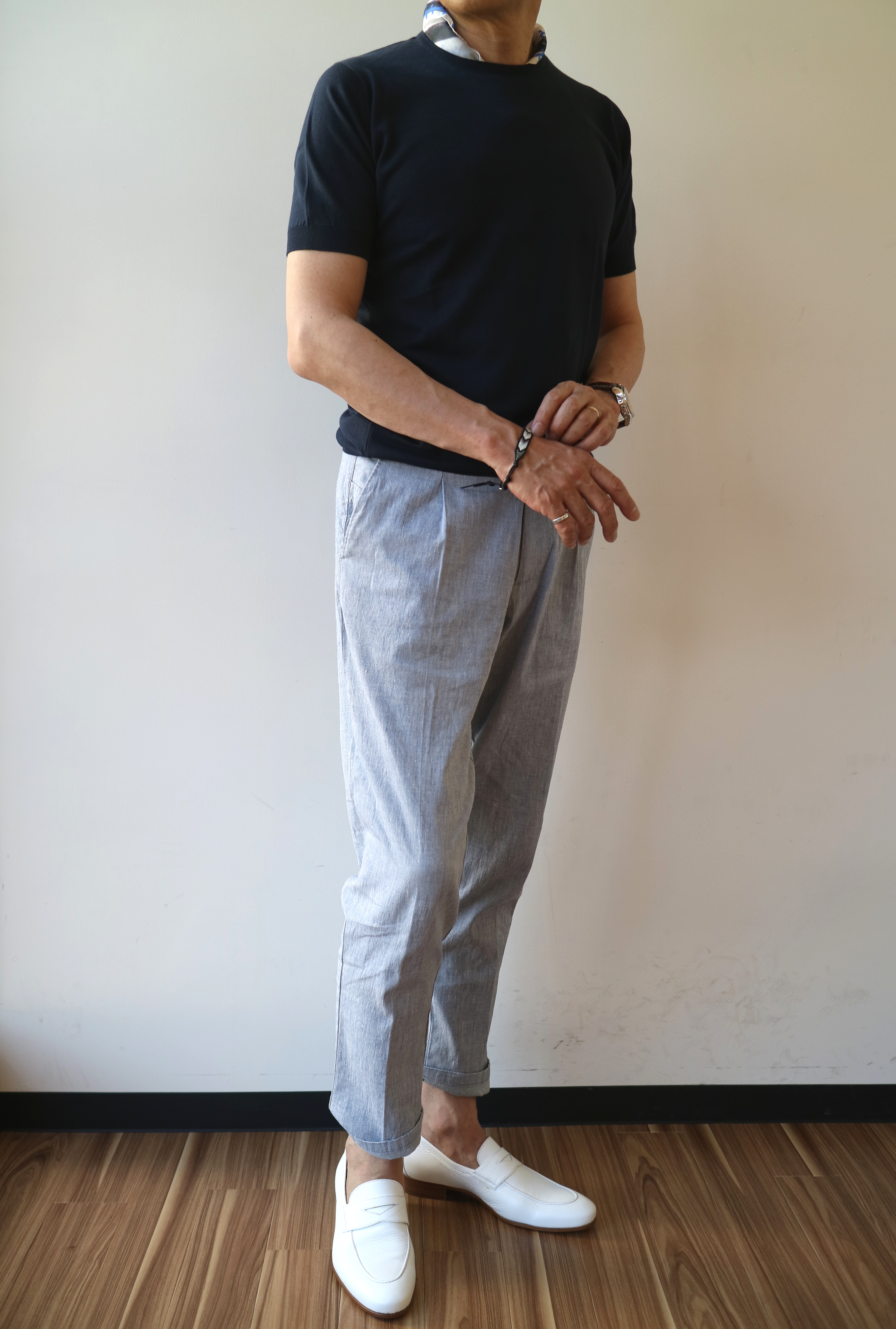 こちらもZANONE(ザノーネ)の半袖リネンラウンドネックとINCOTEX(インコテックス)のコットンストレッチパンツで、シェンナブラウンとデニムブルーのハーモニーをご覧頂いております。合わせた靴はDOUCAL'S(デュカルス)です。