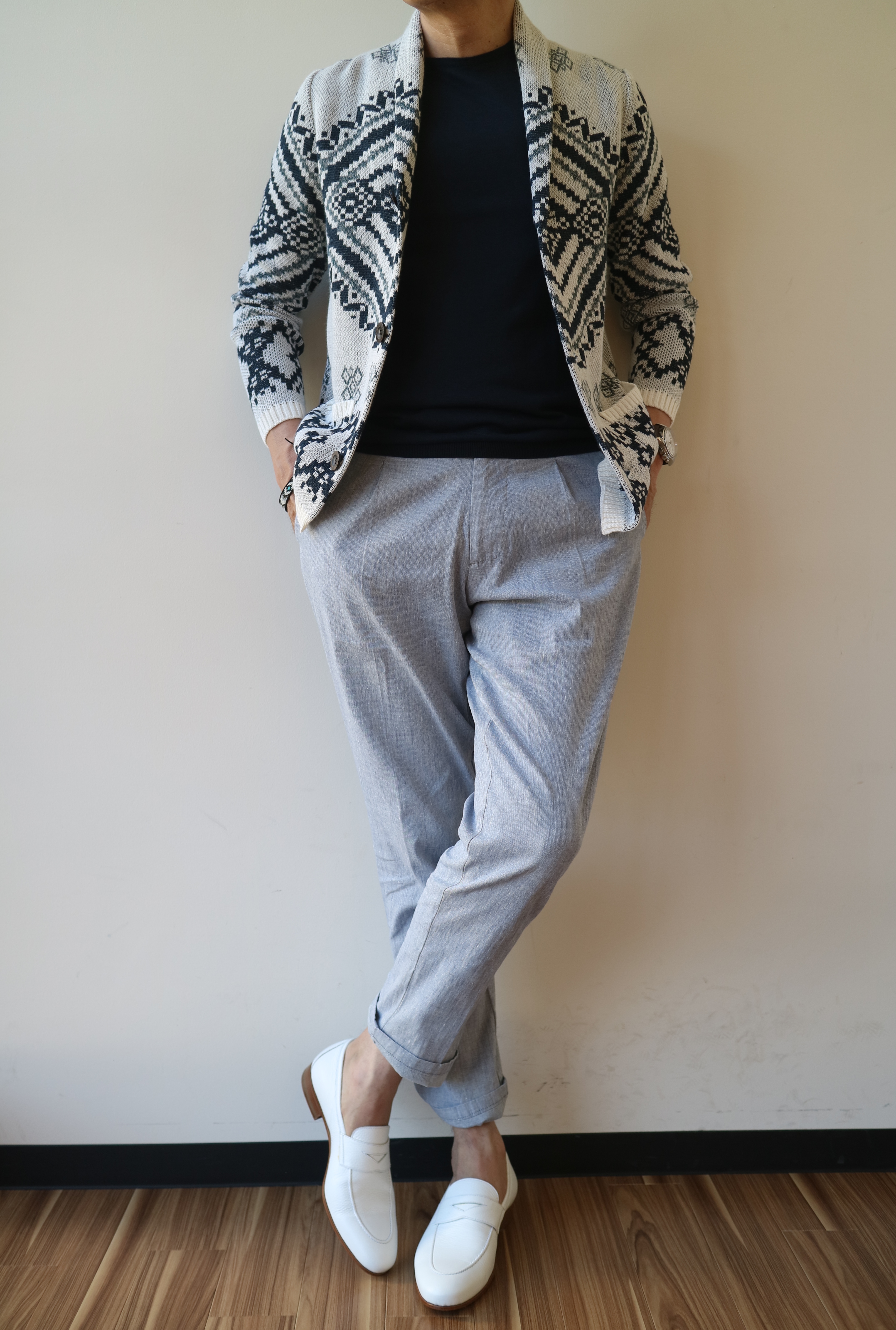 Finamore(フィナモレ)のリネンシャツに羽織ったのは、4月3日のブログにご案内させていただいたZANONE(ザノーネ)の襟付きカーディガン。ジャケットのような堅苦しさはなく、通常のカーディガンより、きちんと感が増す為、休日のお出掛けには最適です。