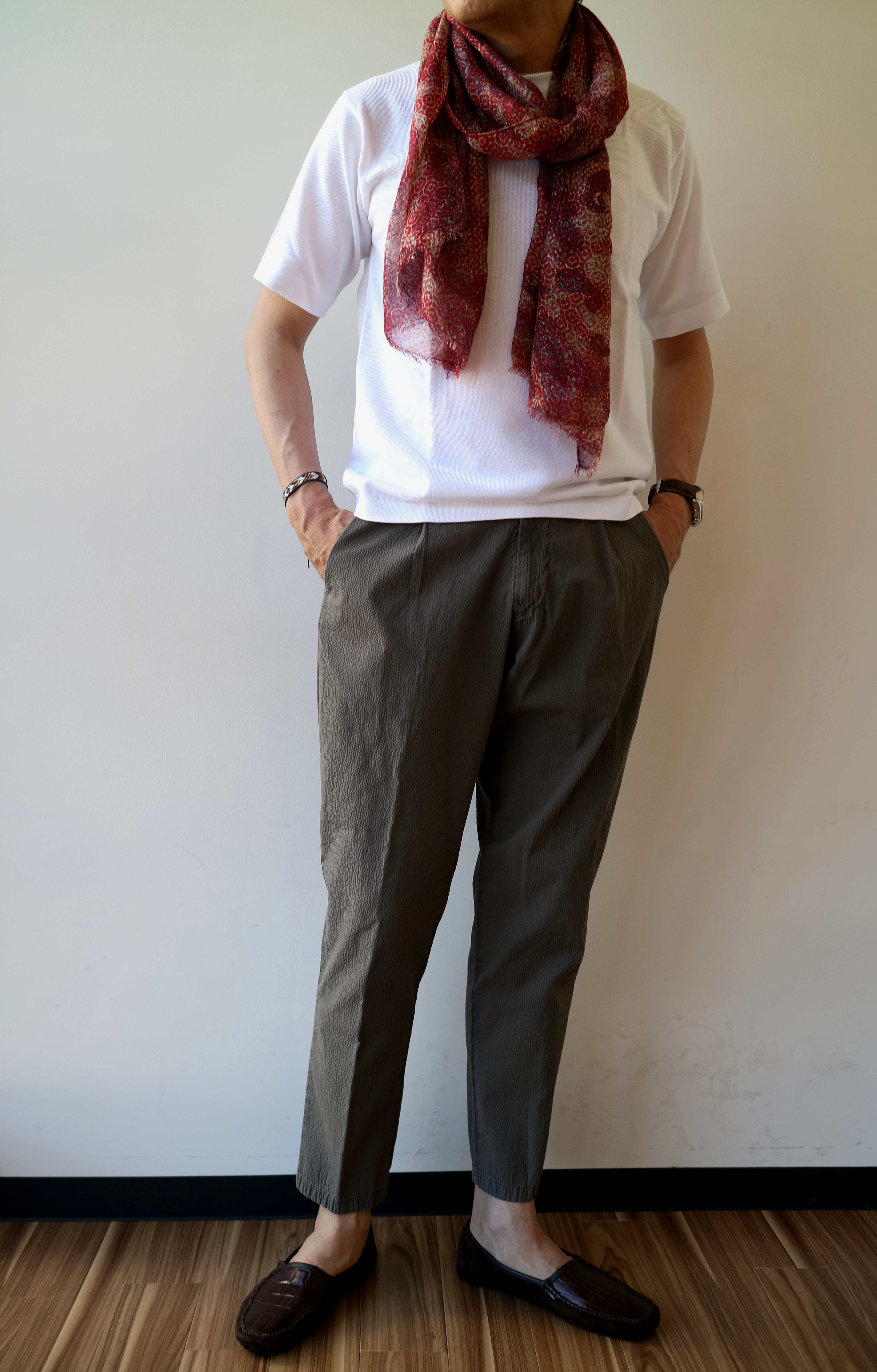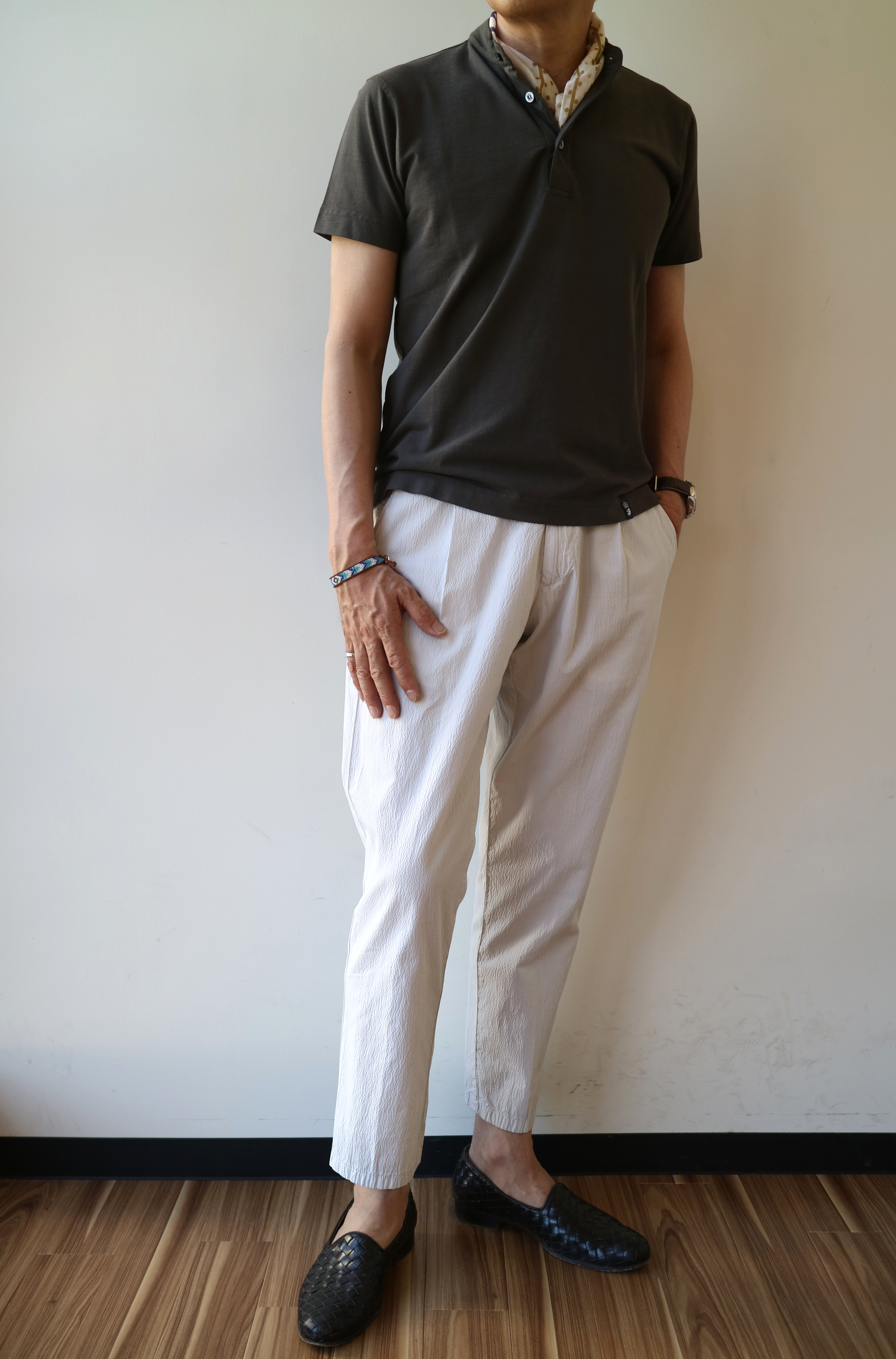 ご提案させていただきたいのは、BERWICH/ベルウィッチの「SAKE」。ワンタックのゆったりとした腰回りから裾幅にかけてテーパードした9分丈(股下の長さは、好みです)パンツ。素材も凹凸感のあるシアサッカー地。ストレッチも利いていて、穿き心地は申し分ありません。太めのパンツは苦手...そんな方でも、涼感とトレンド感を得ることができるだけに、この機会にワードローブに仲間入りさせてはいかがでしょう。