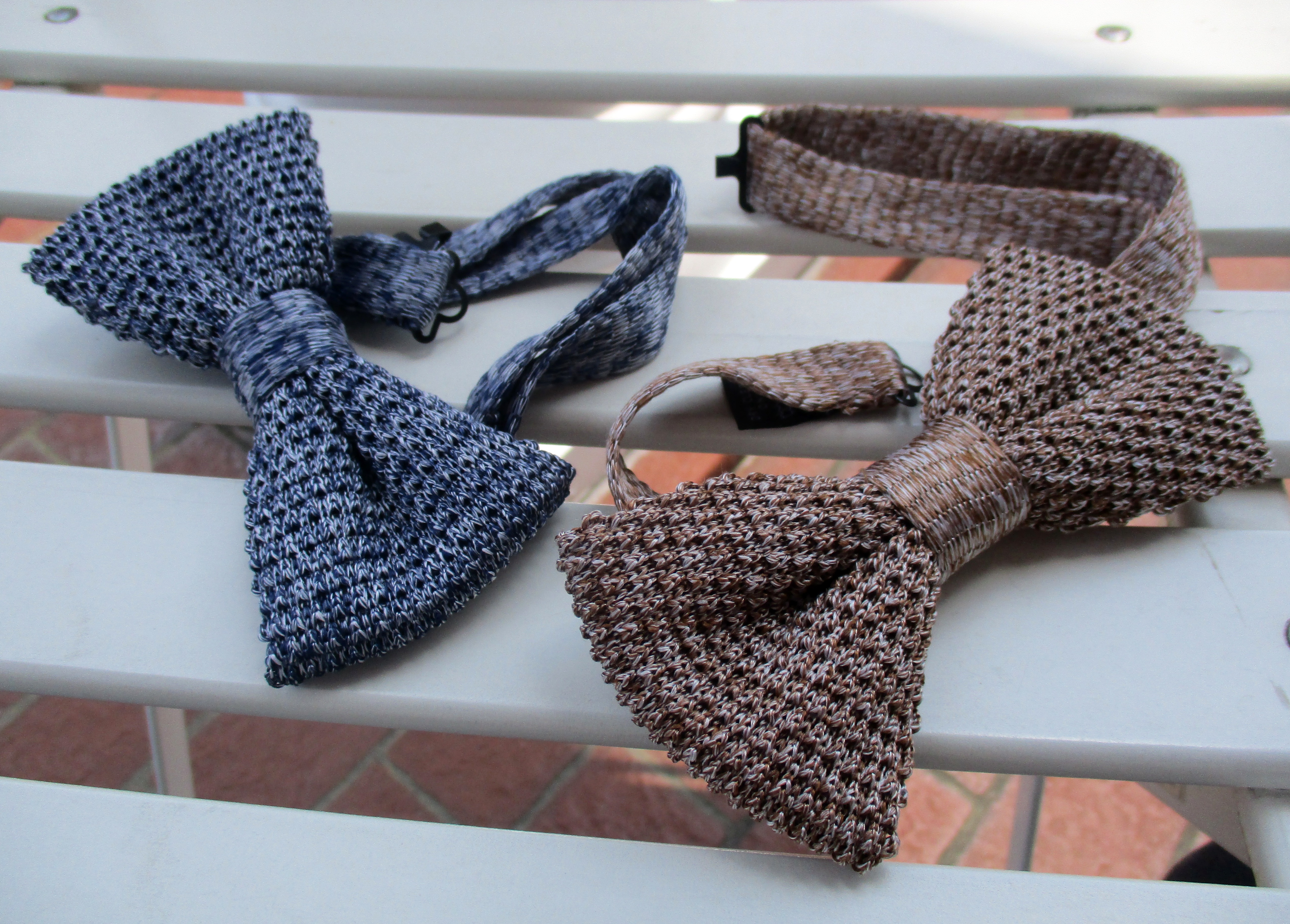 シルク100%のニットで結ばれたバタフライの蝶タイ。ナチュラルなベージュとネイビーのメランジでご用意しました。初めから結び目が作られていて、首の後で留めるピアネスタイプですので、誰にも簡単に使っていただけます。