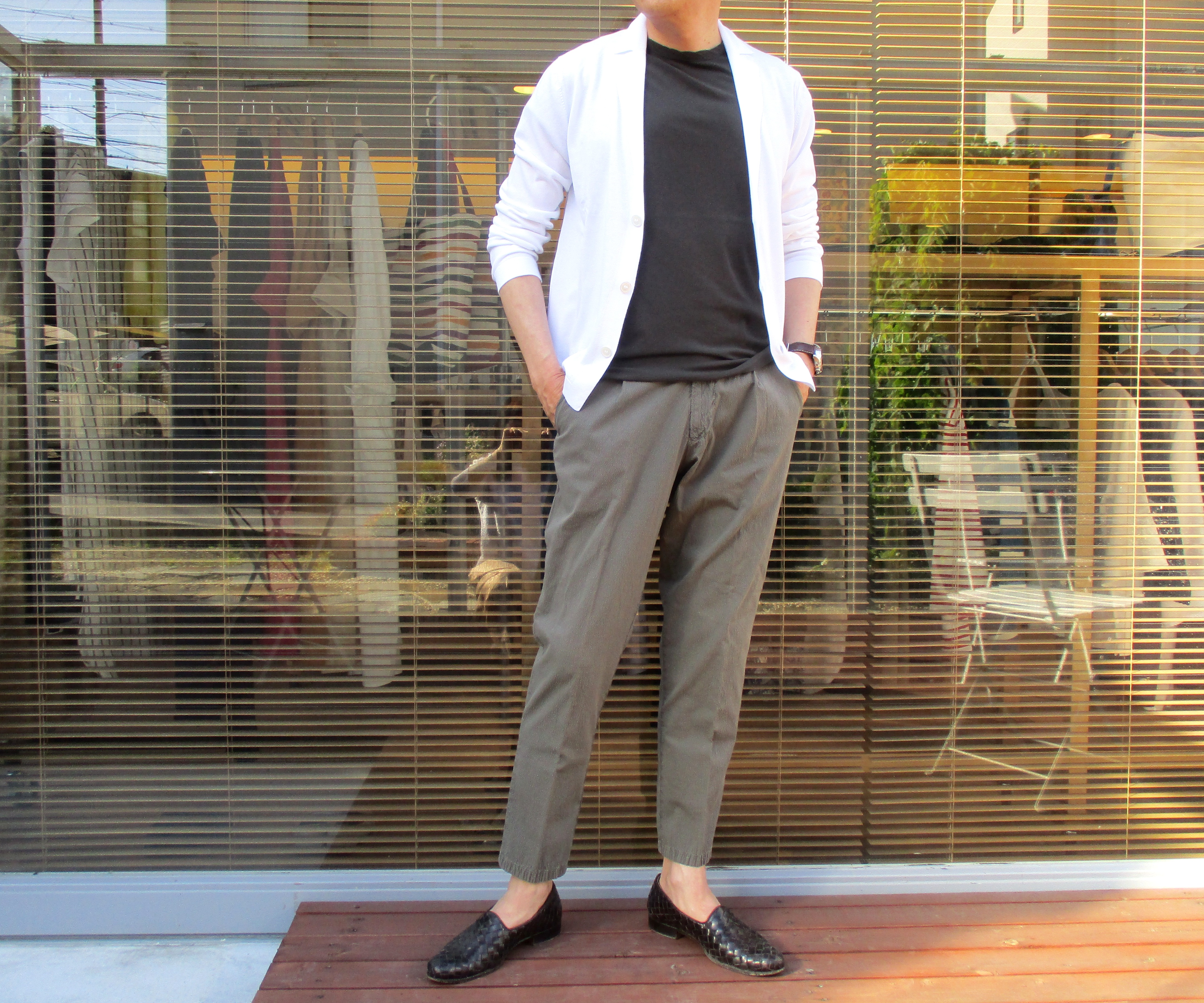INCOTEXのリネンパンツに、Gran Sassoの襟付きカーディガン、そしてZANELLATOのバッグにDOUCAL'Sのシューズと。いわゆる、ラテンアメリカに根付くカラフルで陽気な側面ではなく、これはサファリルックにも通じるところがありますが、乾いた大地に足を踏み入れるトラベラーのイメージでしょうか。