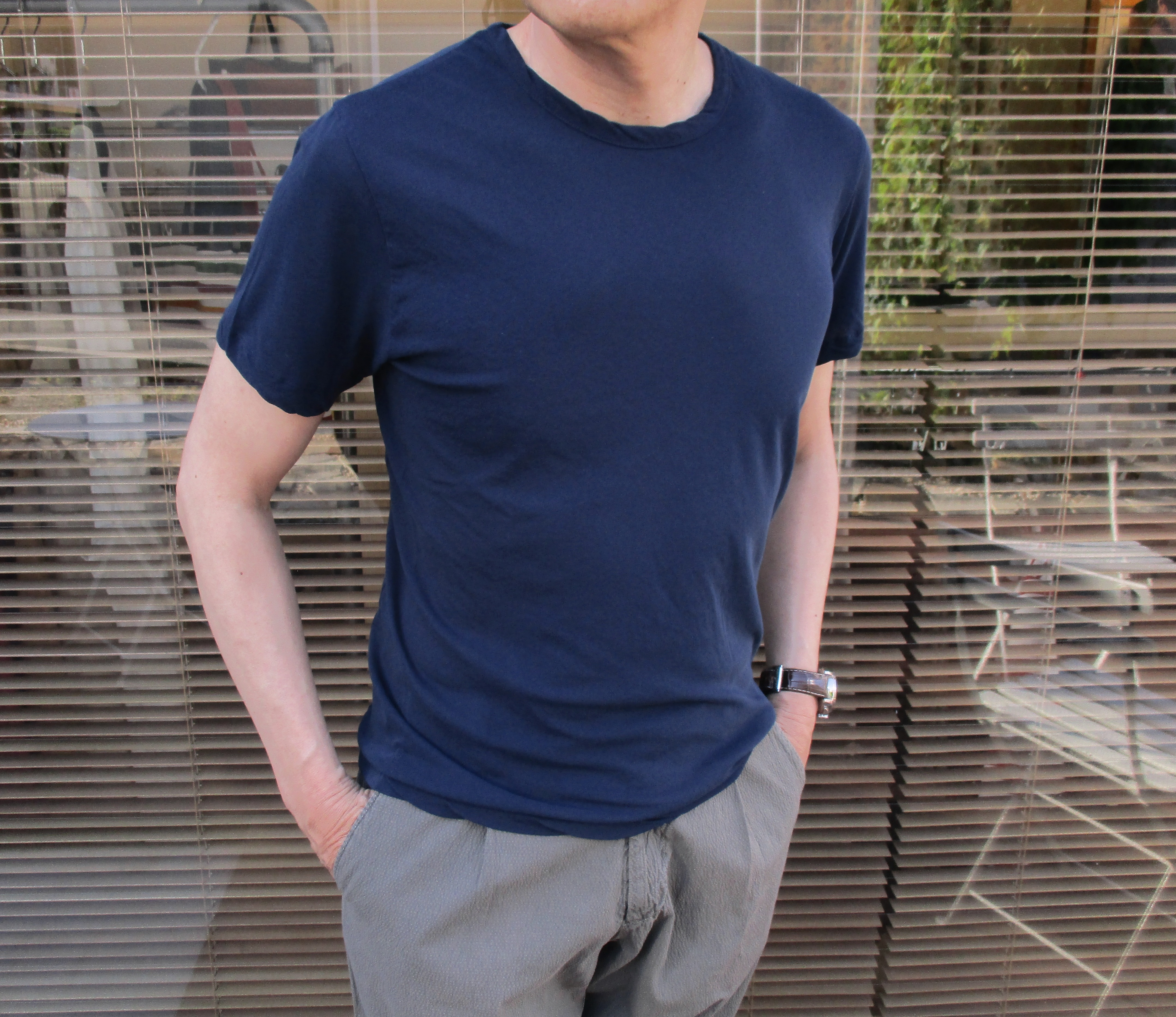 その人気の秘密とは、コットンなのにシルクのような滑らかな肌触りと、光沢感のある上質な素材感。Tシャツには珍しいバイアスに使われた生地でしょうか。油脂分が多く、独特のヌメリ感があるインド綿。この綿を手摘みで収穫することで油脂分が損なわれないのです(FEDELI/フェデーリで使われているGIZA45も同じく手摘み)。そして、この摘みとった超長綿を何種類かブレンドして、80単糸の糸を紡績した後、限界まで強撚します。その後、36ゲージの丸編機で、天竺にすれば、生地が斜行してしまいますが、ここからが腕の見せ所...なんて、難しい話ですよね。