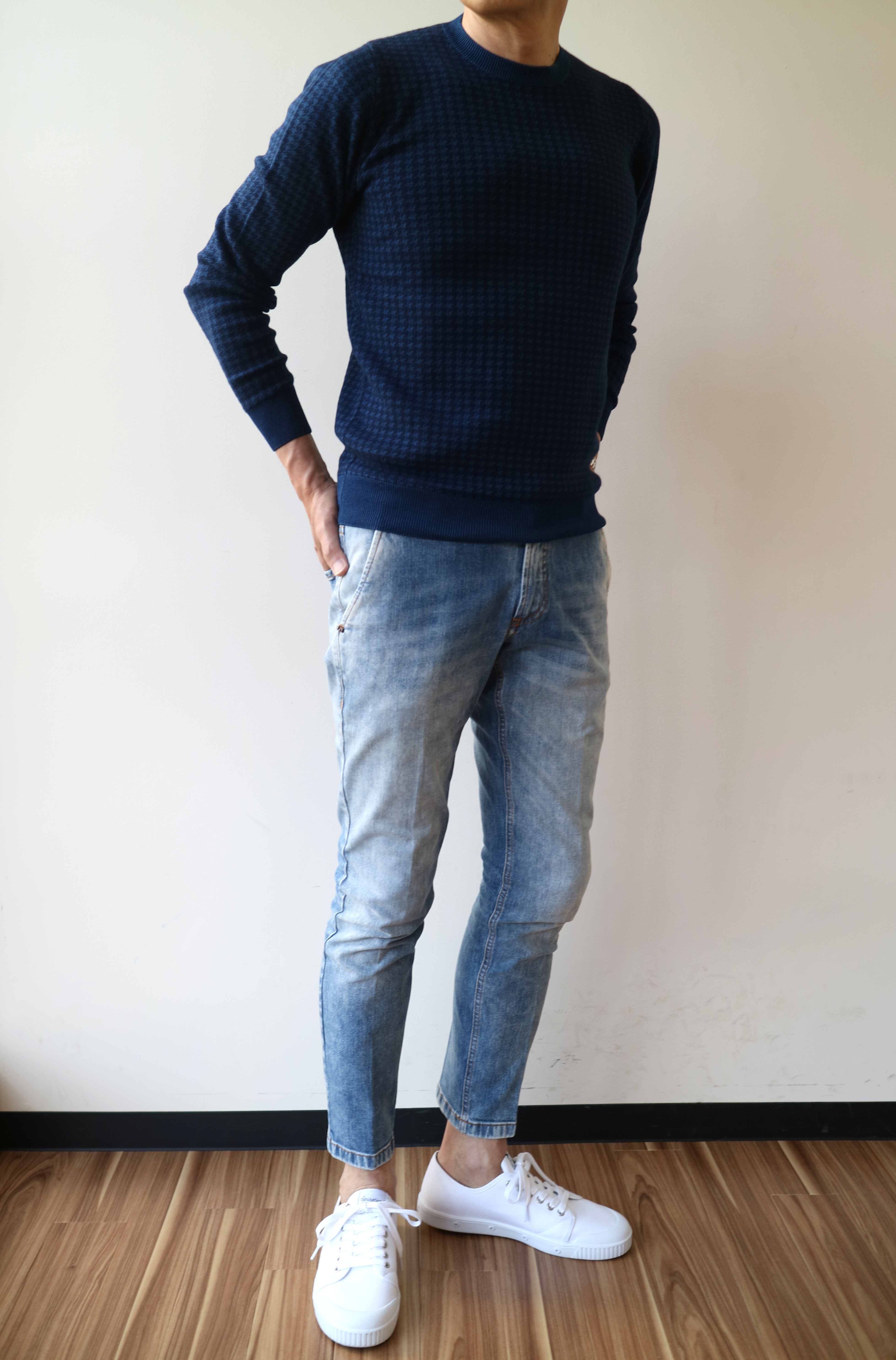 展示会で、ときめいてしまった【PANICALE/パニカーレ】。ニット好きな私ですが、既に多くのニットブランドが...。これ以上は展開できない、そう思っていた矢先に、蔵庫/マガジーノのオープンが決まりました。バイニングは、当然の成り行きです。選んだのはインディゴカラーのハウンドトゥース柄。マスヤマがコーディネートしたように、やはり、デニムに合わせてしまいますね。