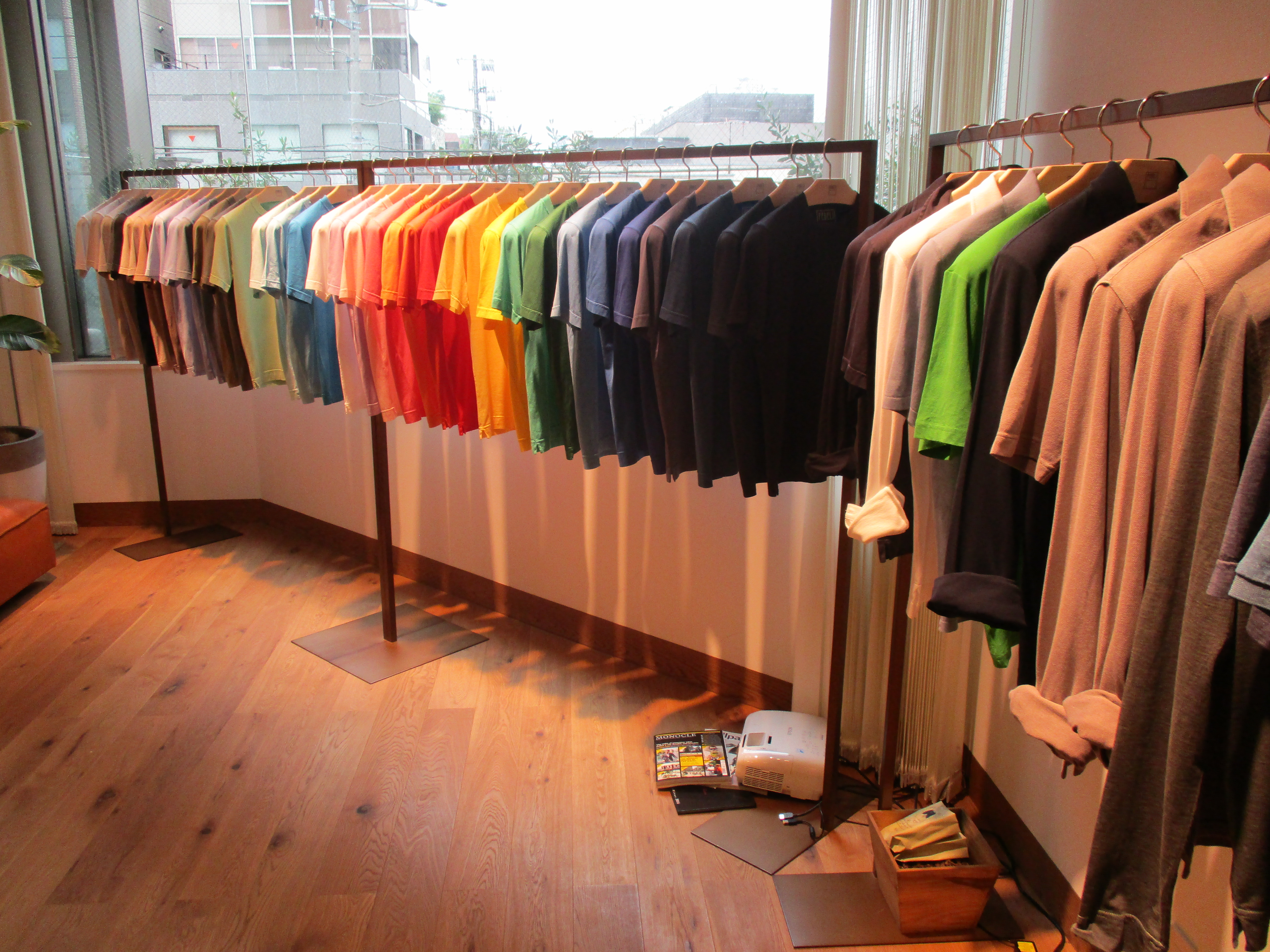 何色、あるのでしょうか? ショートスリーブのラウンドネックTシャツで作られた色見本。日本人には難しい色も多くあり、選ぶことができたのは、