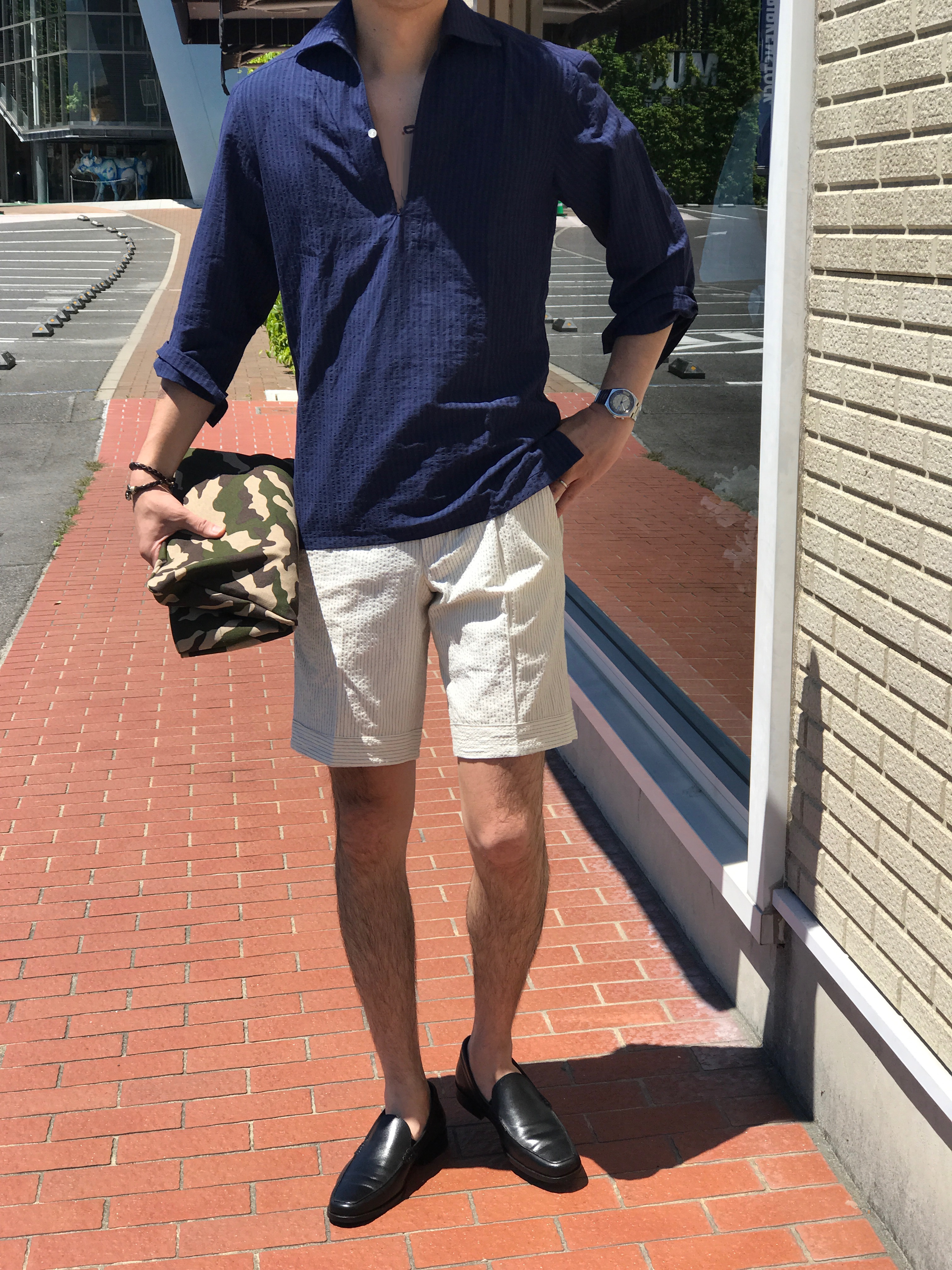 夏のネイビーリネンは、顔つきや体つきを精悍に見せてくれる鉄板シャツです。ショーツを合わせたリラックスしたコーデにも、どこか色気を感じさせるオトコっぽさがあります。