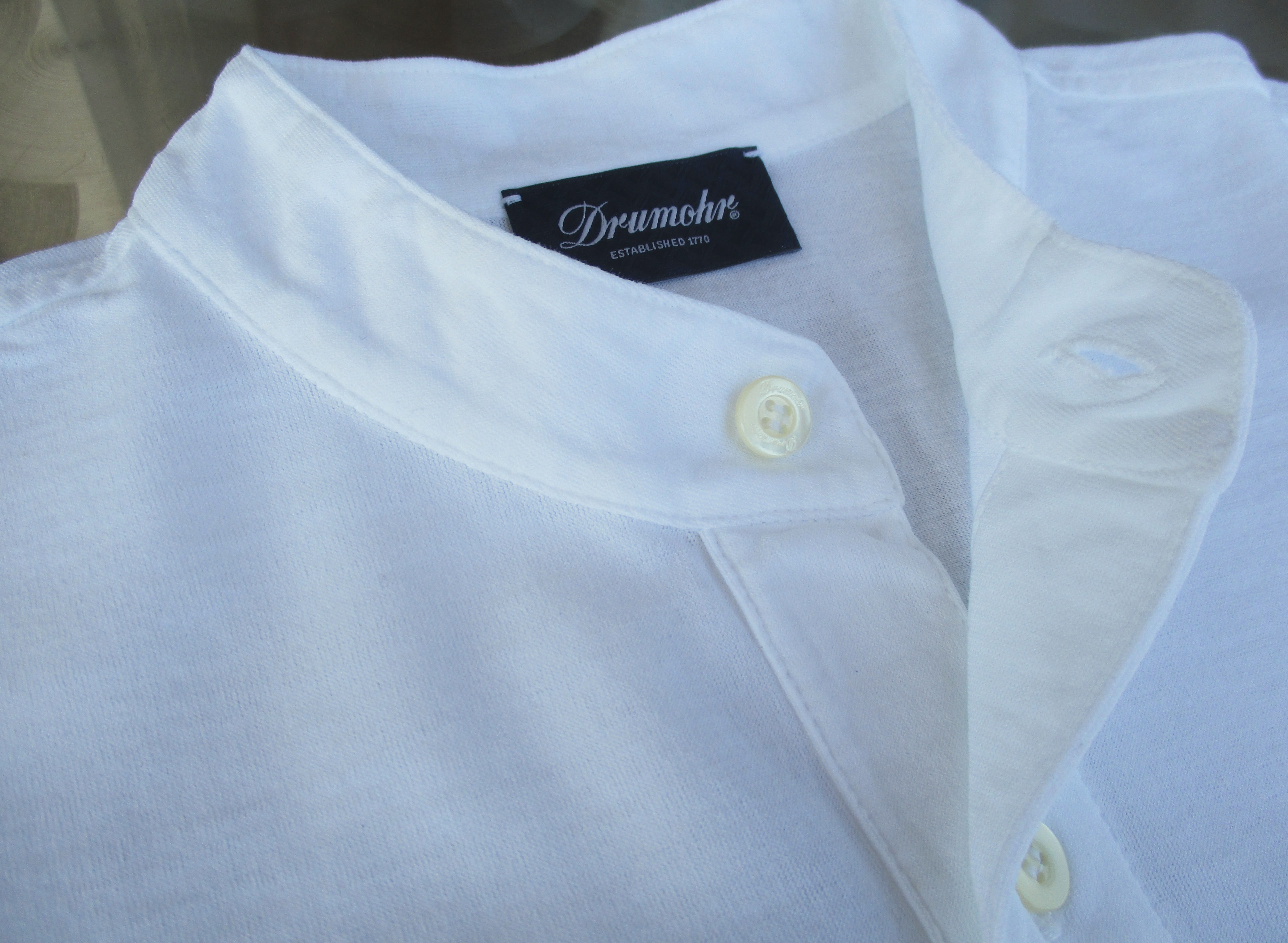 インナーに着ていたカットソーは、同じ【Drumohr/ドルモア】のバンドカラー。さすがにゴールデンウィーク前半、嬉しいことに朝から予約も入り、撮影時間を見つけることが出来ませんでした。ホワイトのみの着用写真になりますが、お許しください。