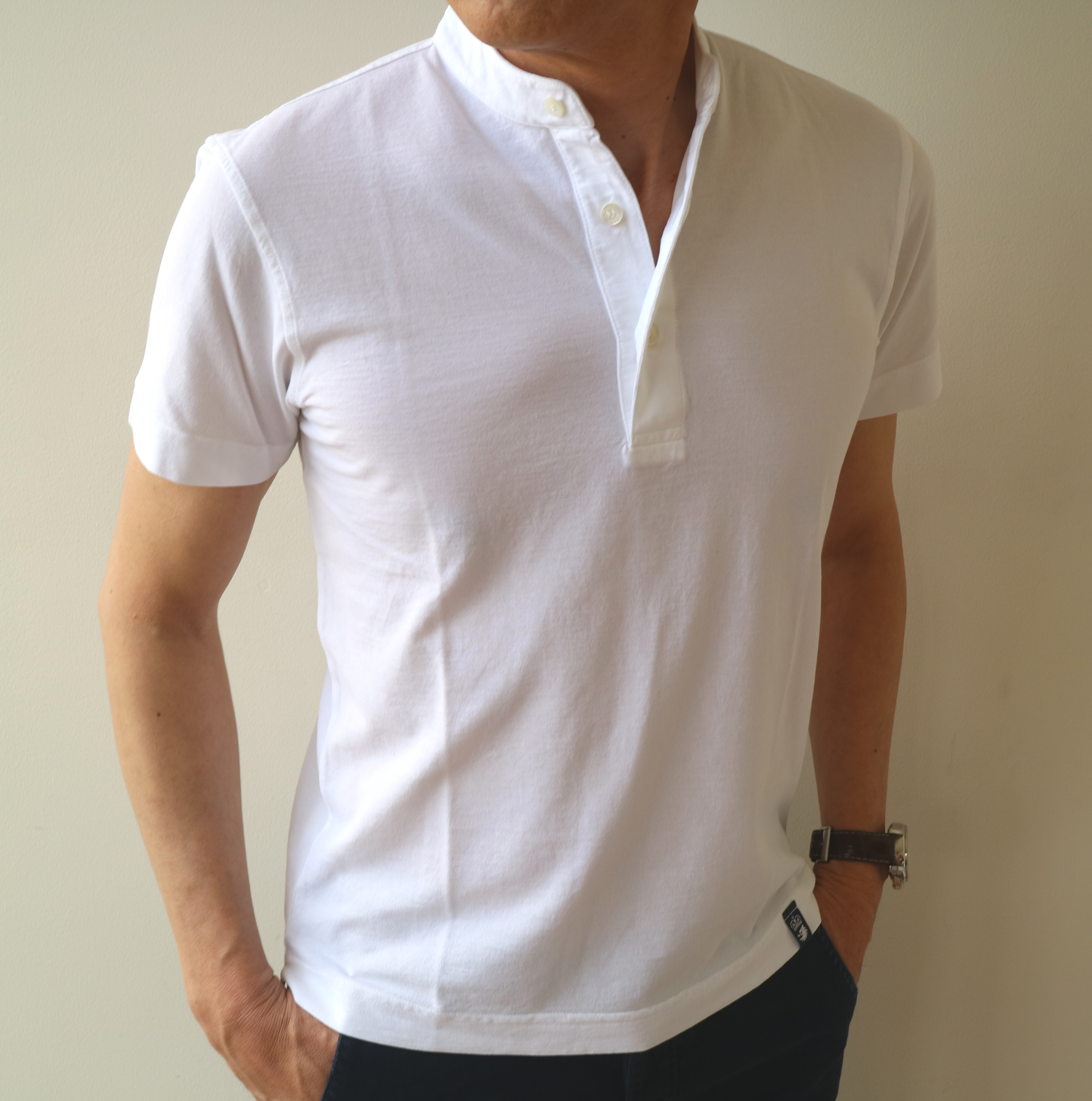 襟付きでは堅苦しい、ヘンリーネックではラフ過ぎる、そんな丁度良い"こなれ感"が魅力のバンドカラー。シャツでは良く見かける襟ですが、半袖のカットソーともなると、意外に少ないデザインかもしれません。締める釦の数によっても雰囲気は変わります。アイスコットンのドライな肌触りは、夏のインナーとして大活躍するはず。クルーネック、Vネック、ヘンリーネック...次はバンドカラーを揃えてみてください。![]()