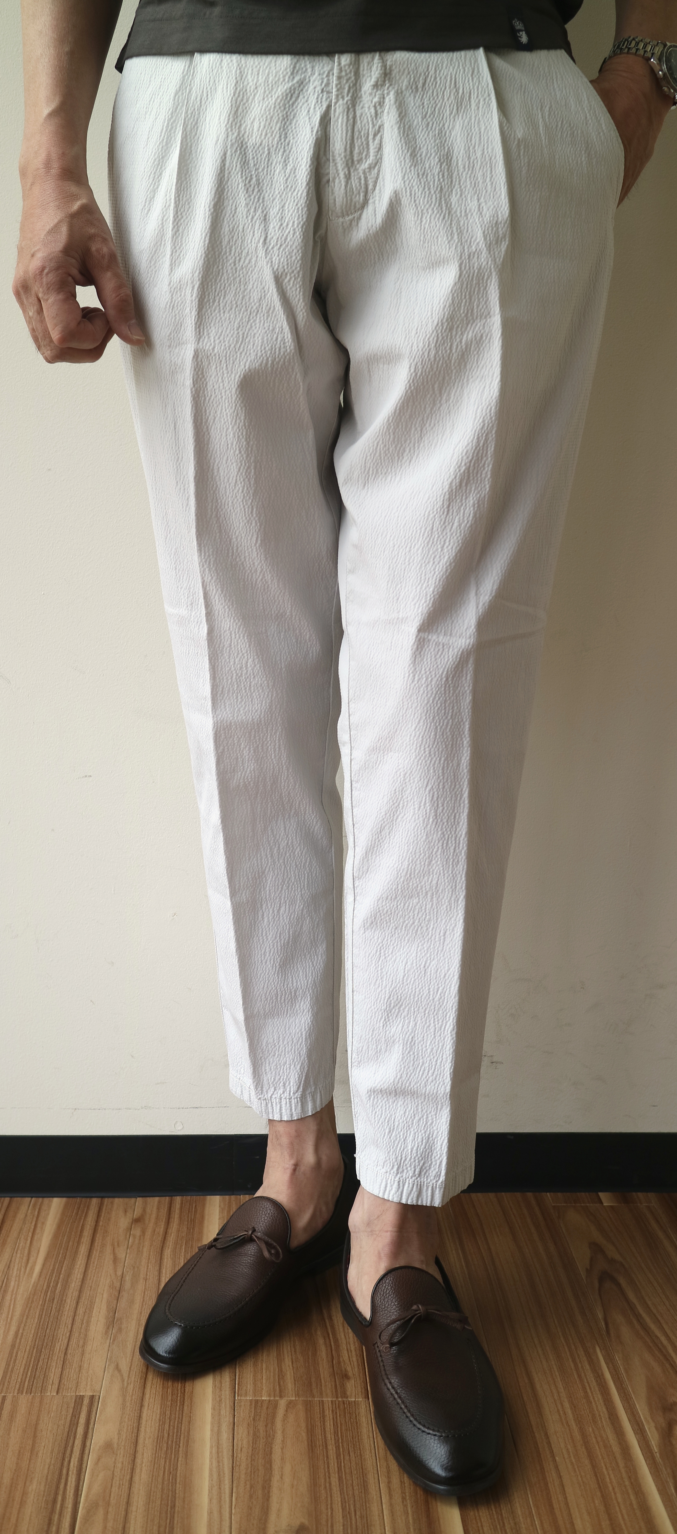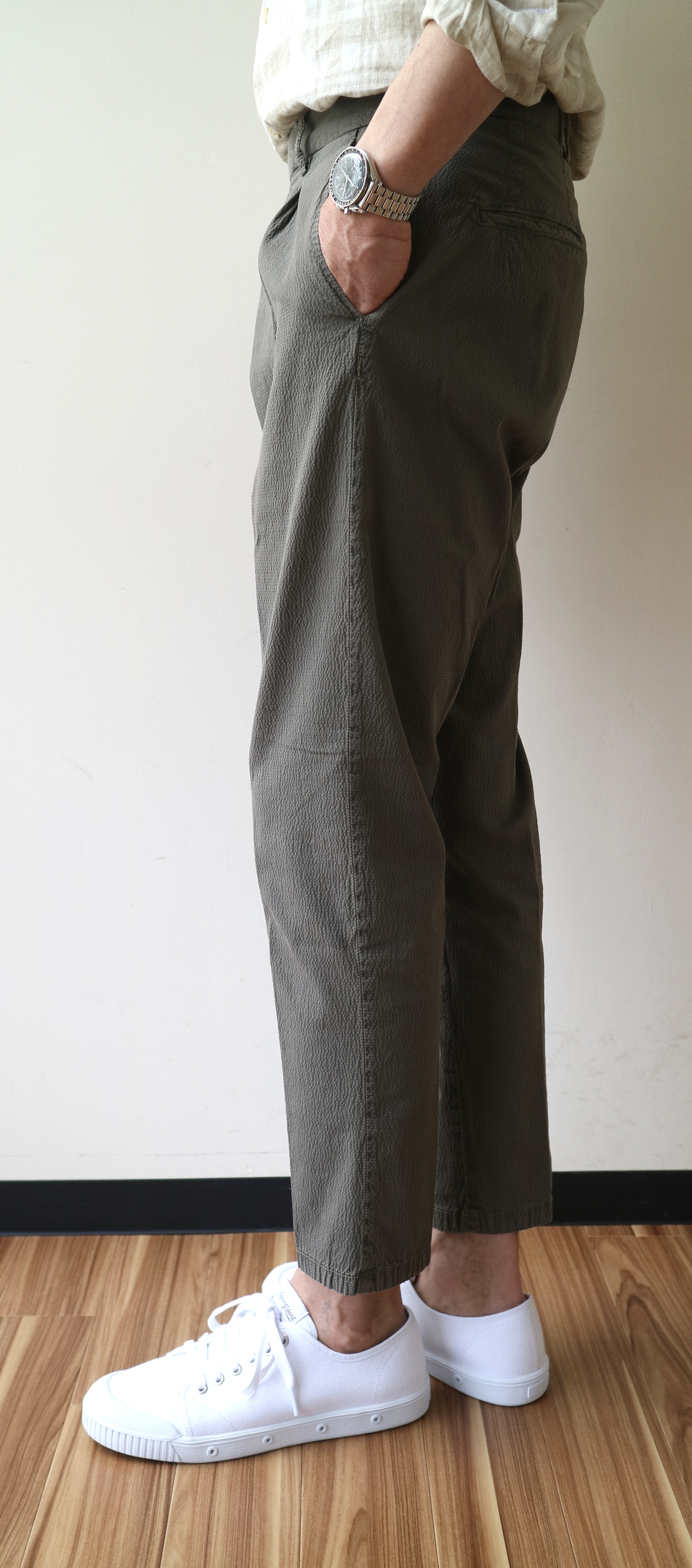 ストレッチコットンのドライな肌触り。凹凸感のあるクレープ地は、肌への接地面積を少なくし、吸汗、速乾、涼感に優れた生地です。さらに、涼感を高めているのが、日本の「お酒」に由来するモデル「SAKE」。フロント1プリーツの腰回りゆったりなテーパードシルエット。気温と湿度が高い日本の気候に合わせた、快適パンツと言えるでしょう。