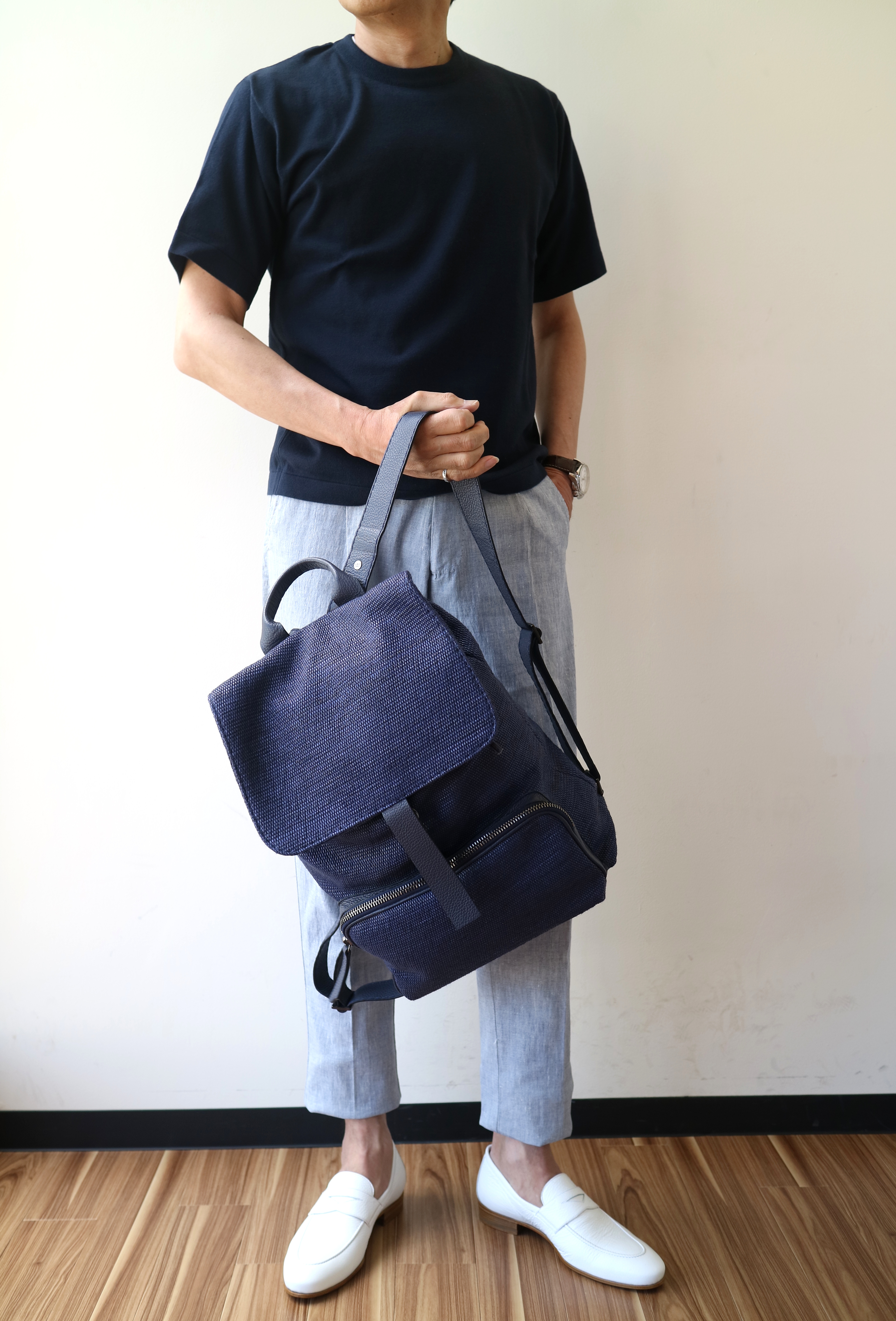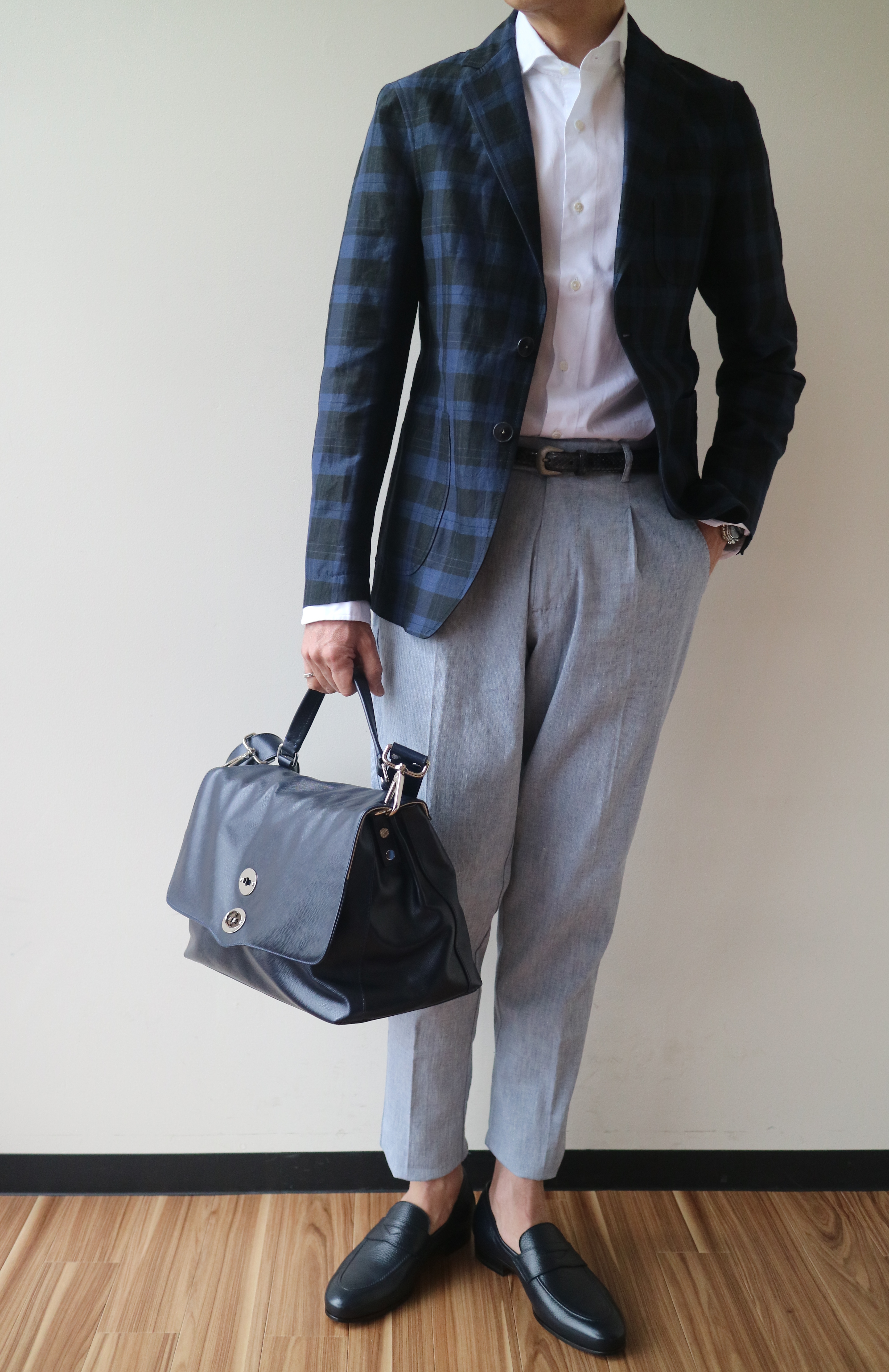 合わせたジャケットはTAGLIATORE、カットソーは未公開のDrumohr、パンツはCare Label(マガジーノ)、靴はSpring Court、バッグはZANELLATTOです。