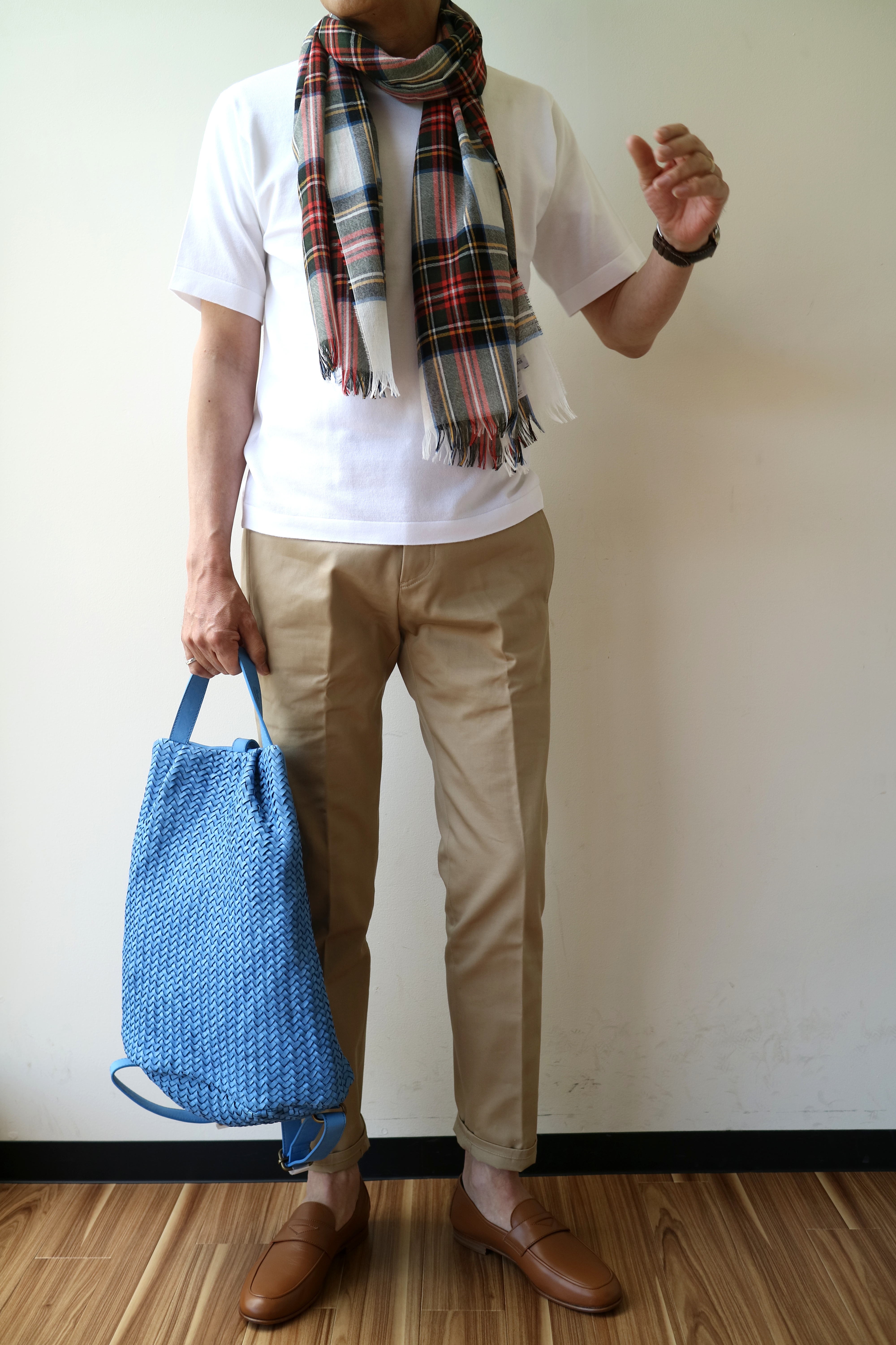 ホワイトで合わせたパンツはPT01、ストールはJOHNSTONS、靴はFERRANTE、バッグはTIBERIO FERRETTI。ネイビーで合わせたパンツは昨日ご案内のBERWICH、靴はFERRANTE、バッグはZANELLATTOです。