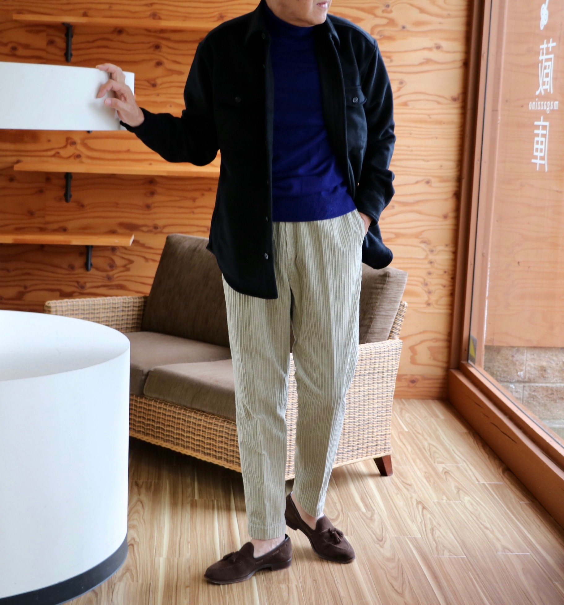 現在、カシェートで展開中のサンプルフェア。綺麗なニットを見つけ、コーディネートです。monção/モンサオのシャツジャケットに合わせて穿いたパンツは、