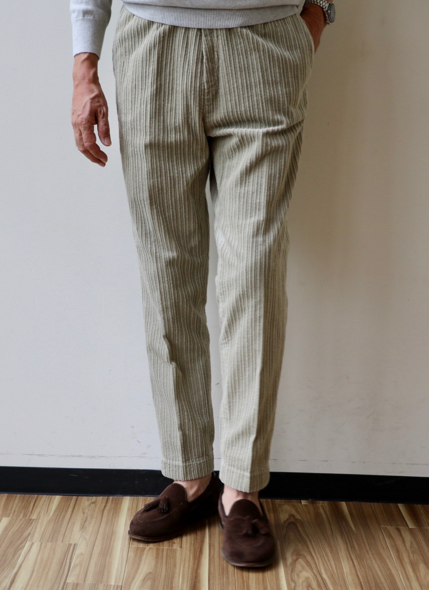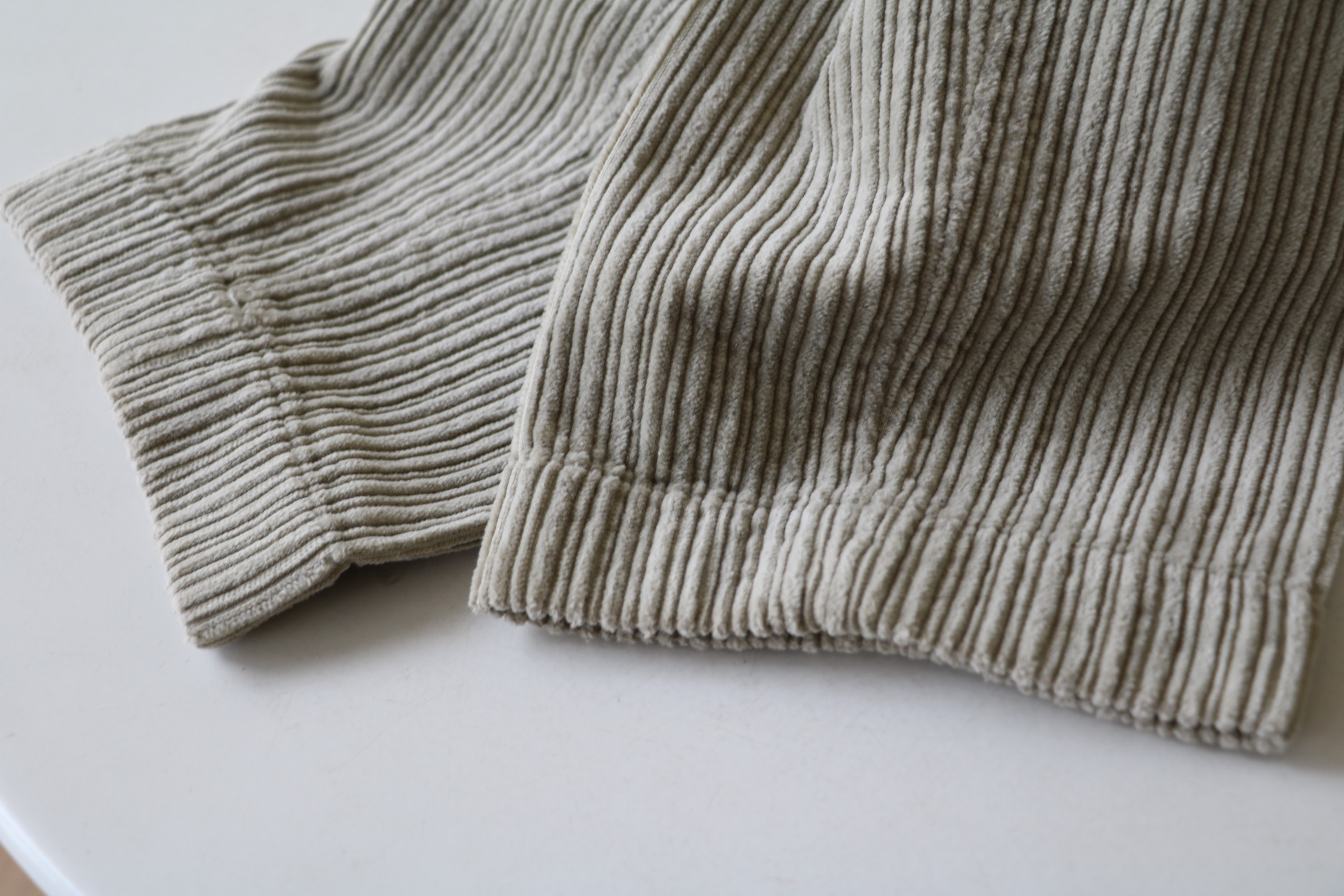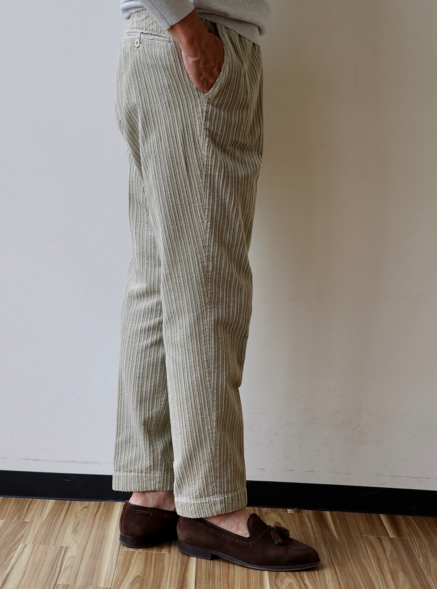 コーデュロイの中で最も表情豊かな親子コール。柔らかなエクルベージュでセレクトです。この夏でも展開の多かった股上深めのドローコード付きシャーリングモデル「CHAD2」に乗せてみました。