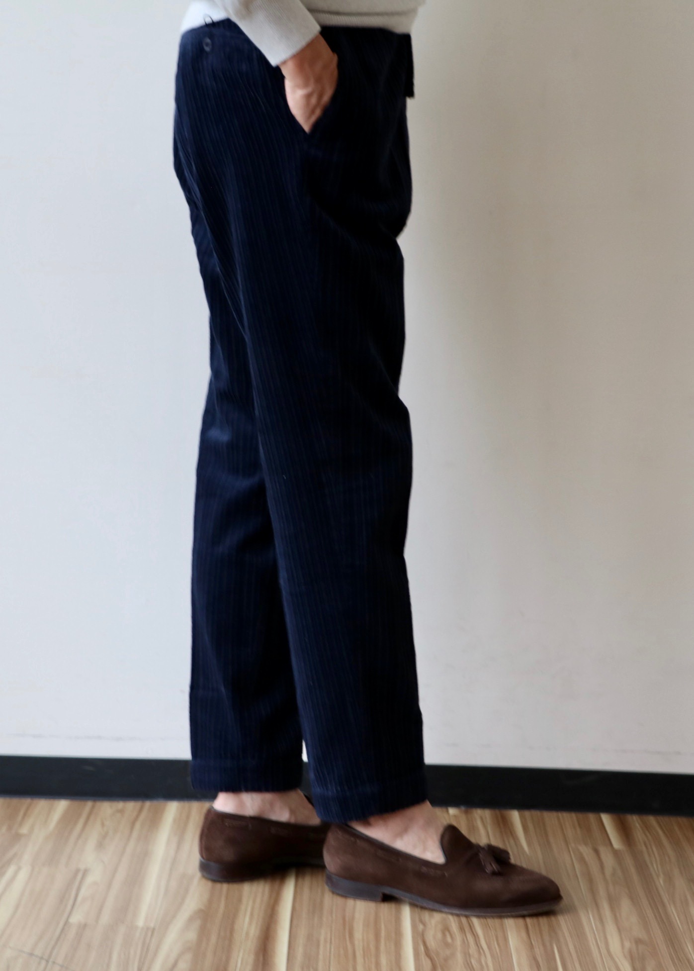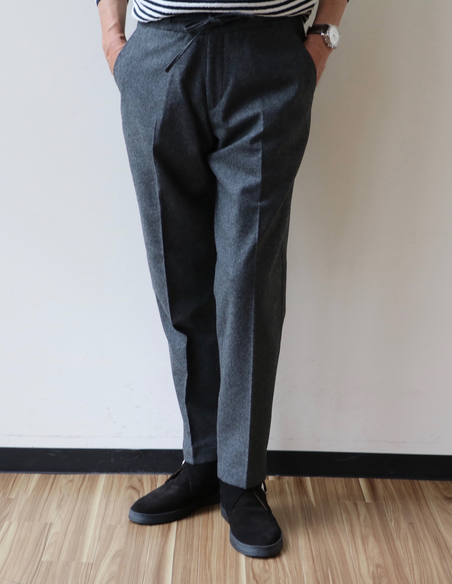 ノープリーツのすっきりしたフロント。程よくワタリにゆとりを持ったテーパードシルエットです。足元をブラックスェードのタッセル(DOUCAL'S)で合わせることにより、より大人の苦味のある表情に。甘いのがお好きなら、同系色のブラウン系をお選びください。