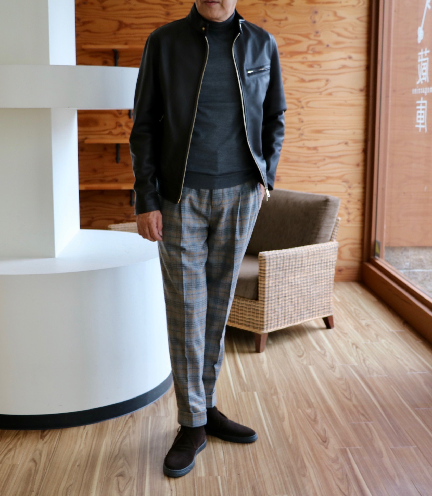 SILENCE(サイレンス)のシングルライダース をご紹介させていただいた際に穿いていたパンツを思い出してください。レザーの表情を引き立てたのが、チェック柄のパンツです。