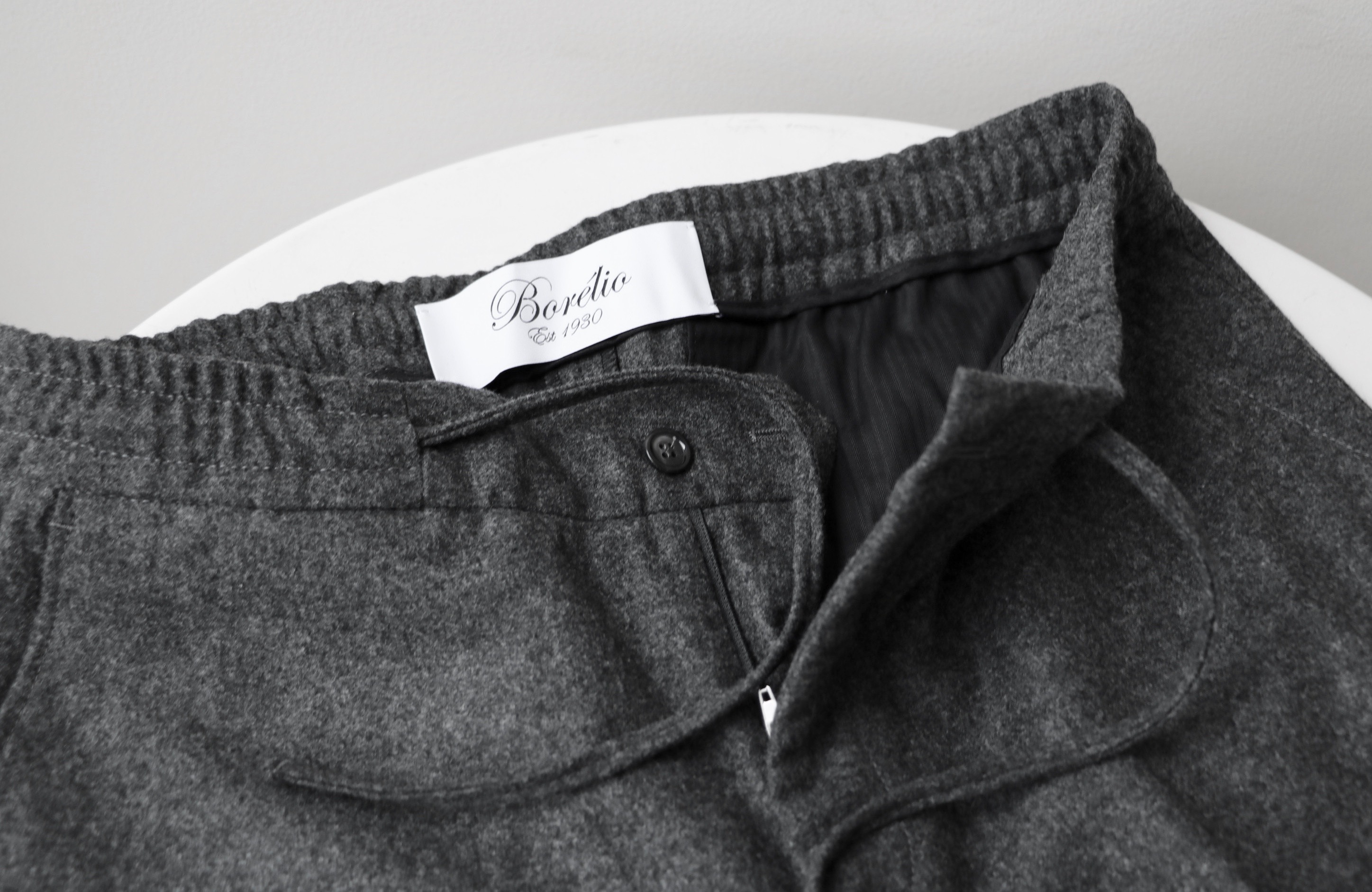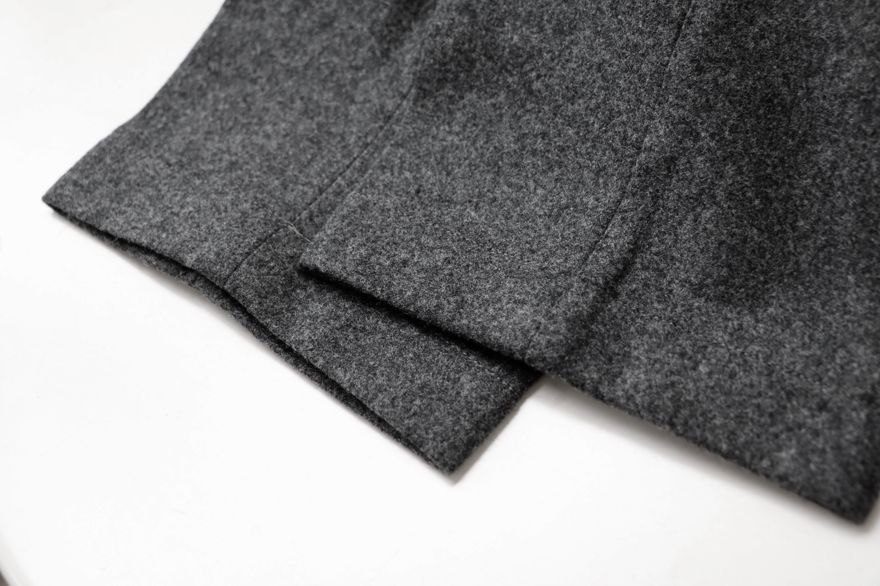 ローデンクロスのウール地は、華奢ではありません。ドレス仕様ではなく、ラフにがんがんと穿いていただける打ち込みのしっかりしたタフな生地です。そんなこと書くと、ウールメルトンのように硬いの?と言われるかもしれませんが、そんなことはありません。あくまでも、しなやかでエレガントなフランネルタッチ。さりげなくラグジュアリーなイージーパンツです。