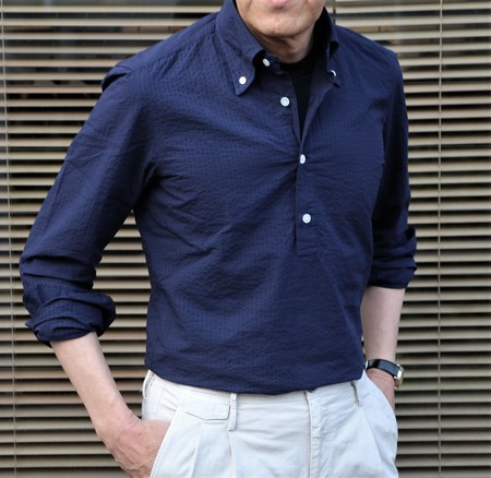 終了間近となった、この夏のセール。店頭でもオススメしているのが、「MBD」シアサッカーB.D.プルオーバーシャツ。ホワイトは完売しておりますが、本命のネイビーのサイズ 38と41がご用意できます。凹凸感のあるシアサッカーは、夏の素材として様々なアイテムに使われています。実は、本日、私が穿いているパンツもシアサッカーです。ただシャツに使うとなると、肌に近い部分、やや硬さを感じてしまう方も。でも大丈夫。この【Maria Santangelo/マリア・サンタンジェロ】で使われているシアサッカーは、ライトな生地感で肌への当たりも優しいのです。よろしければ、ご検討ください。