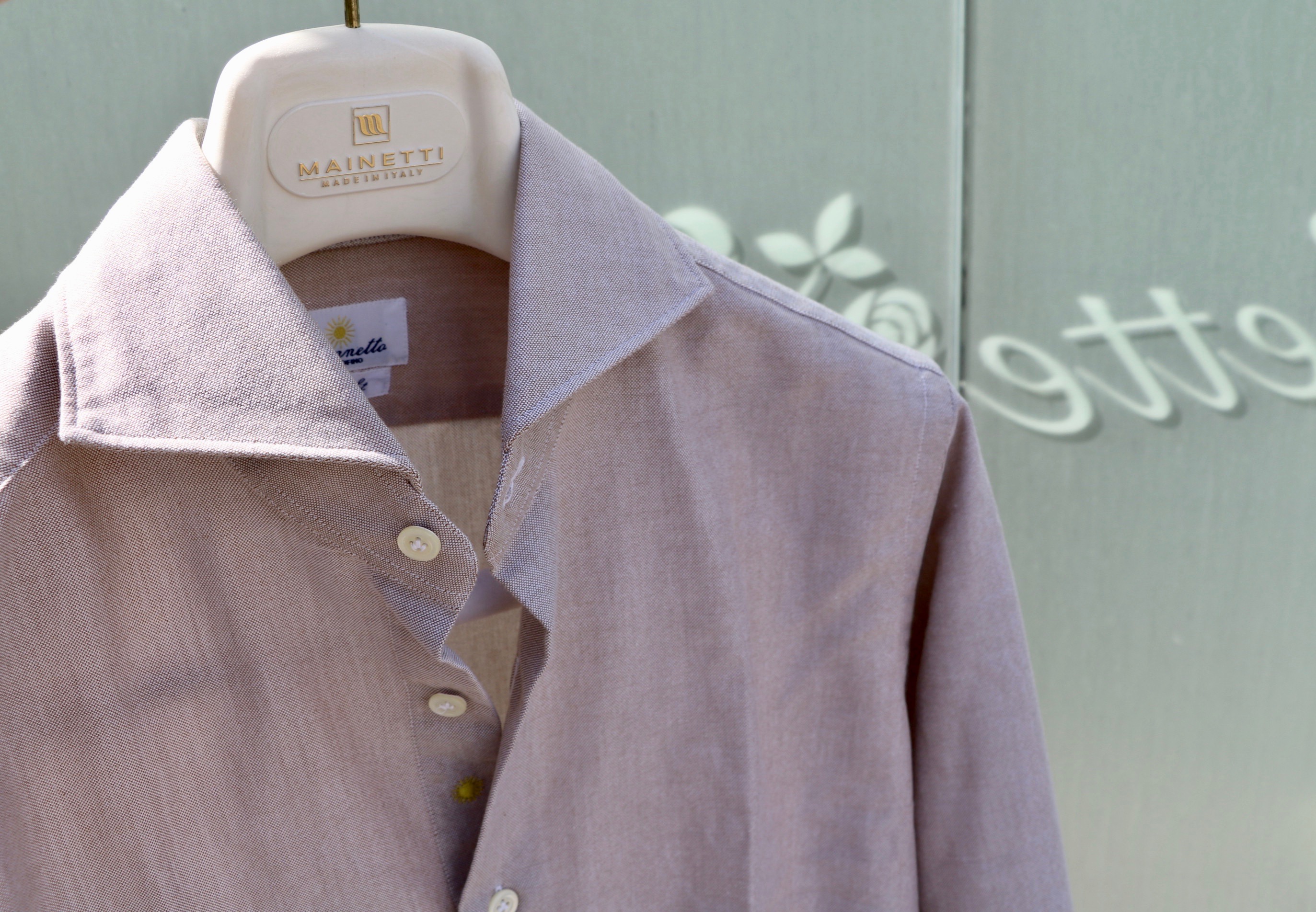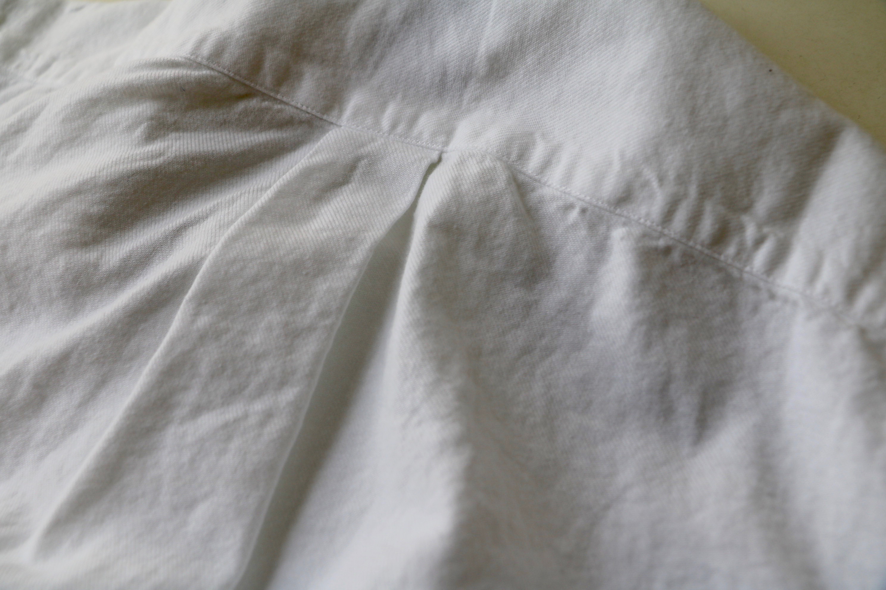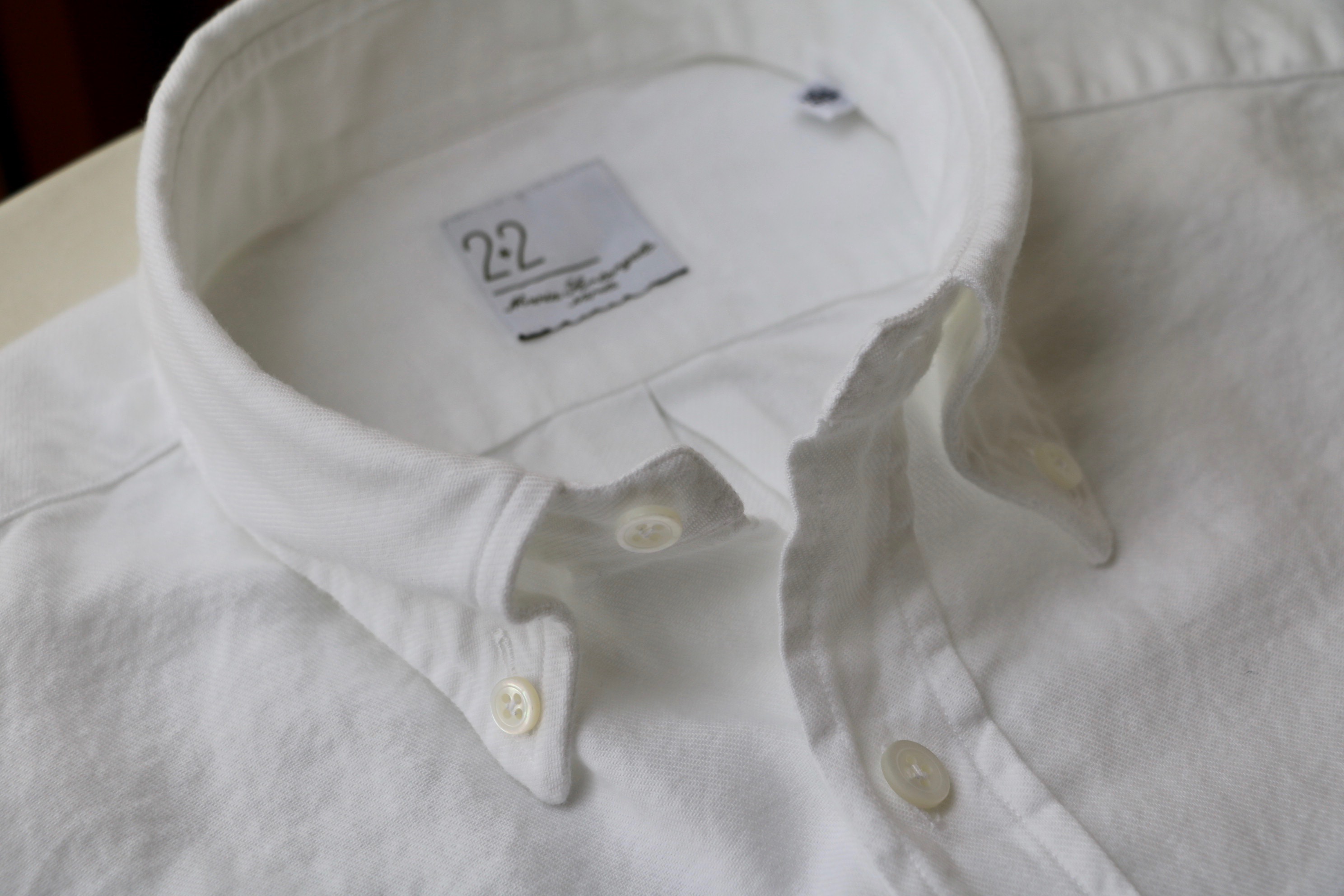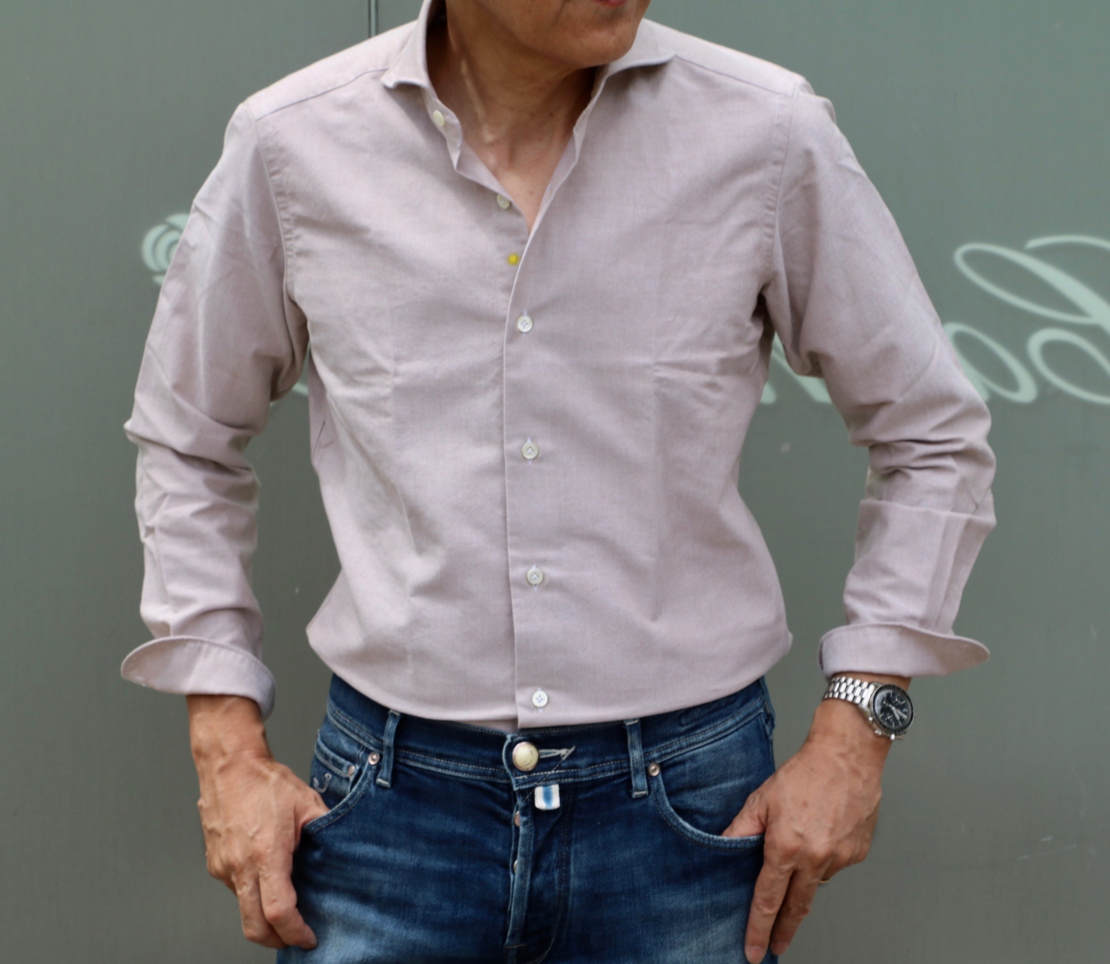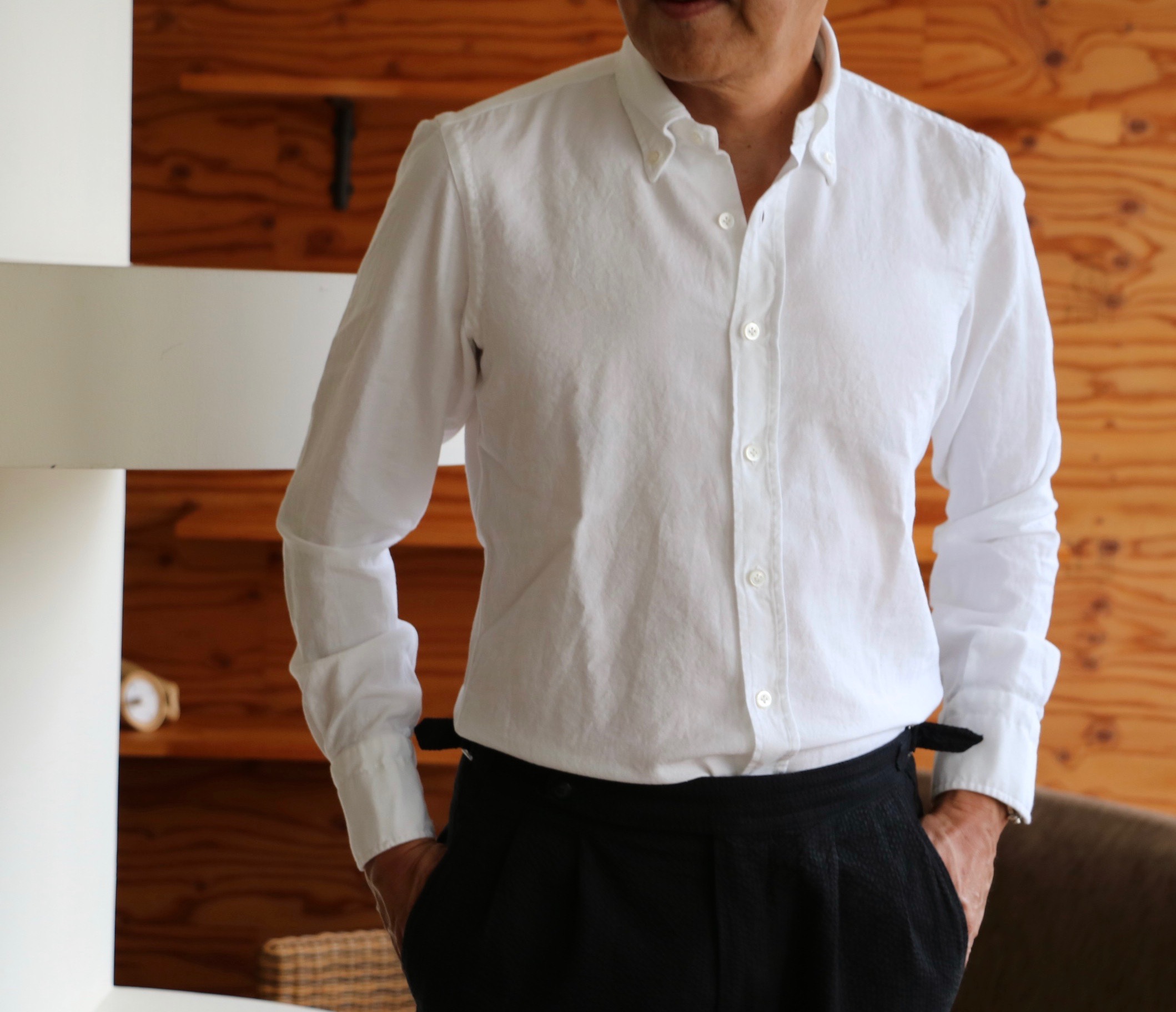 秋冬の新作として、まずお勧めするのは、ソフトネル地のB.Dシャツ。まるで雪見だいふくのような、バニラ風味の柔らかさです。アメリカンコーヒーに合うように、襟型もアメリカンタイプのボタンダウンをセレクト。上のシアサッカーで選んでいるボタンダウンと比較していただくとお分かりただけるはずです。襟型に合わせ、フロントも前立て仕様、背もボックスプリーツにと、着心地はナポリタン、気分はアメリカンになります。