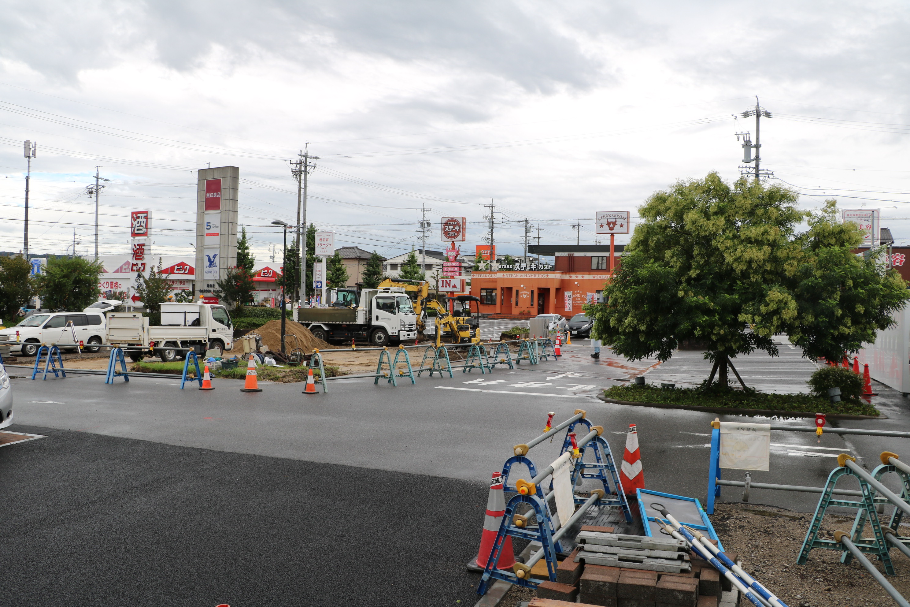 そして、オープンに合わせて駐車場の舗装整備がなされています。お盆前にはグローリーガイ専用駐車場としている店舗裏側は既に工事が終わっており、現在、道路側駐車場の整備に入っております。しばらくの間、台数が減ることに寄る土日の混雑が予想されます。