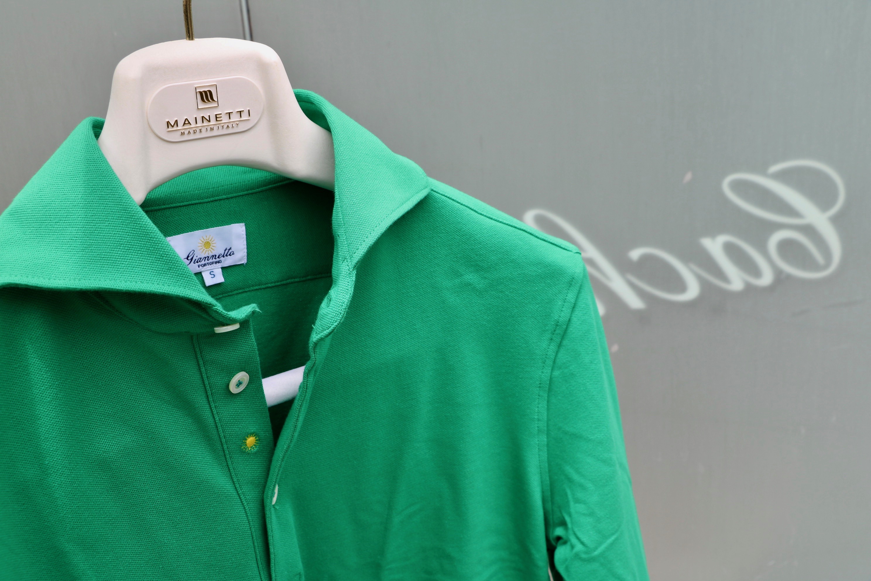 シャツでも布帛ではなく、カットソーのポロシャツです。入荷の検品をしていると、眩しい色合いが飛び込んできました。提案カラーのエメラルドグリーンです。この夏、LACOSTE(ラコステ)の鹿の子ポロを見て、気になっていた色。少し派手かなと思いながらも、ホワイトやネイビー、ブラウン、ブラックなどの定番色だけでは売り場がつまらないと思い切ってセレクトです。スポーティーなポロシャツなら、ゴルフにも使えるし、ジャケットやニット、アウターのインには、いい感じのアクセントカラーになってくれそうです。