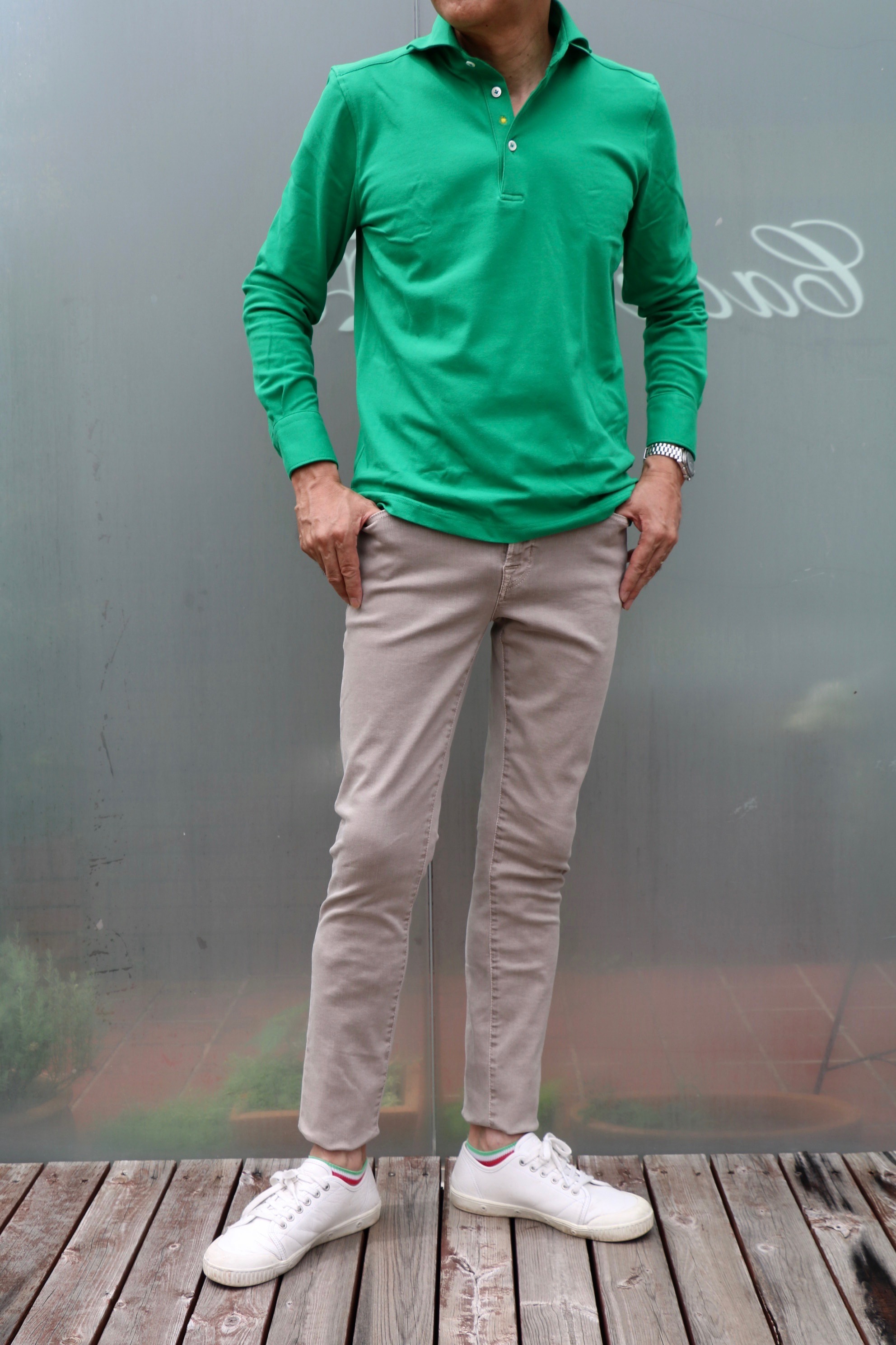 「鹿の子織りロングスリーブポロシャツ」同様、合わせているパンツは、TRAMAROSSA(トラマロッサ)。バランスのとりやすい、相性の良いボトムです。チラリと見えるADRIAN(アドリアン)のアンクルソックスを履けば、完璧?かもしれません。