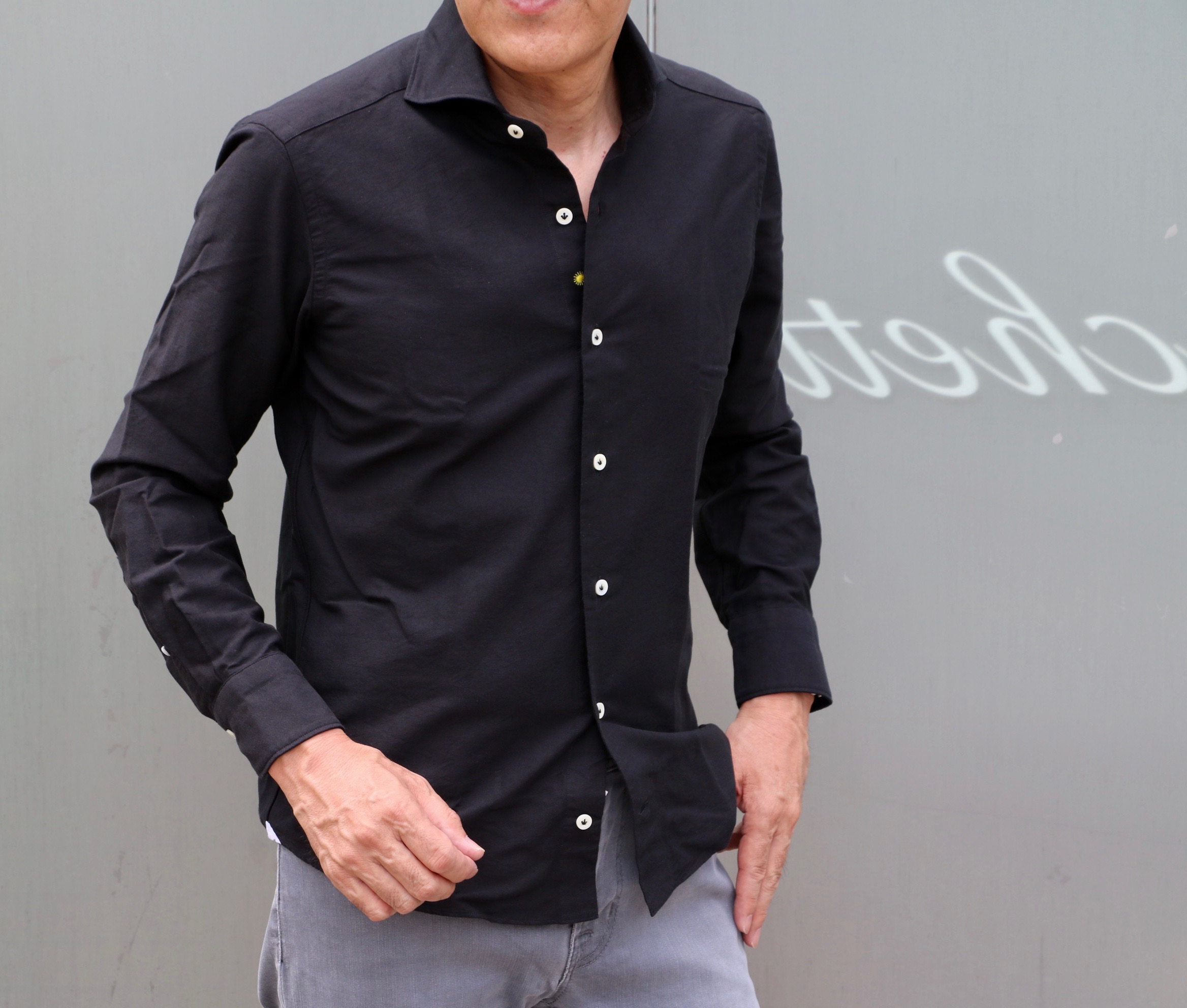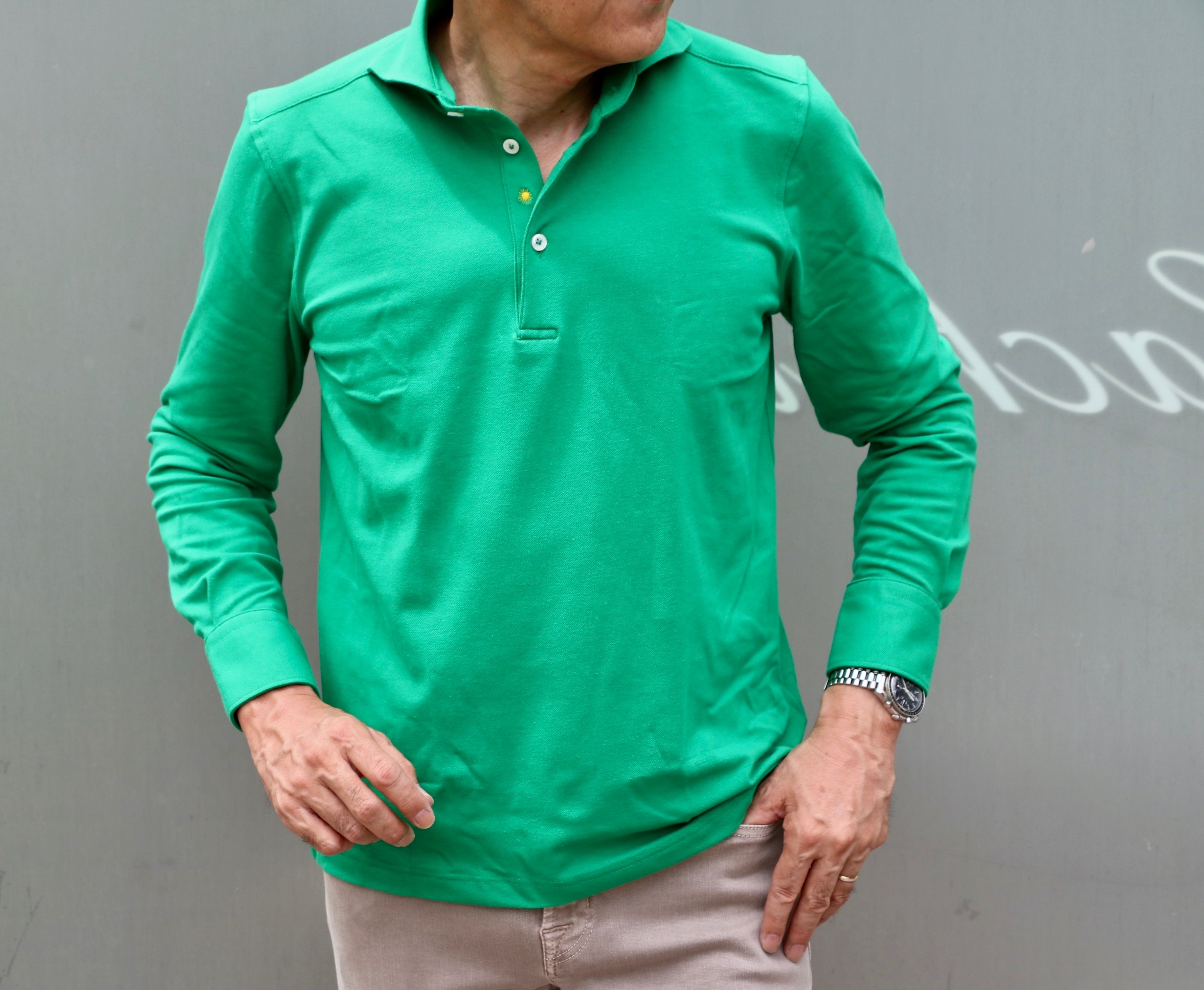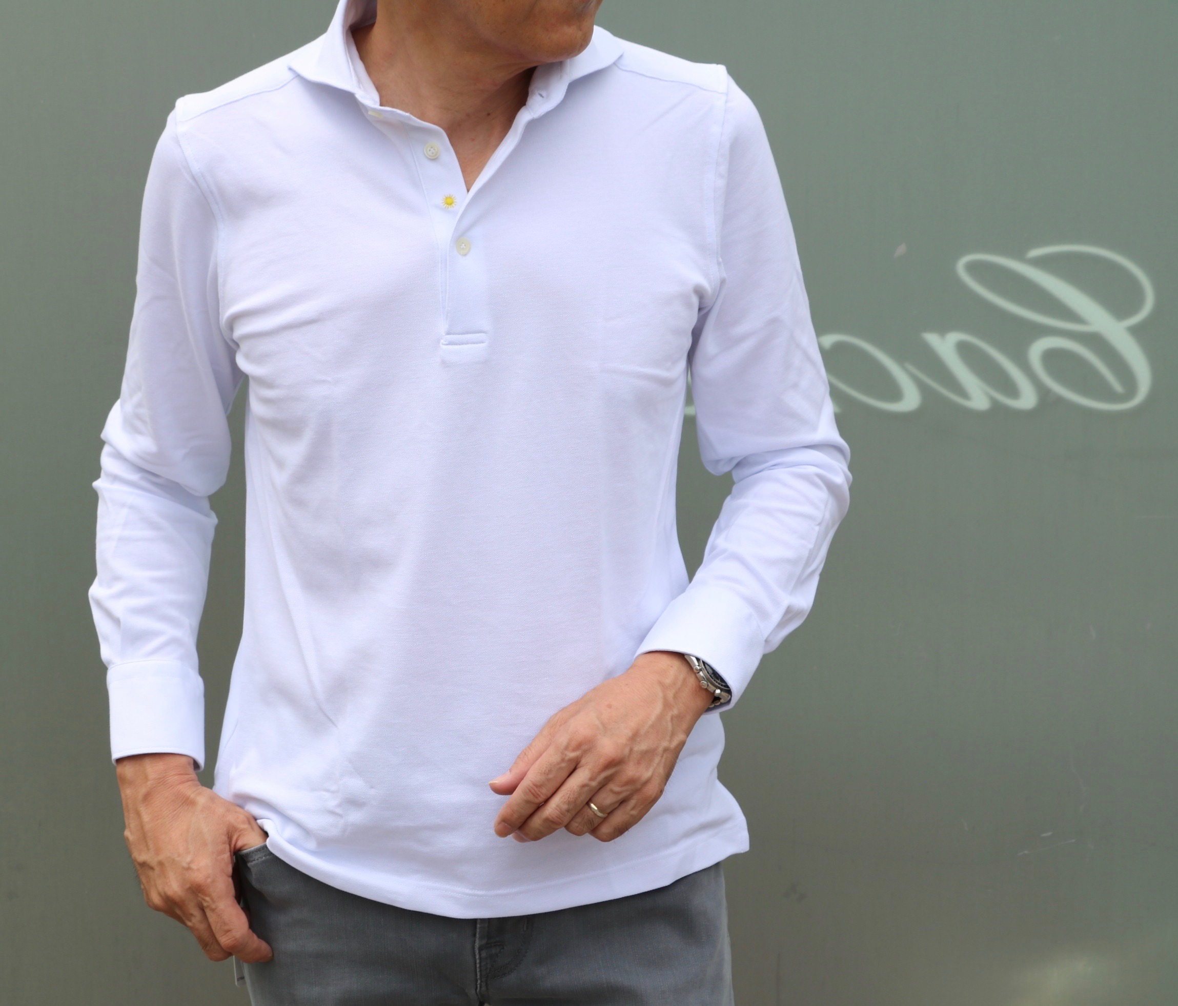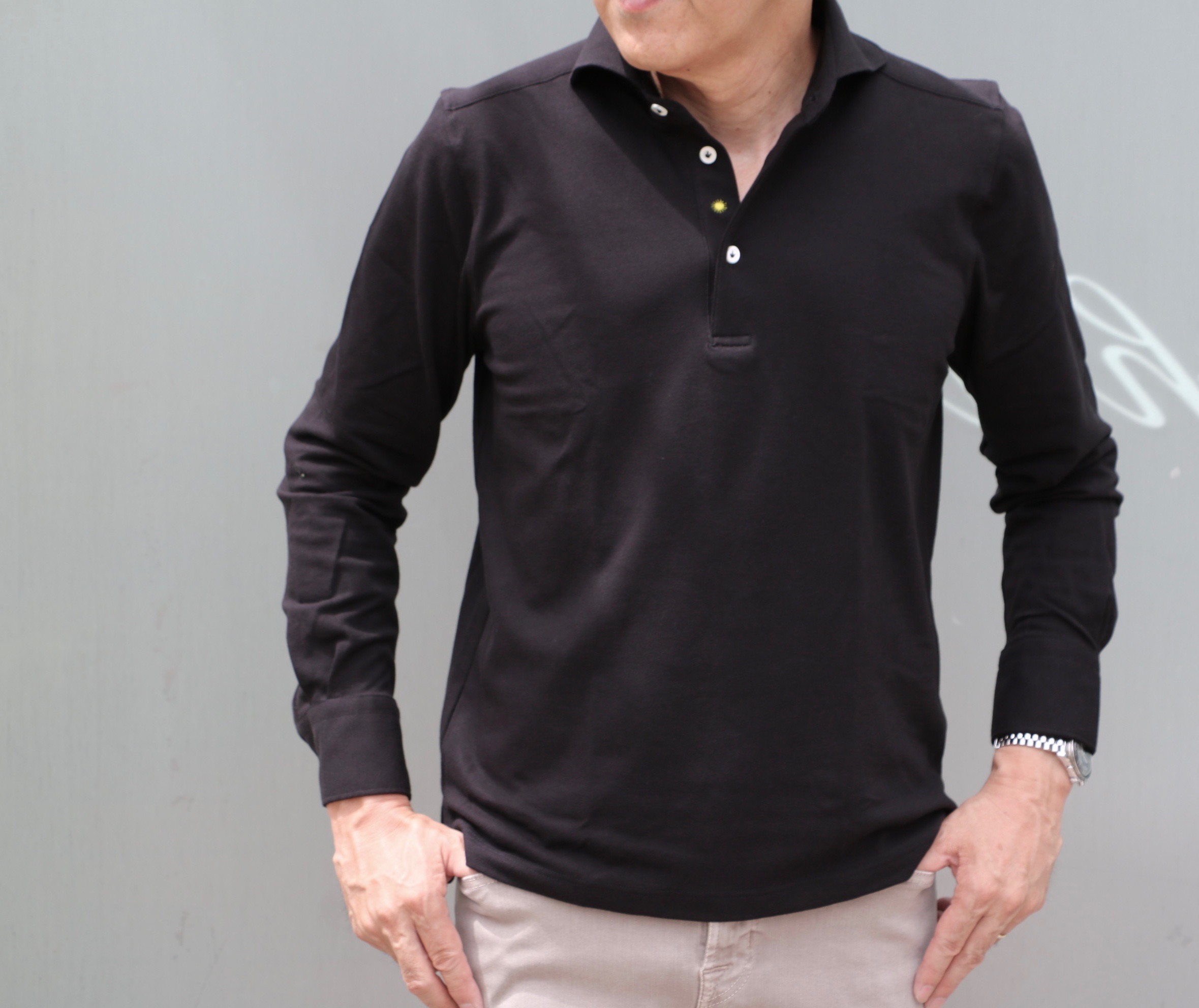 セレクトカラーはエメラルドグリーン、黄味のないクールなスノウホワイト、ブラックの3色。コットンにエラスタン5%のストレッチの効いたロングスリーブのポロシャツは、襟やカフスなどシャツ屋さんならではの端正なドレスポロに仕上がっています。