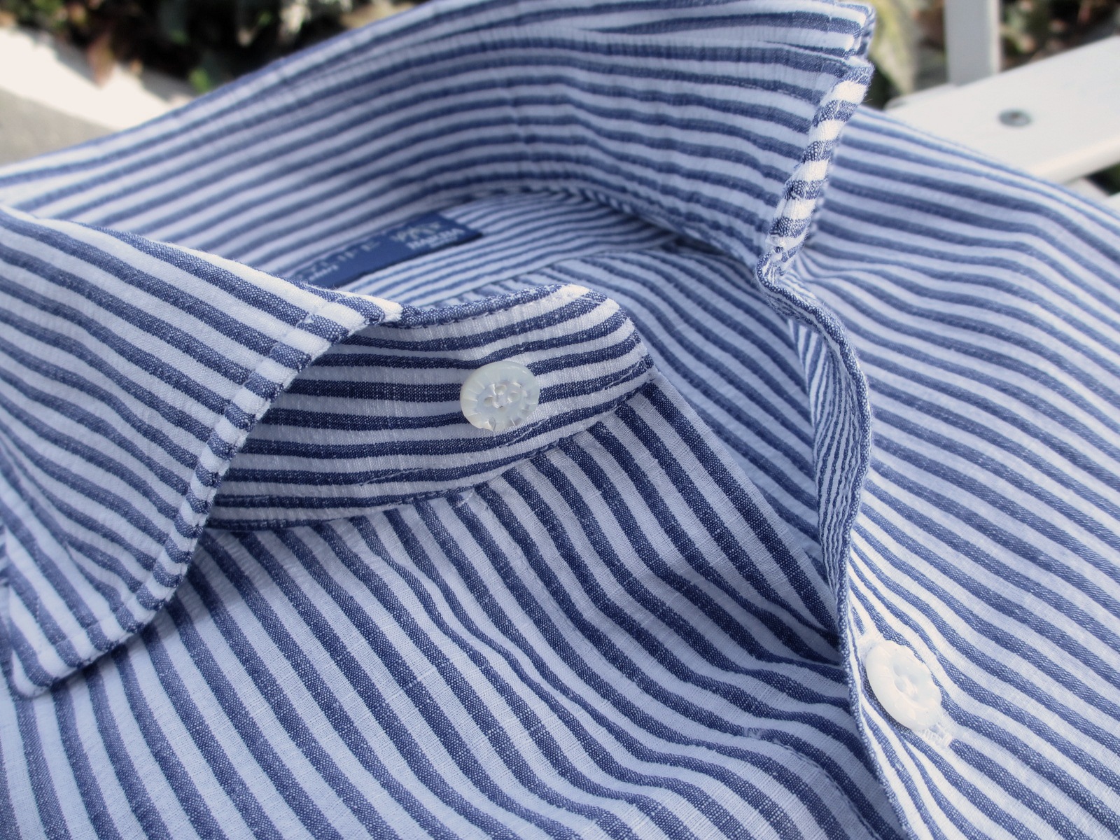 さらに清涼感と軽さを求めるなら、コットン・リネンのストライプ柄はいかがでしょう。ただのストライプでないところも、このシャツの魅力です。目の錯覚?と何度も生地を見つめなおしているのですが、青の濃淡で線が引かれているような...展示会で生地の見過ぎかもしれません。