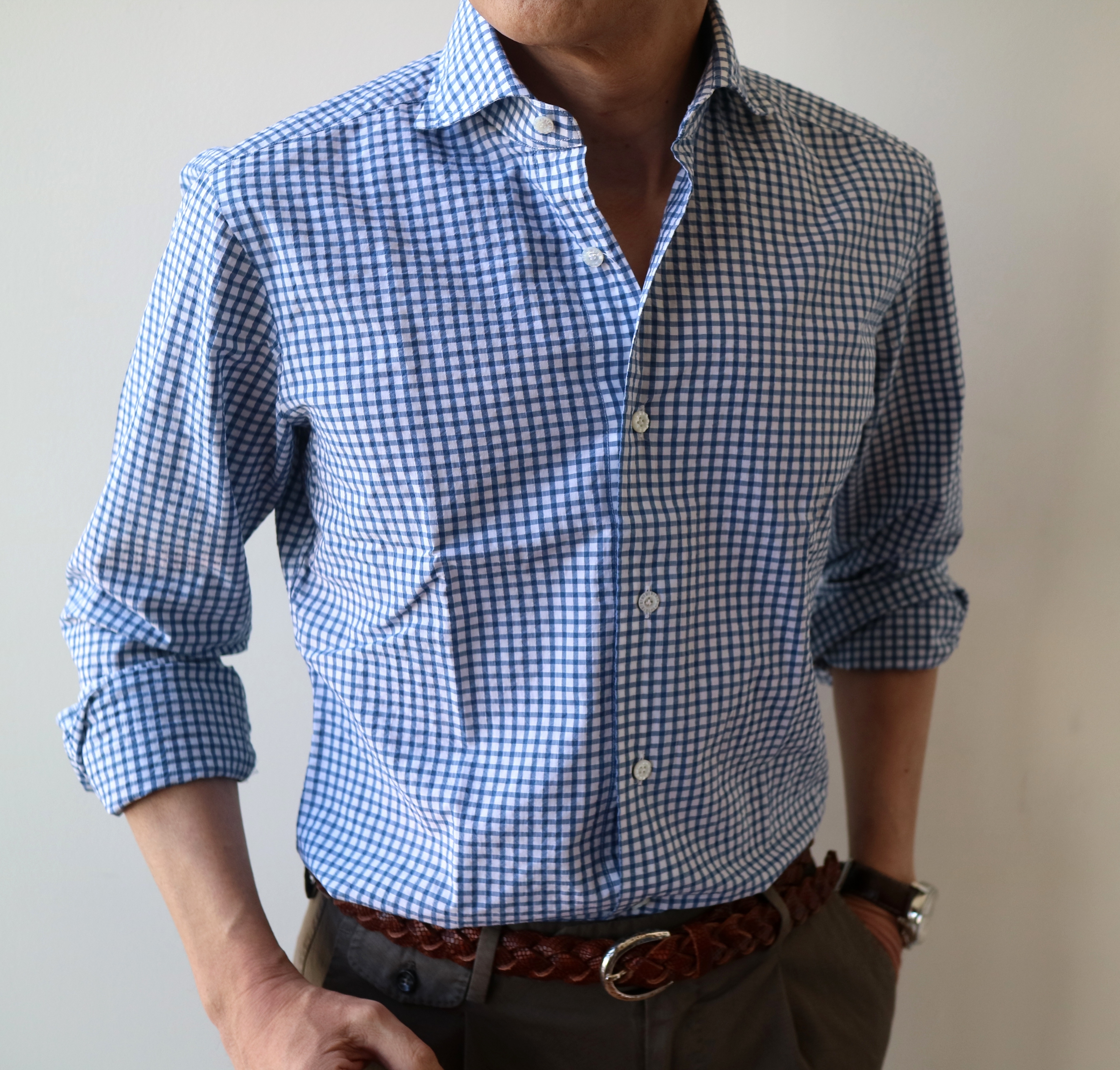 コットン100%のシンプルなチェック柄は、爽やかなネイビーで。ギンガムチェックより白場の多いチェック柄は色気があります。シアサッカーほどのハリや凹凸感はありませんが、しなやかでサラリとした感触です。伸縮性もあり、着やすいシャツに仕上がりました。