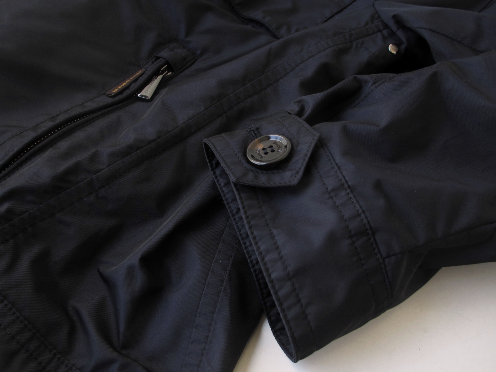フード内蔵の立ち襟ショートブルゾンは、モデル「SANZIO-KM」。「KM」とは素材のことで、ポリエステル100%を表します。ナイロンよりも柔らかくしなやかな感触です。付属品の美しさは、敢えて説明するまでもありません。ショート丈でも、完成度の高い、アッパレなブルゾンです。