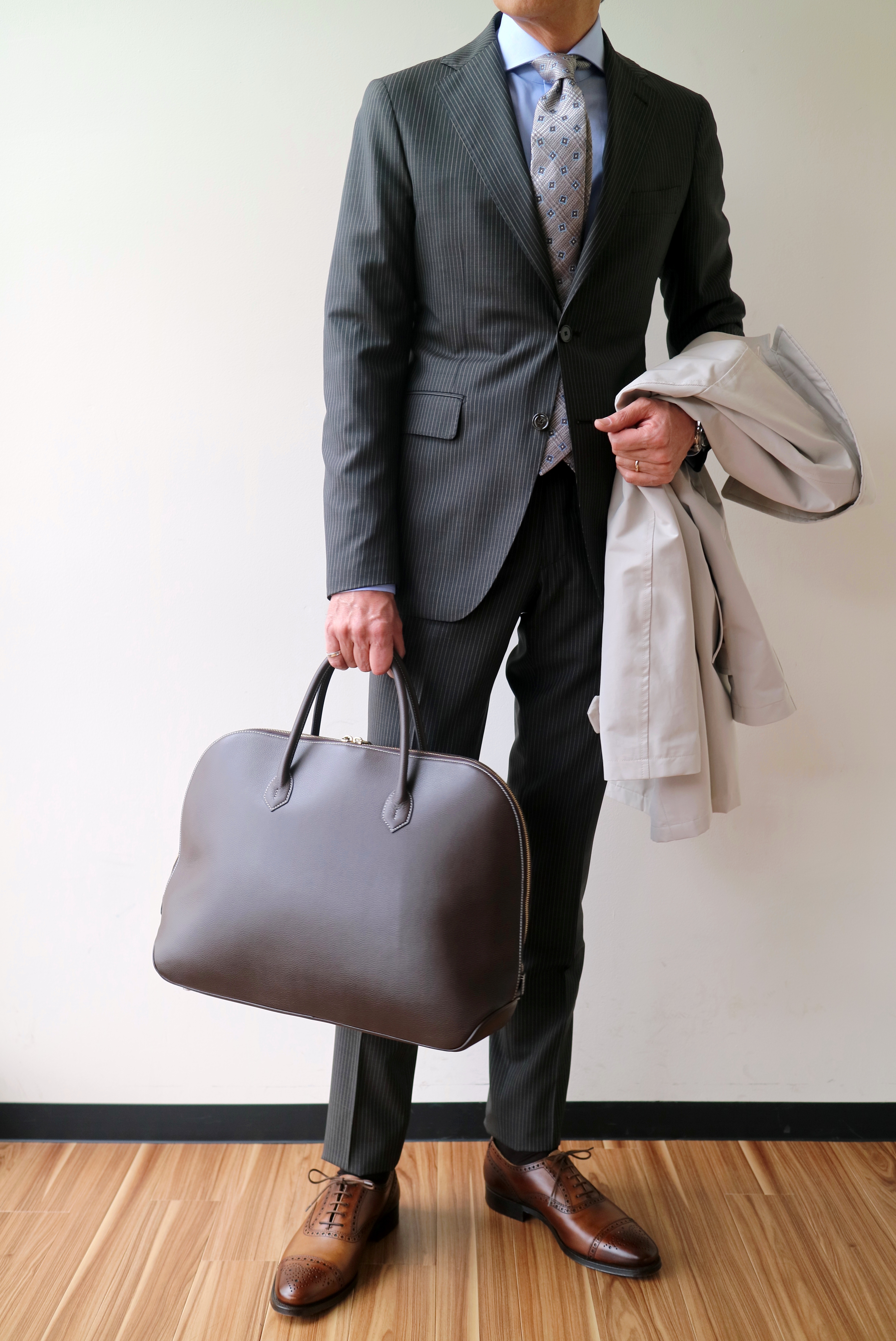 コートは、どちらもMooRER。ネイビースーツで合わせたシャツはBORRIELLO、ネクタイはFRANCO BASSI(未公開)、ベルトはWILLIAM、ソックスはALTO、靴はCROCKETT&JONES(私物)、バッグはCISEI。ブラウンスーツで合わせたシャツはBORRIELLO、ネクタイはFRANCO BASSI(未公開)、ベルトはWIILIAM、ソックスはALTO、靴はCROCKETT&JONES(私物)、バッグはCISEIです。