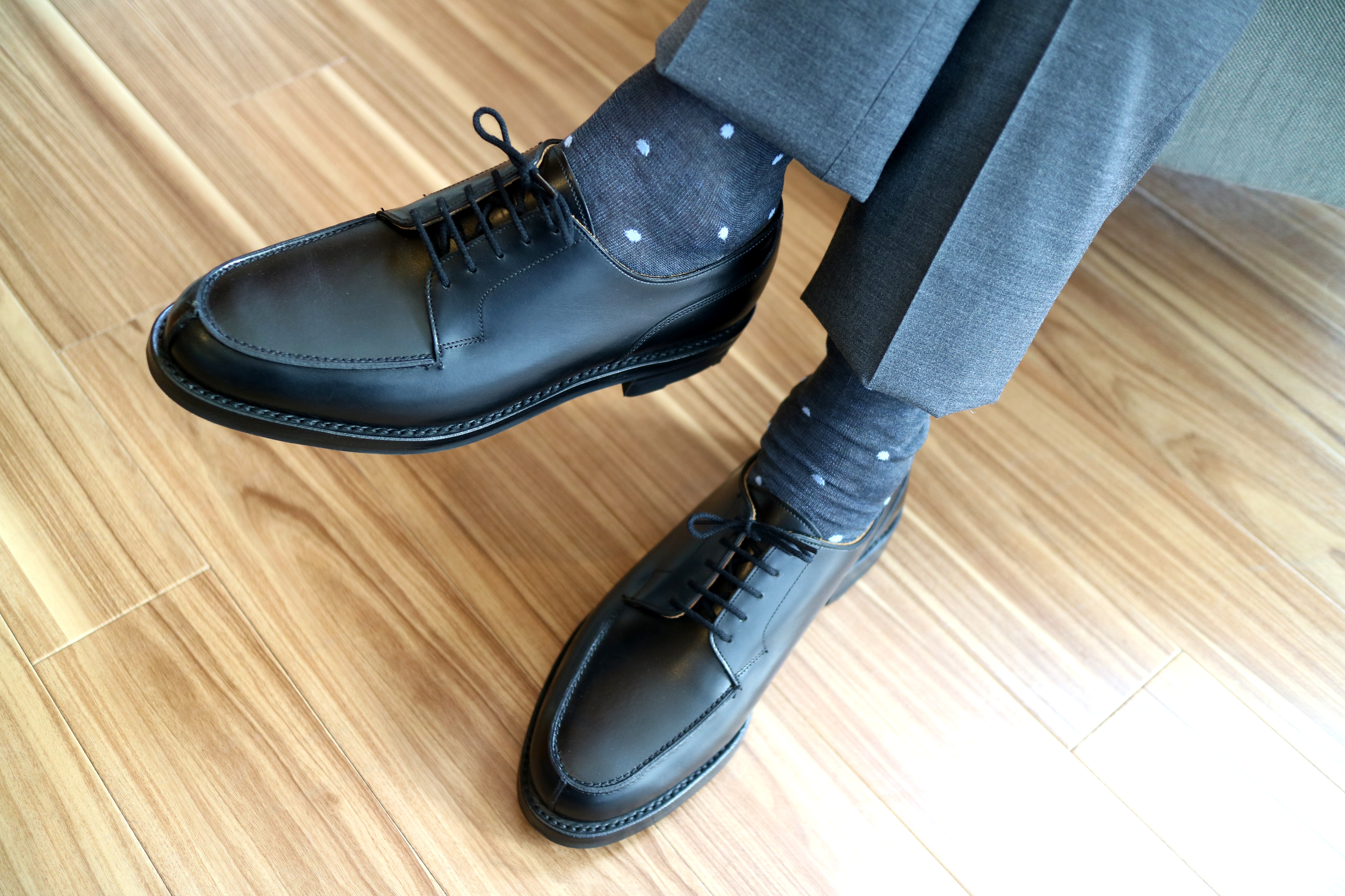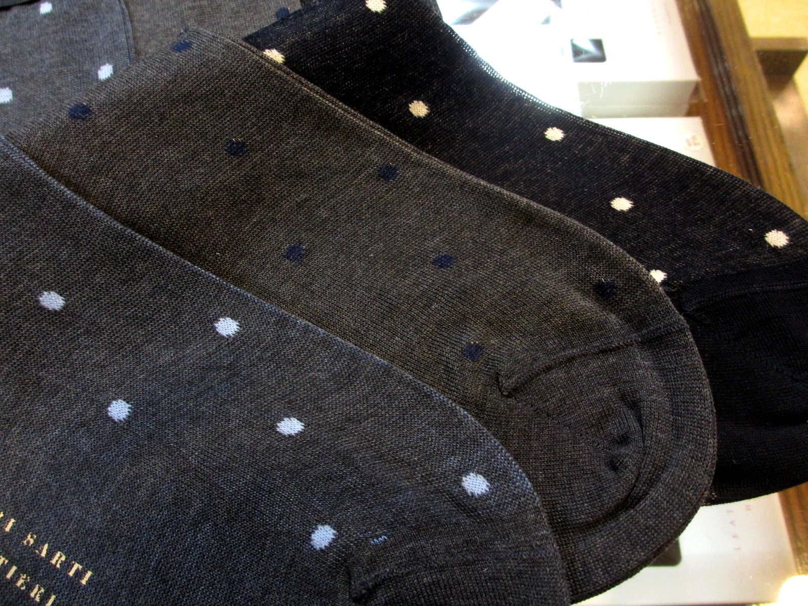 無地のボトムなら、こんなドット柄のソックスはいかがでしょう。派手になり過ぎない、さりげないアクセント。いつも強面の貴方でも微笑んだ際のえくぼのような、そんなチャームポイントになるソックスです。えくぼの出来ない人には、特にお勧めです。