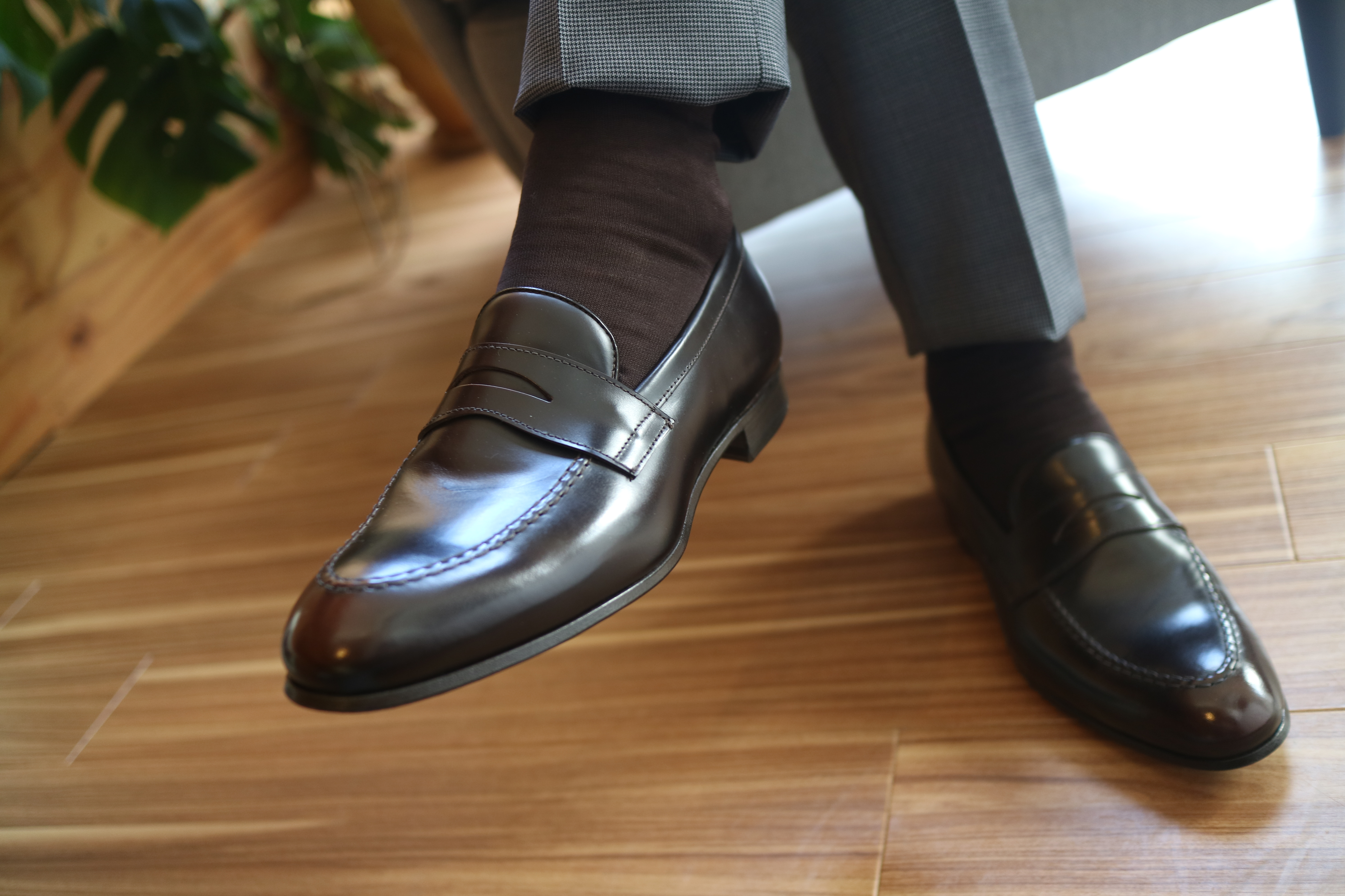 踵と爪先を見れば、靴下の良し悪しが分かります。リンキング縫製が、長時間はいた際の不快感をなくし、ハンドによる立体的な仕上がりが美しいフォルムを作り上げます。正統派を気取るならロングホーズ。ただ夏の暑さや、テーパードした裾幅の狭いパンツには不向きです。また伸縮性を考えるなら、ナイロン、ポリエステル混になりますが、吸水性、通気性を考え、敢えてコットン100%で選んでいます。
