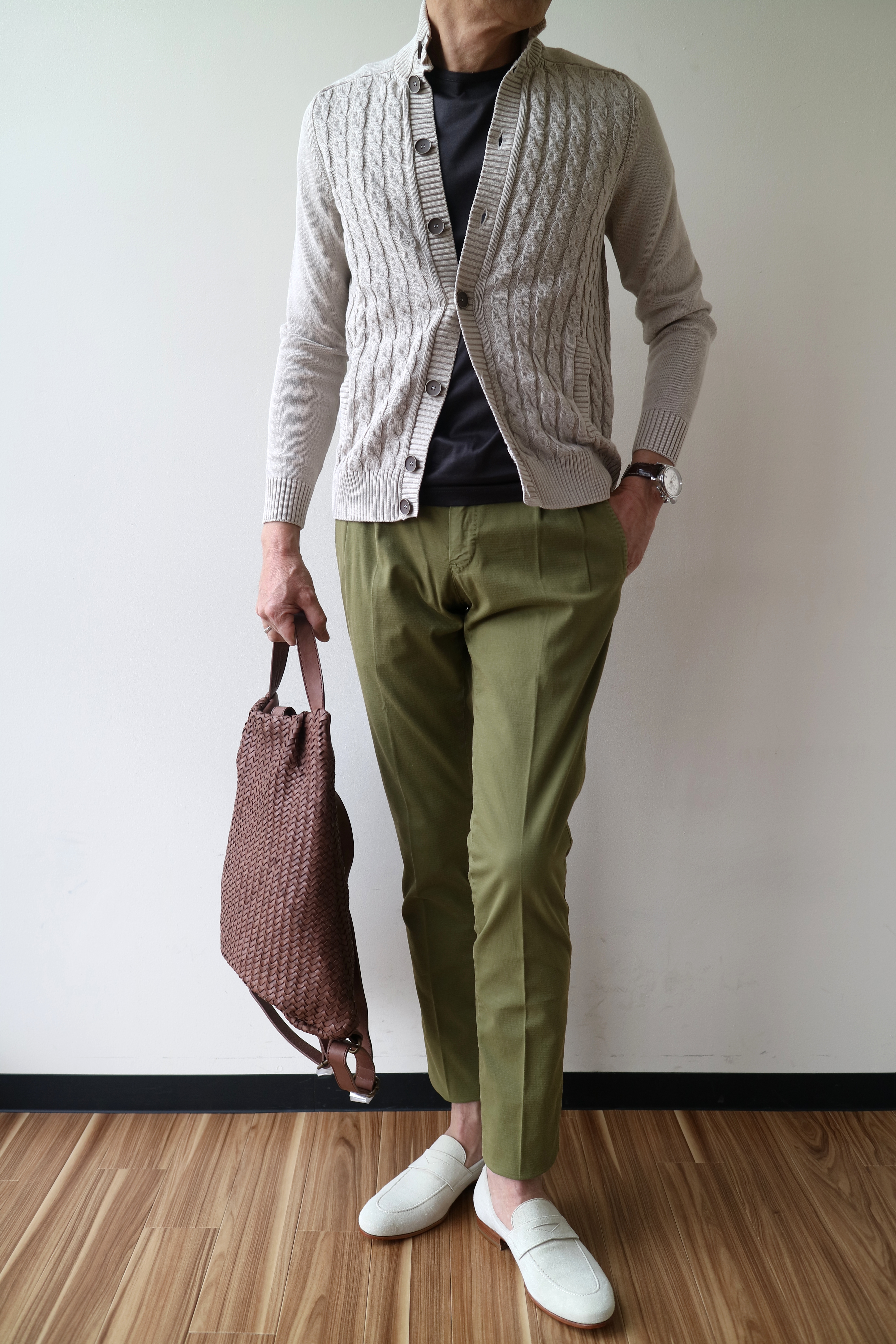 合わせたカットソーはGran Sasso(未公開)、パンツはPT01、靴はFERRANTE、バッグはZAINETTOです。