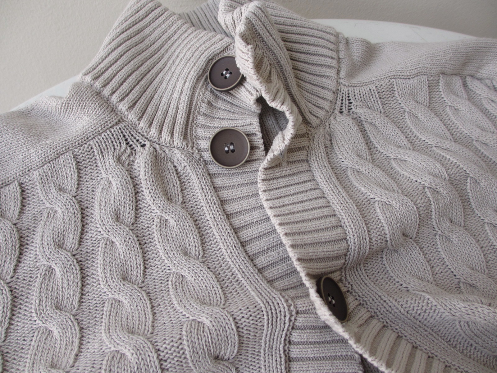 "OPEN WITH BUTTONS AND POCKETS" 両サイドにポケットが付いた、釦で開閉できるニットのことです。色違いのネイビーを待っていたのですが、既にコーディネートで着用済み。先行してお届けします。