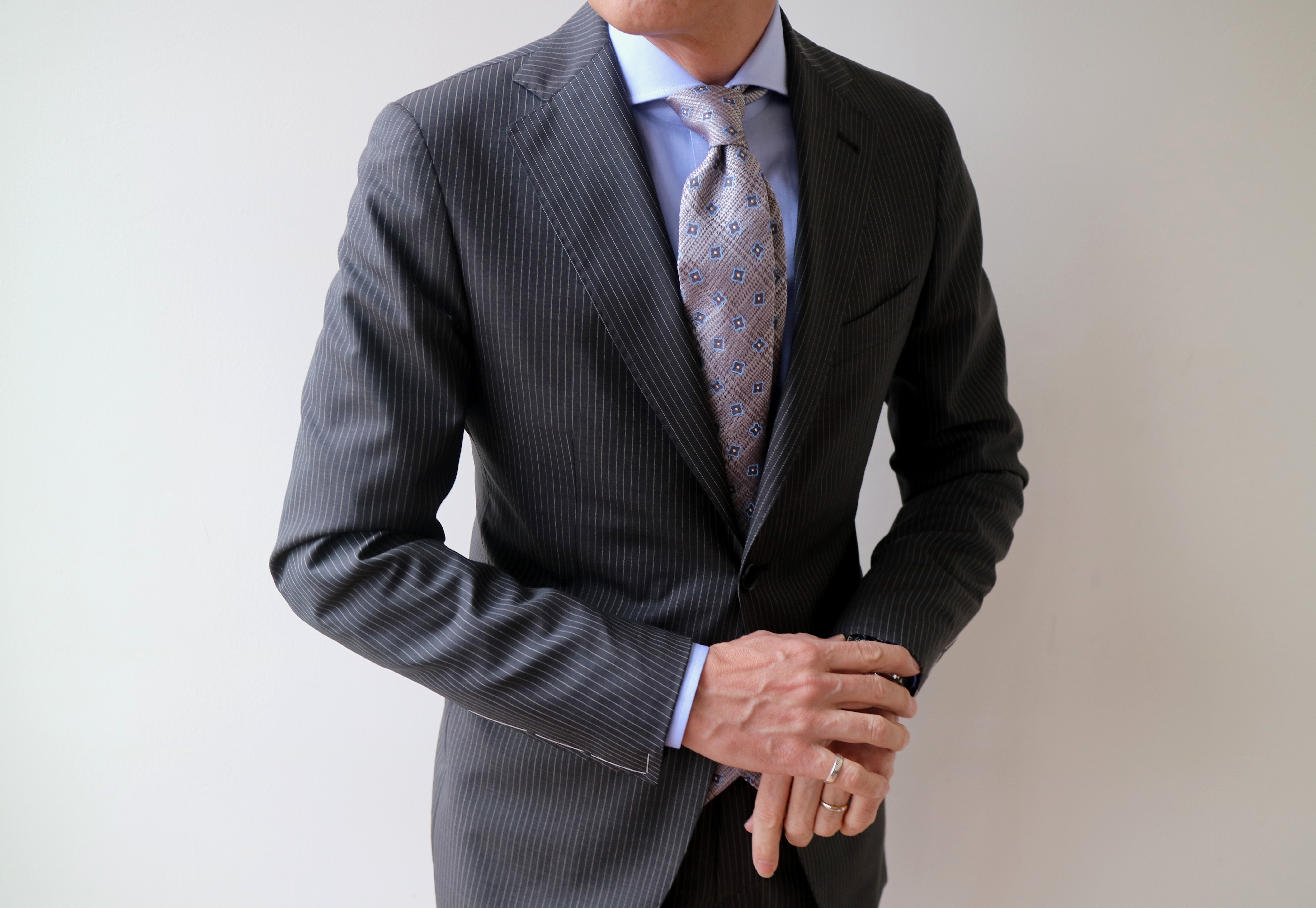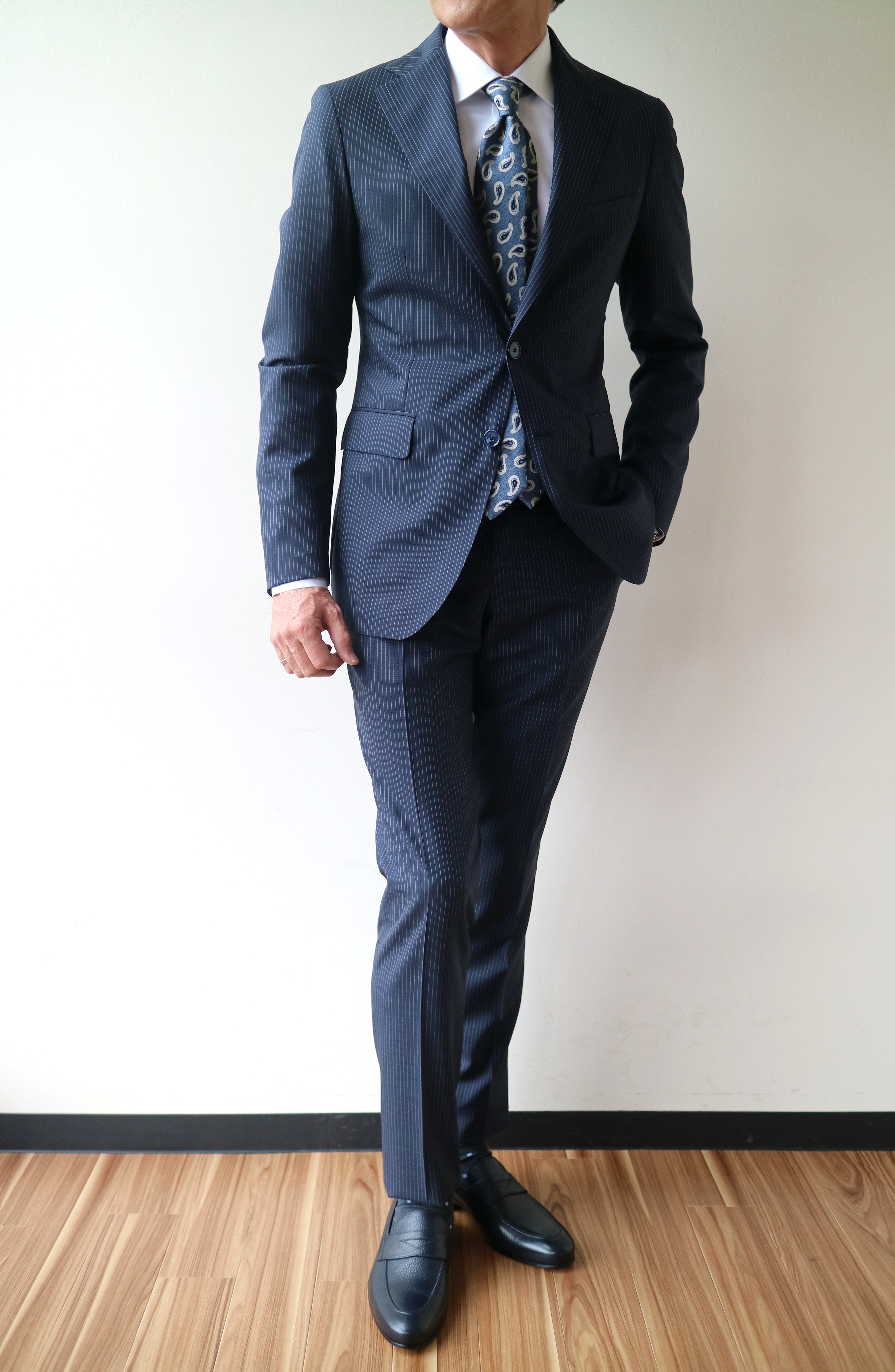SUPER150'Sのしなやかな生地は、気品と高級感があります。5mm間隔の幅の狭いストライプ柄は、無地の次に揃えたいスーツ柄。今回、納得のいく生地に出会えました。