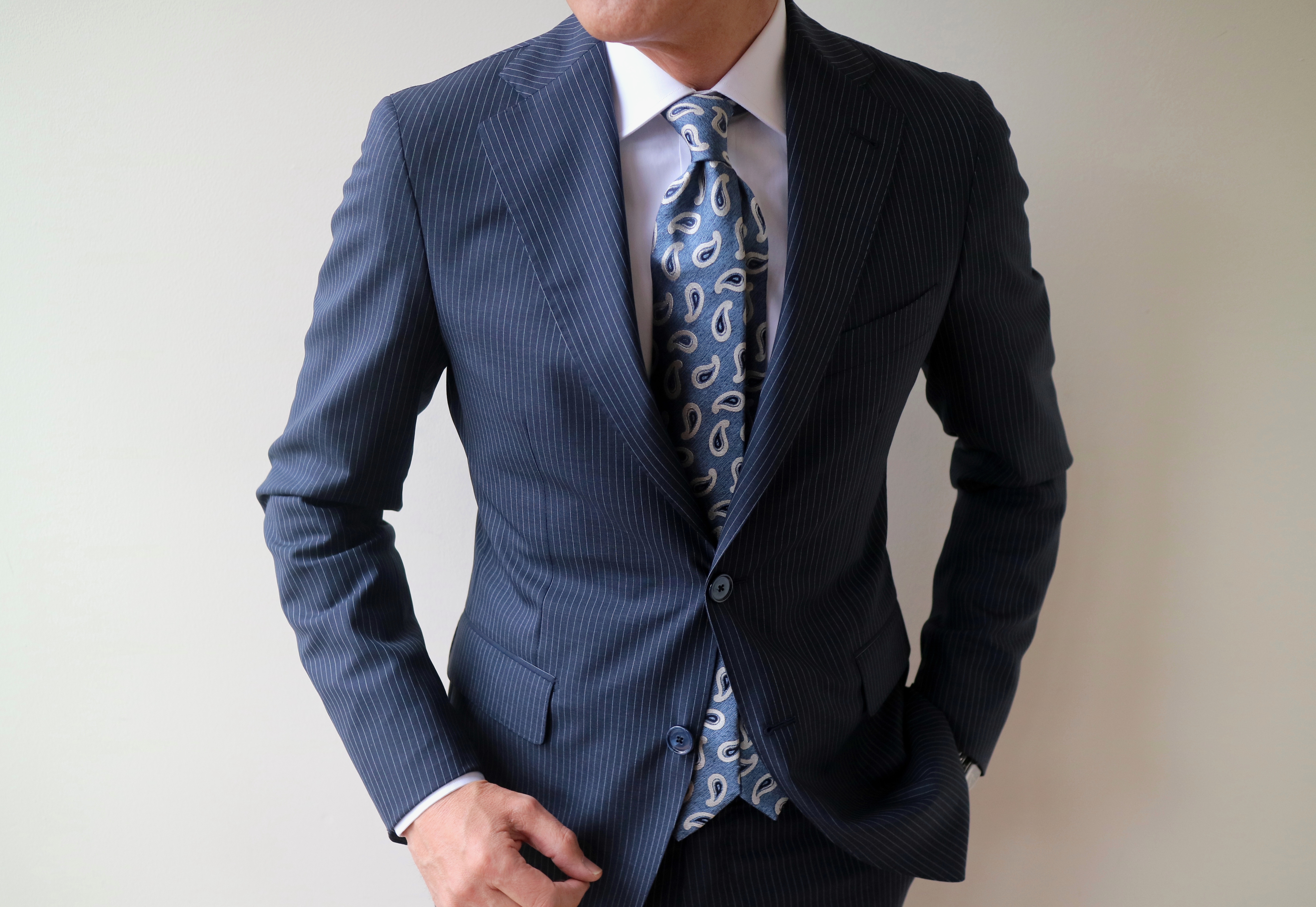 ネイビーのナローストライプは、精悍な顔立ちです。清潔感もあり、若々しさを表現するなら、最適です。