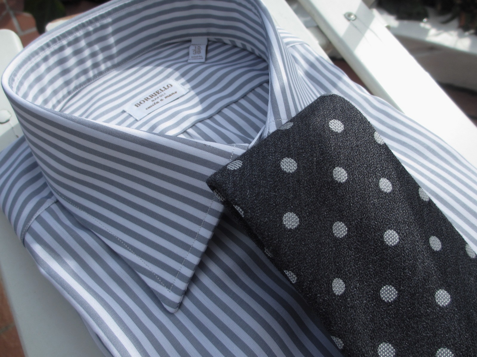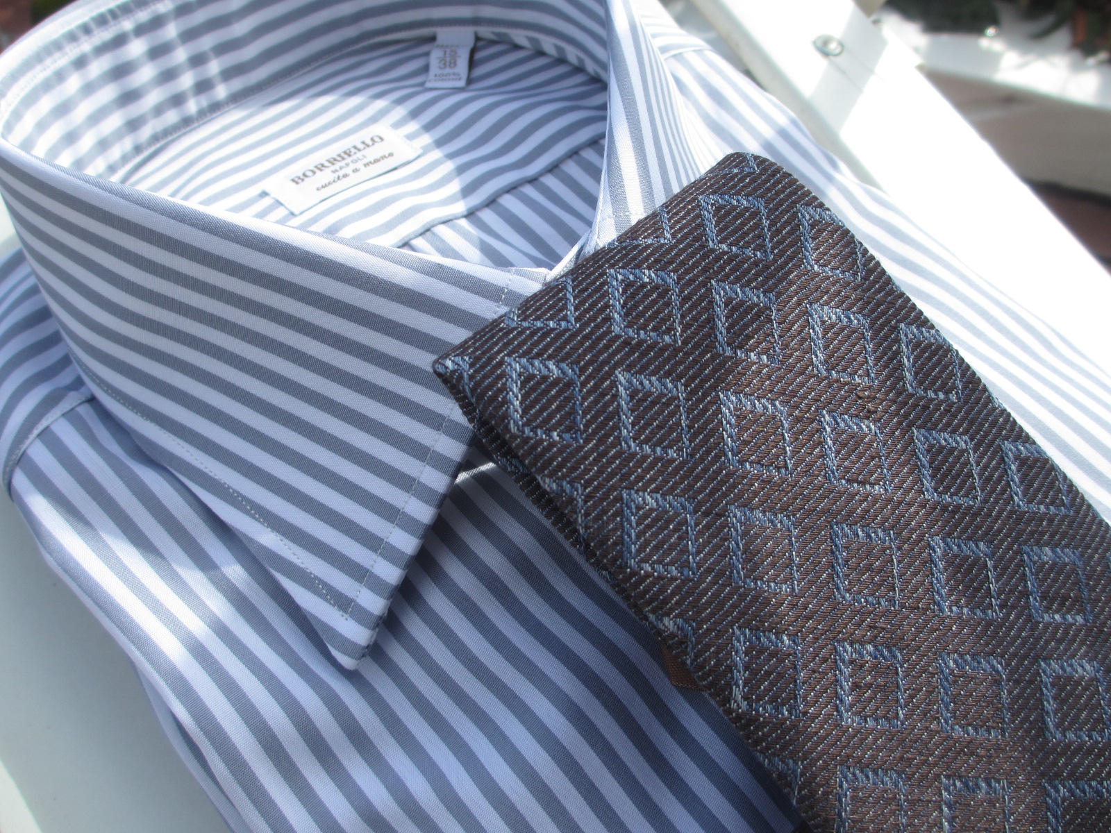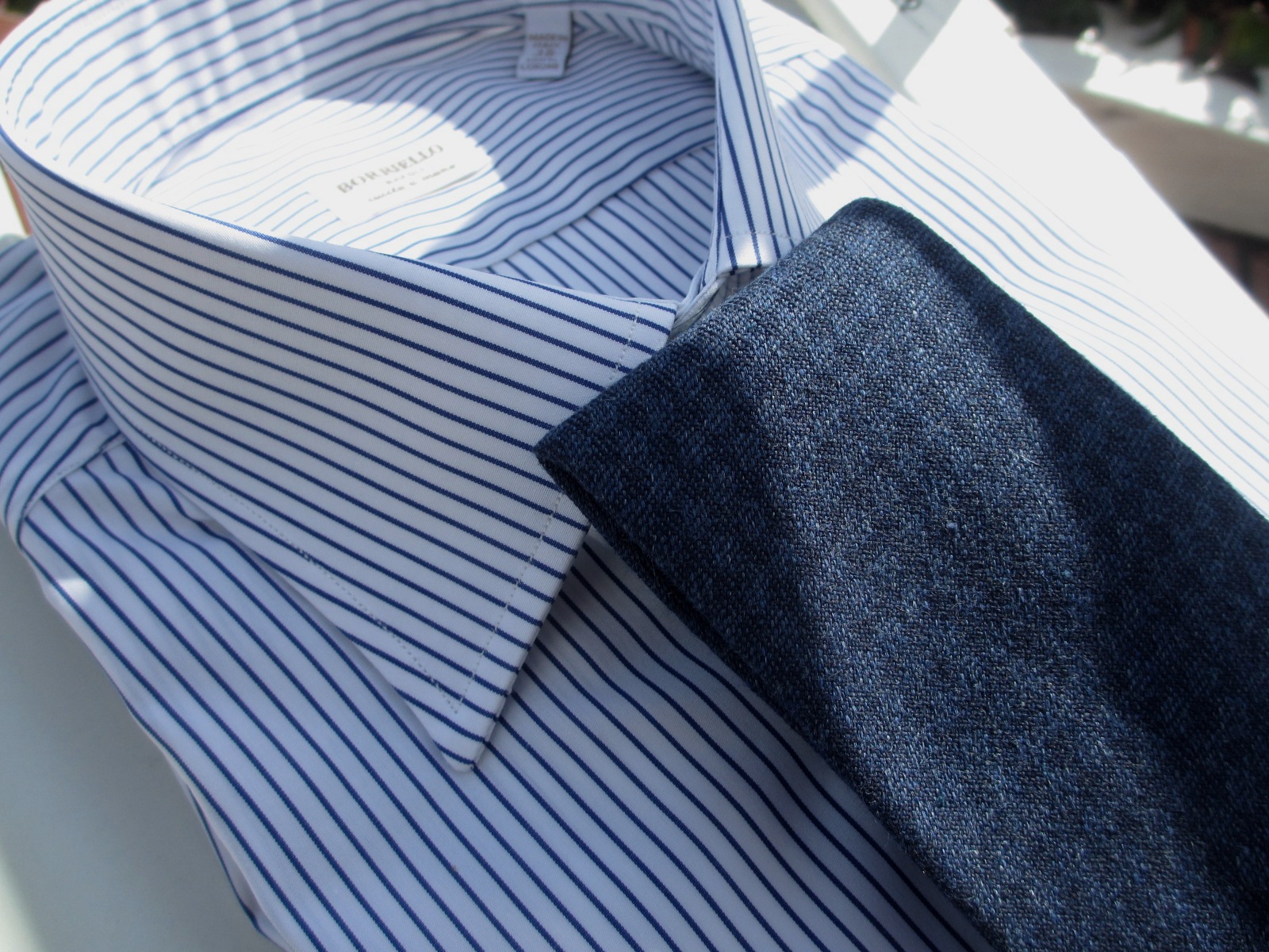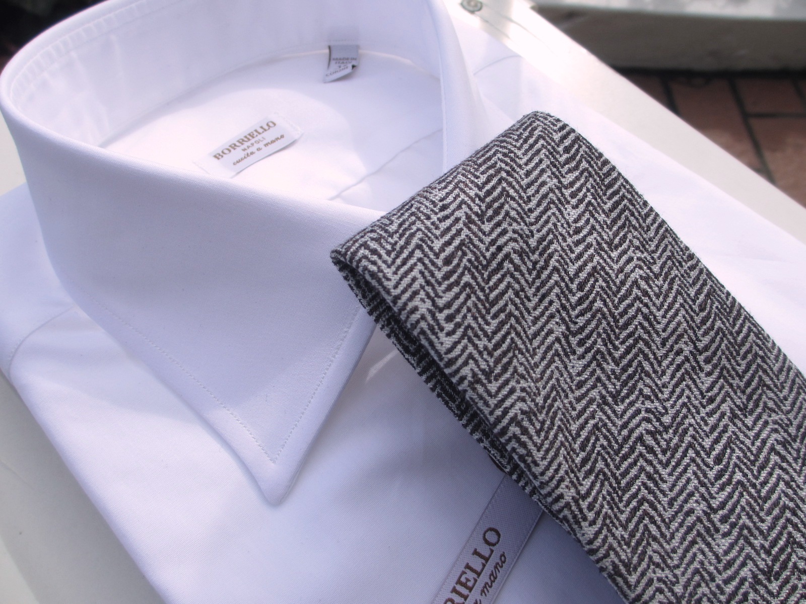 どちらも合わせたシャツが同じになりました。ご紹介が遅くなりましたが、今回合わせたシャツの殆どが、BORRIELLO/ボリエッロに別注をかけたオリジナルです。近日中にご案内しますので、ご期待ください。