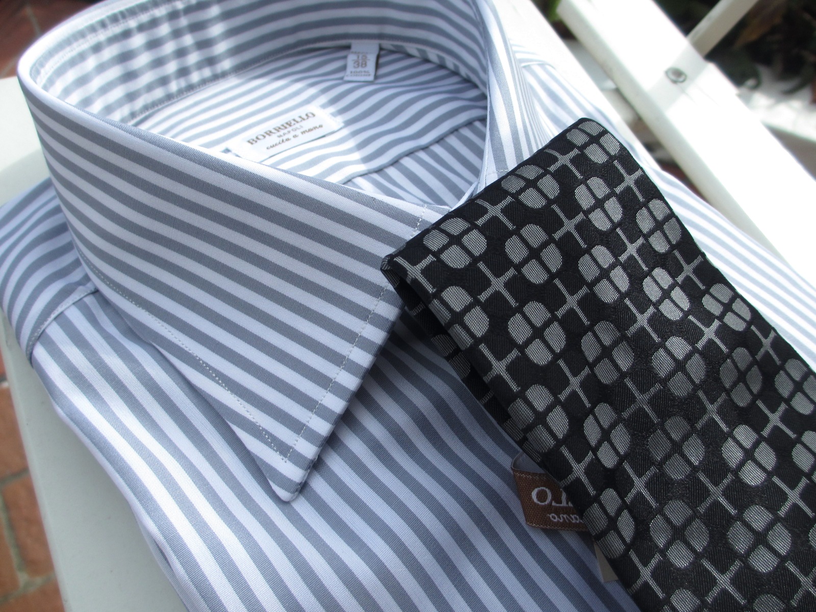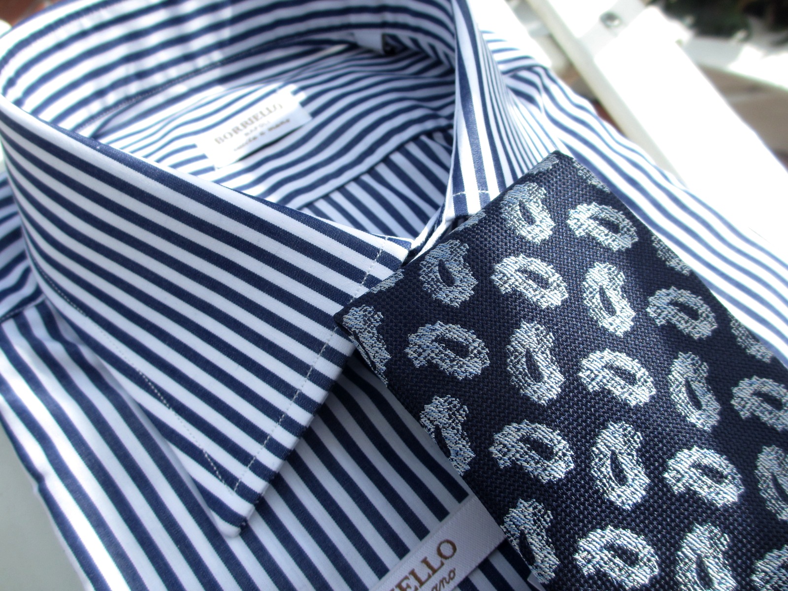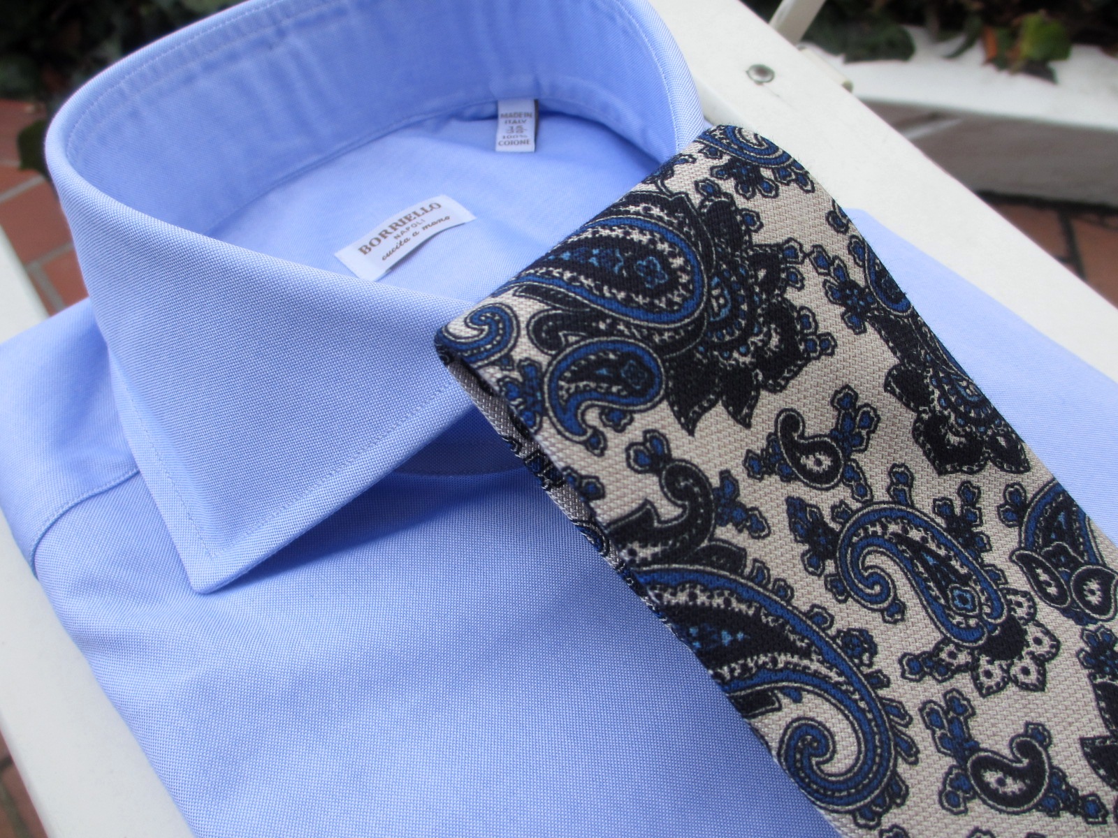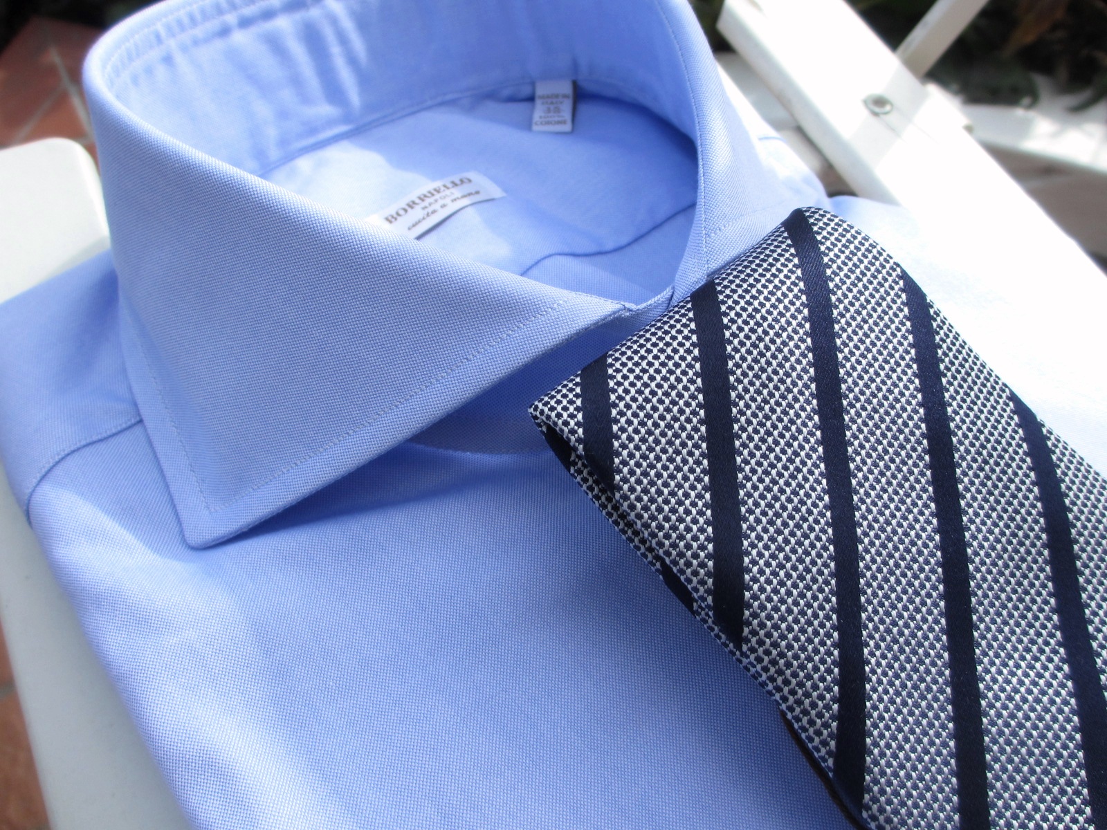 どちらも合わせたシャツが同じになりました。ご紹介が遅くなりましたが、今回合わせたシャツの殆どが、BORRIELLO/ボリエッロに別注をかけたオリジナルです。近日中にご案内しますので、ご期待ください。
