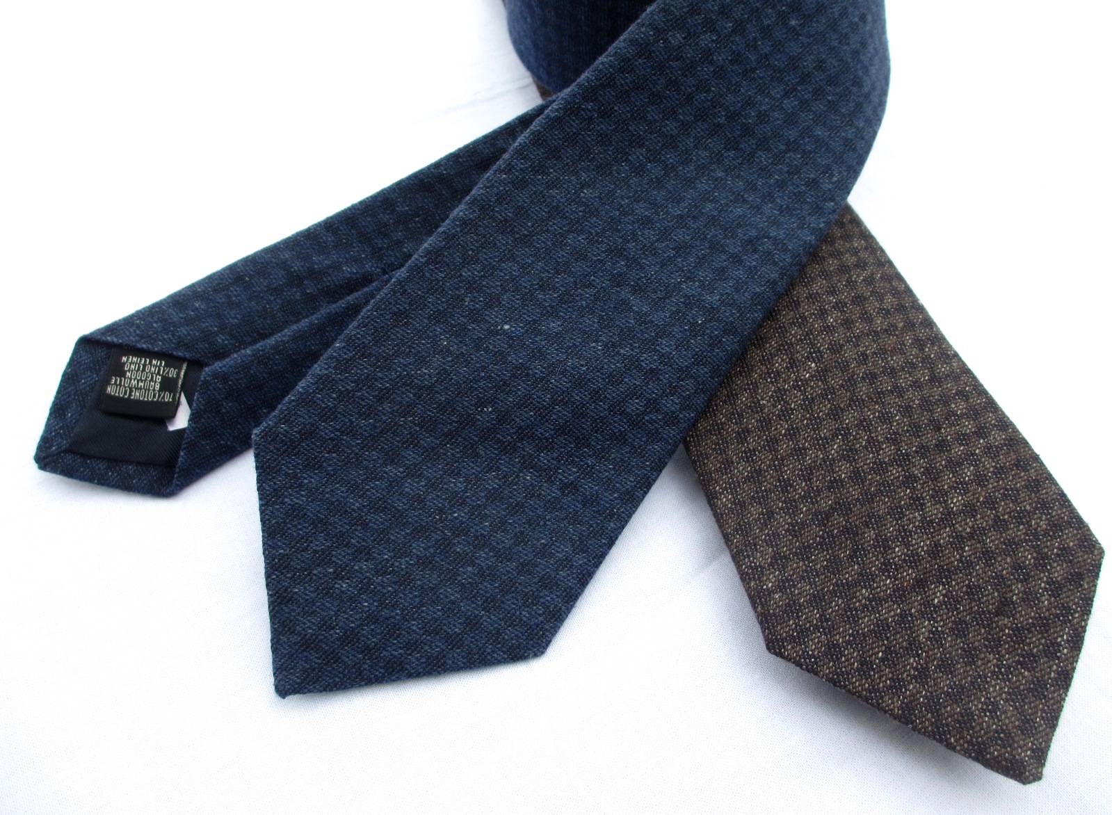 右からスクエア、ドット、ヘリンボーンのクラシック柄。素材は、シルクの混率が高いシルク・コットン。絶妙な掠れ感が魅力です。