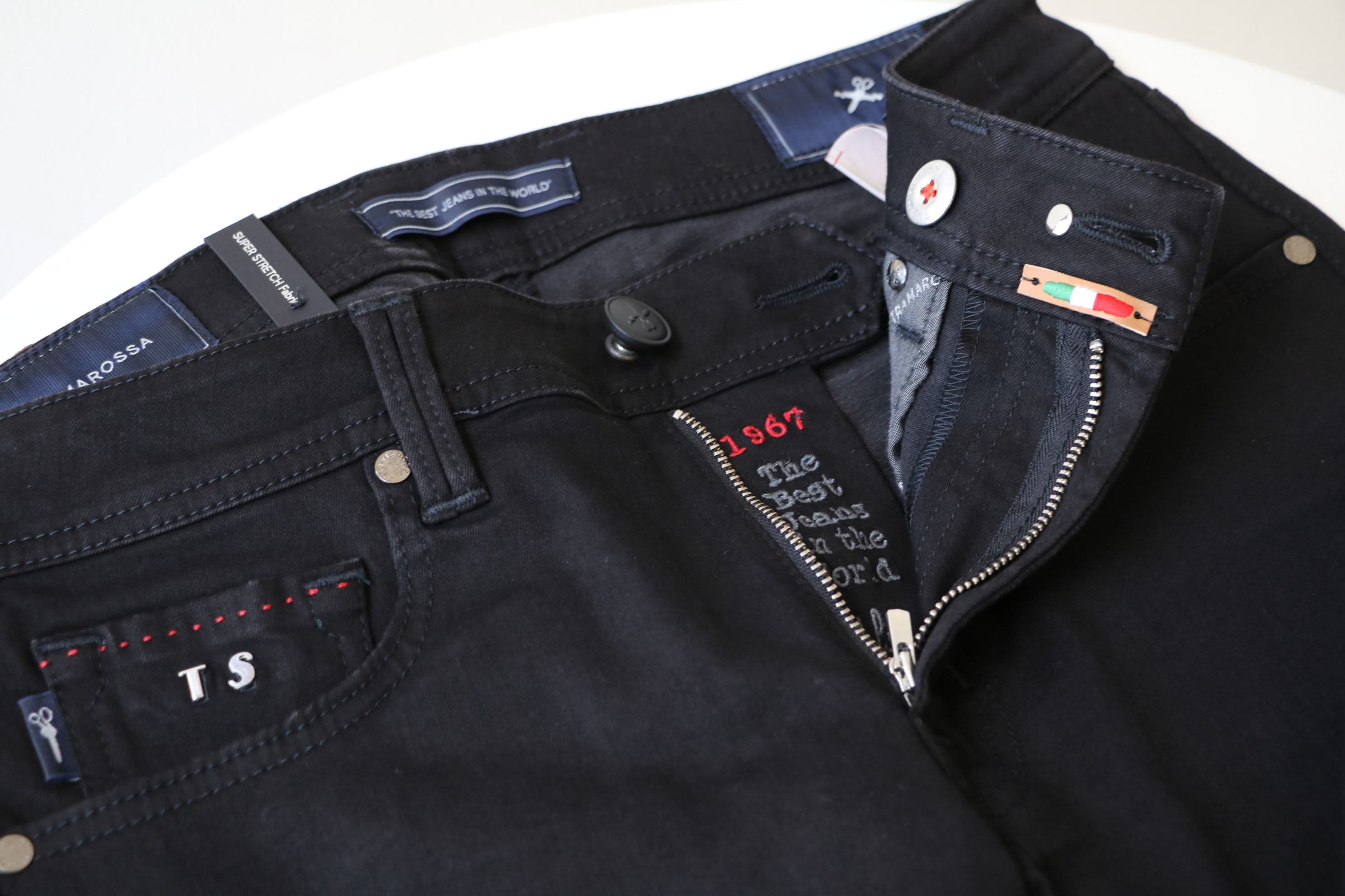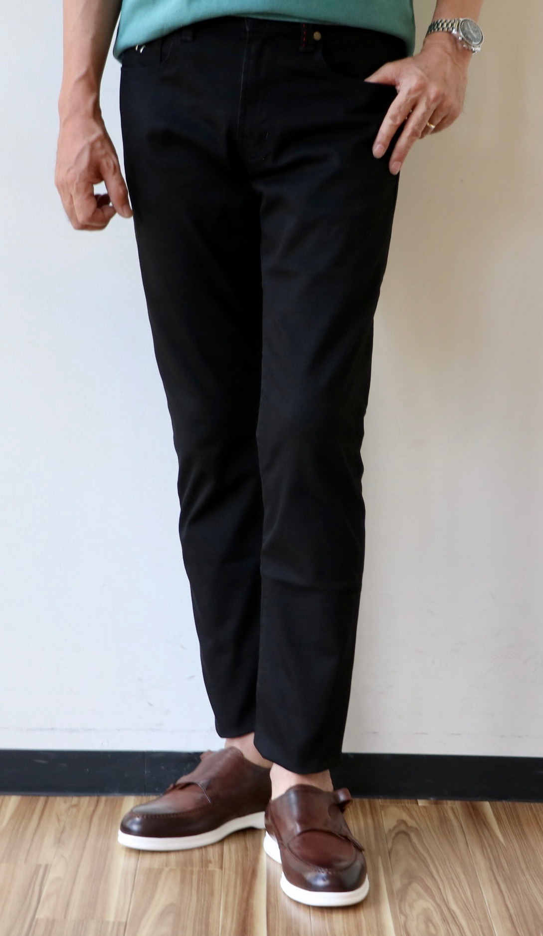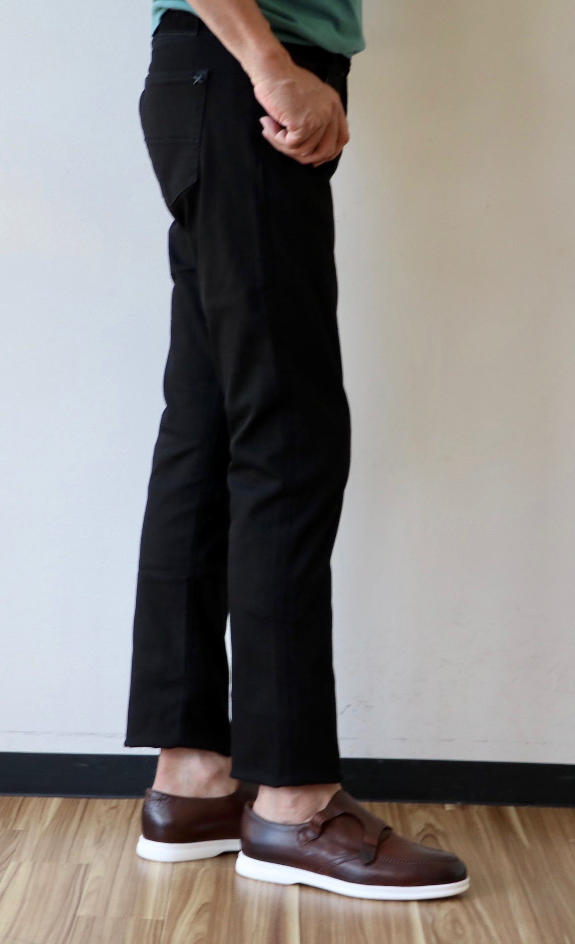 今回、ブラックで選んだモデルは、「MICHELANGELO/ミケランジェロ」。今までセレクトしている細身の「LEONARDO SLIM」より、股上が1.5センチほど深くなり、その分、ワタリにゆとりを持たせたテーパードモデルです。JACOB COHEN(ヤコブ コーエン)で言うスリムフィット「J622」とレギュラーフィット「J688」のようなシルエットの違いです。ただ、ヤコブコーエンも今季よりモデル名が変わりますので、あくまでも従来のモデルということにしてください。