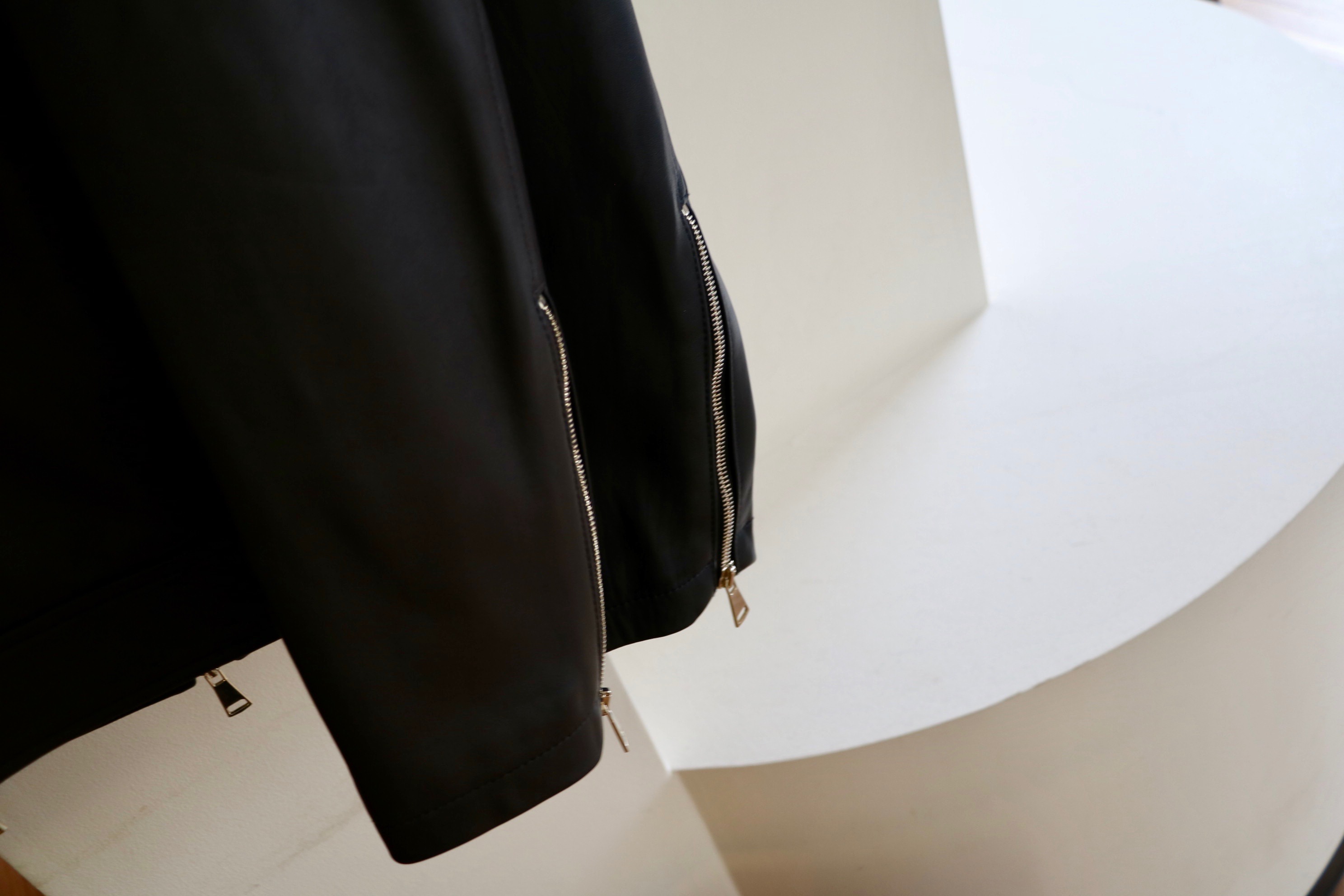 素材や色、襟のデザインの他にセレクトを決めた理由が、袖の仕様です。シングルライダースに見るのは、ジップの袖。このモデルは、ジップに加え、袖口をカフスにすることで、襟付きとのバランスをとっています。さすが、とついつい頷いてしまいました。