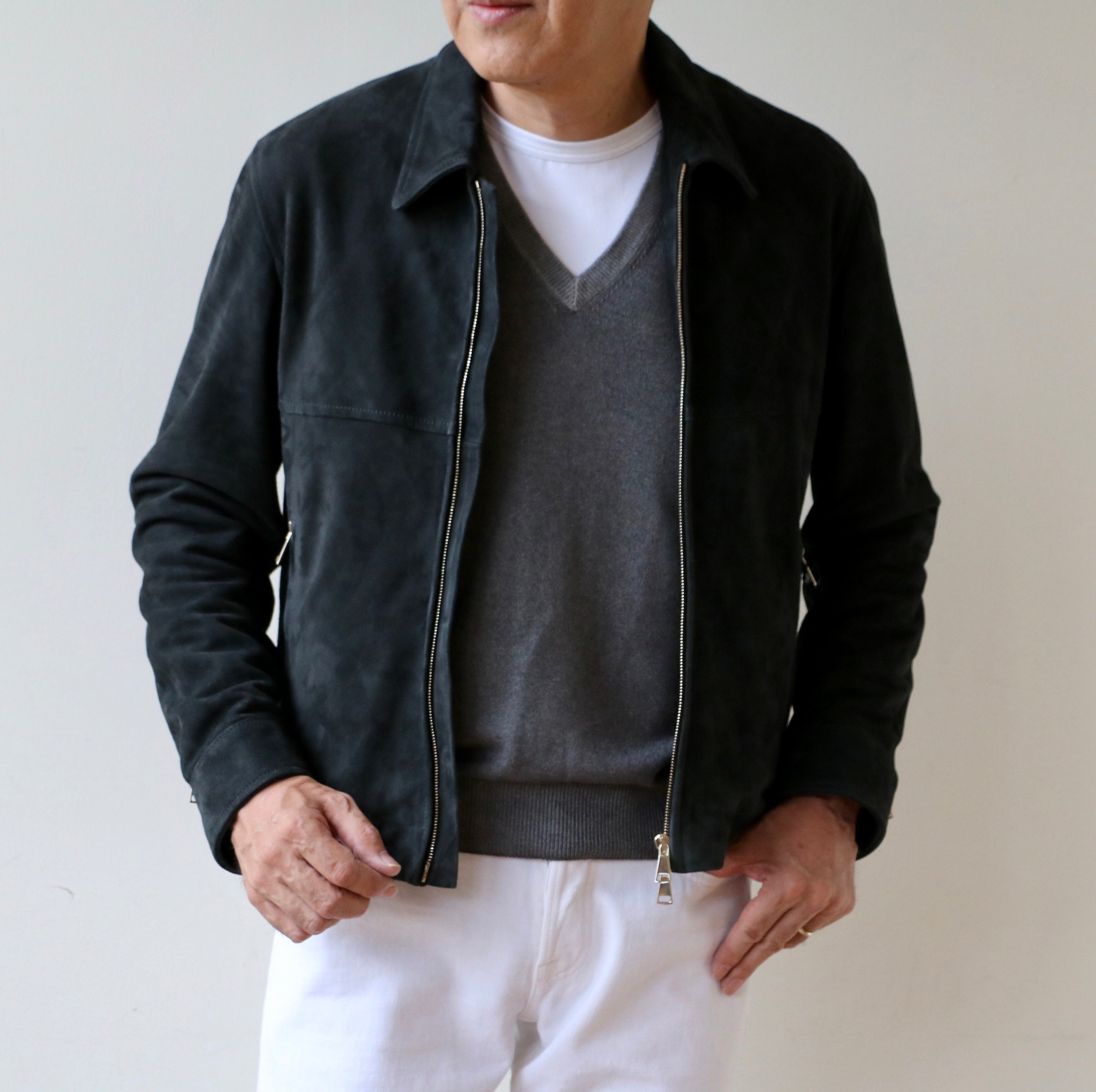 ゴート(山羊革)スエードの襟付きシングルライダースです。今回、秋冬でもあり、シーズン長く楽しんでいただくために、裏地もつけています。ゴートスエードの柔らかな質感に、襟をつけることで更にソフトな雰囲気に仕上げました。拘ったのは、デザインだけではありません。ブランドのカラー名は「ANTRACITE 6022」。イタリア語で、アントラチーテ。フランス語では、「ANTHRACITE/アントラシート」で、無煙炭のことです。極めて黒に近いグレイのことですが、実際には青みがかかります。青みのあるダークグレイと表現しても良さそうです。黒ほど強くなく、グレイより地味にならず、青よりシック。とても情緒的な色合いが、今までのコーディネートに新鮮さを加えるはずです。