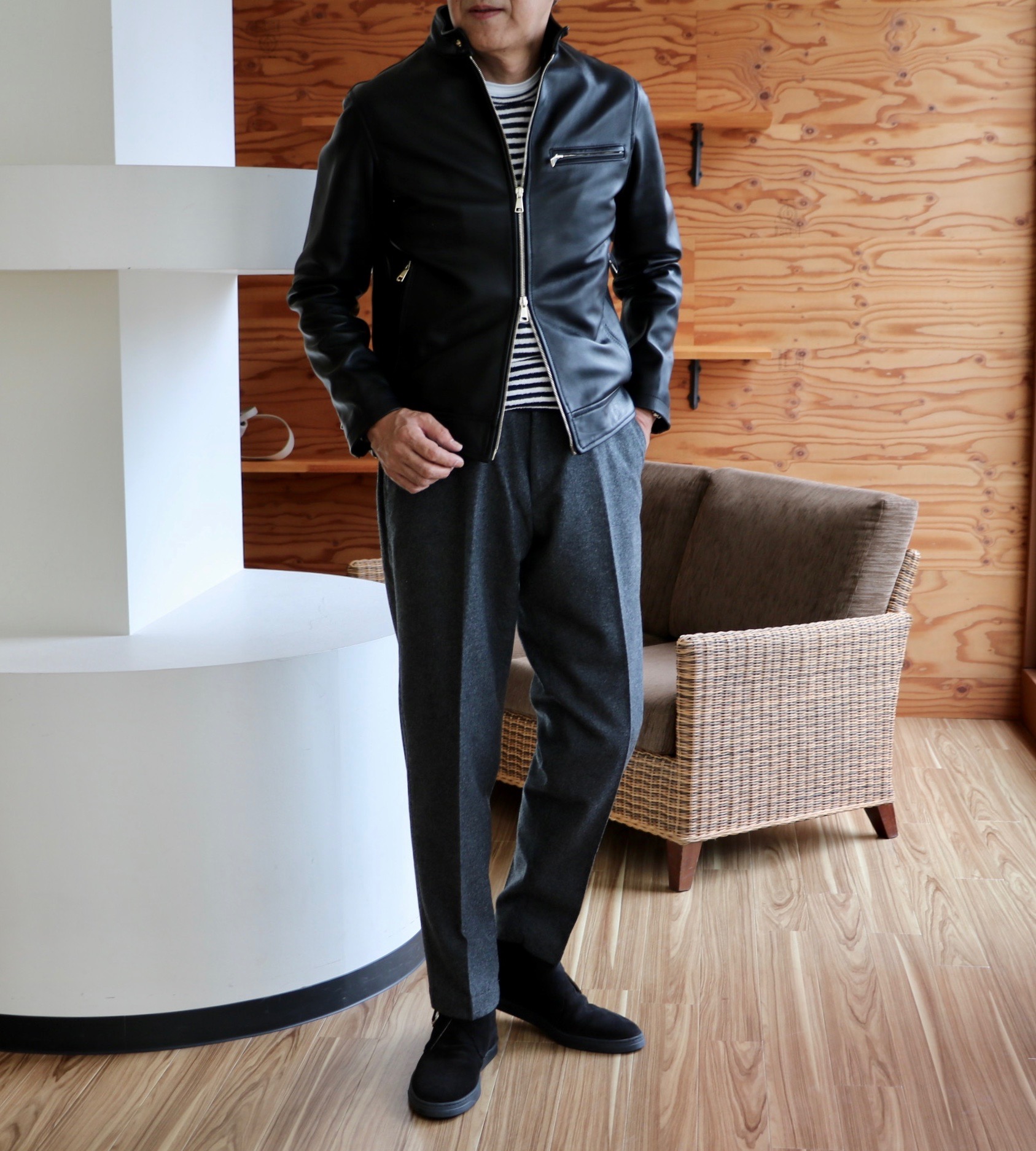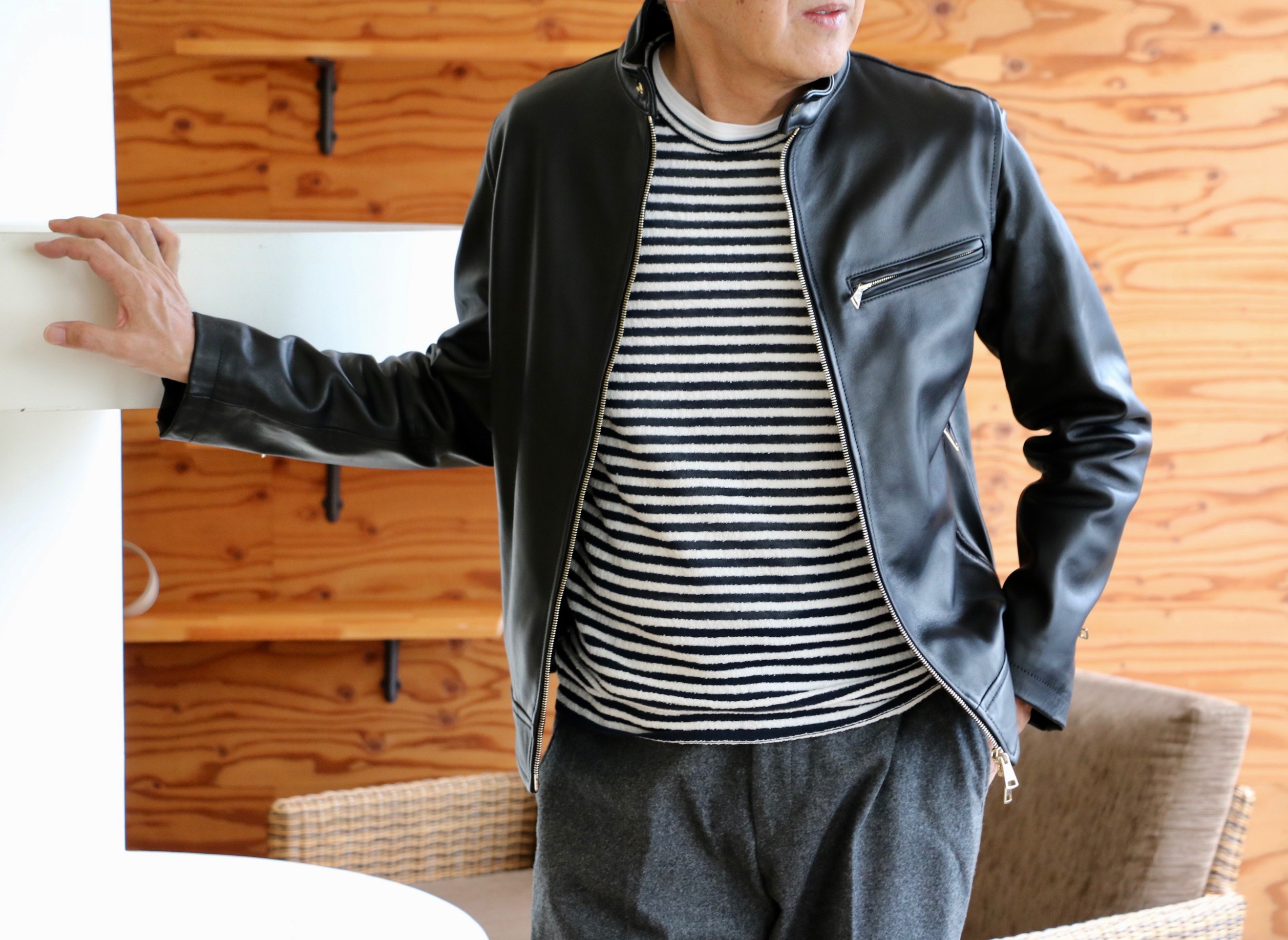 昨日、コーディネートができなかった、いや怠けてしまったシープスキン シングルライダース。今回、ゴートスキン(山羊革)からシープスキン(羊革)に変えてオーダーです。モデルは「3931 JP」と全ての仕様、付属品は同じになります。素人目には、多分、同じに見え、見分けることは難しいほどの違いですが、シープスキンの方がややキメが細やかでしっとりとした表情を持ちます。各ブランドのレザーが値上がりする中、価格据え置きでご提供できるのも、このブランドの魅力です。