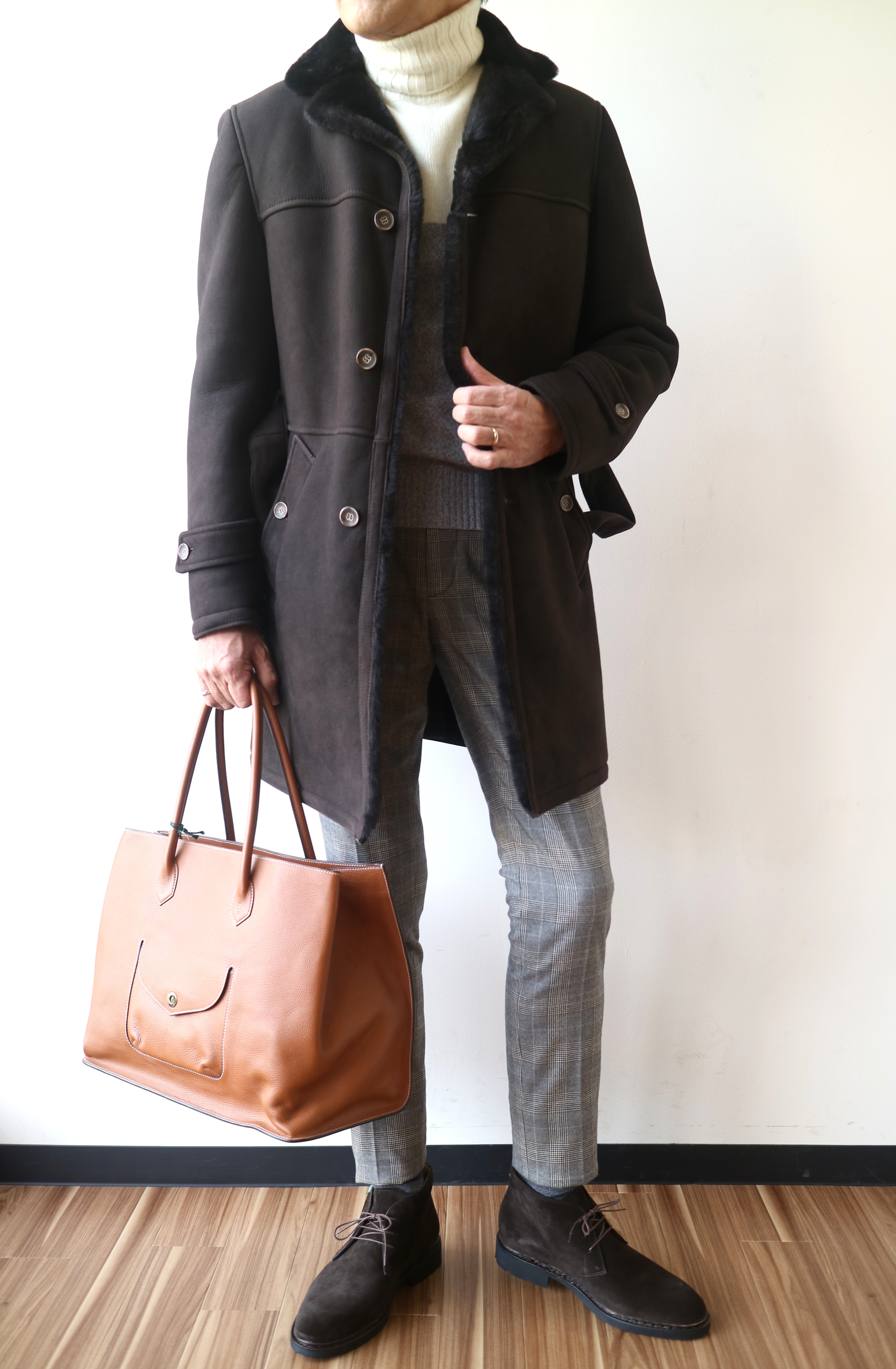 合わせたニットはmorgano、パンツはINCOTEX、靴はParaboot、手に持ったバッグはCISEIです。