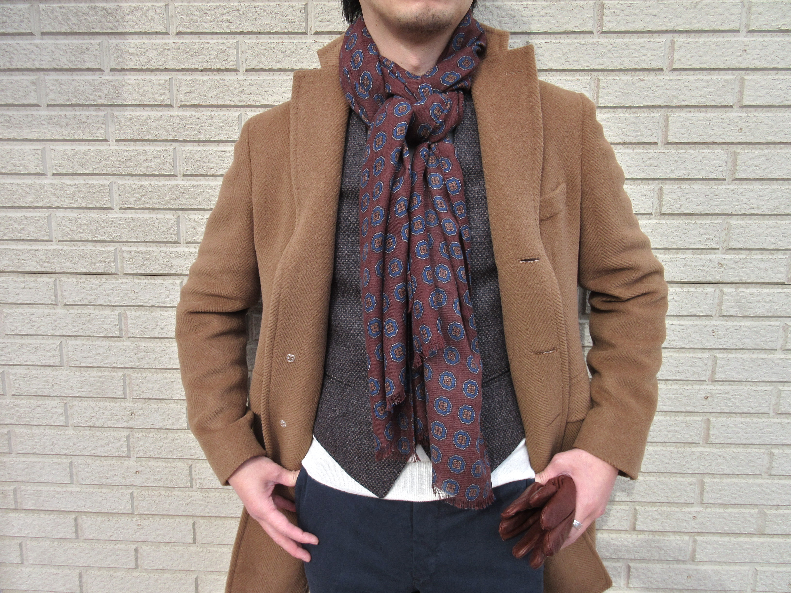 薄手のストールは、先を外に垂らすのではなく、スカーフ感覚でジャケットの中に入れてしまうのが気分です。