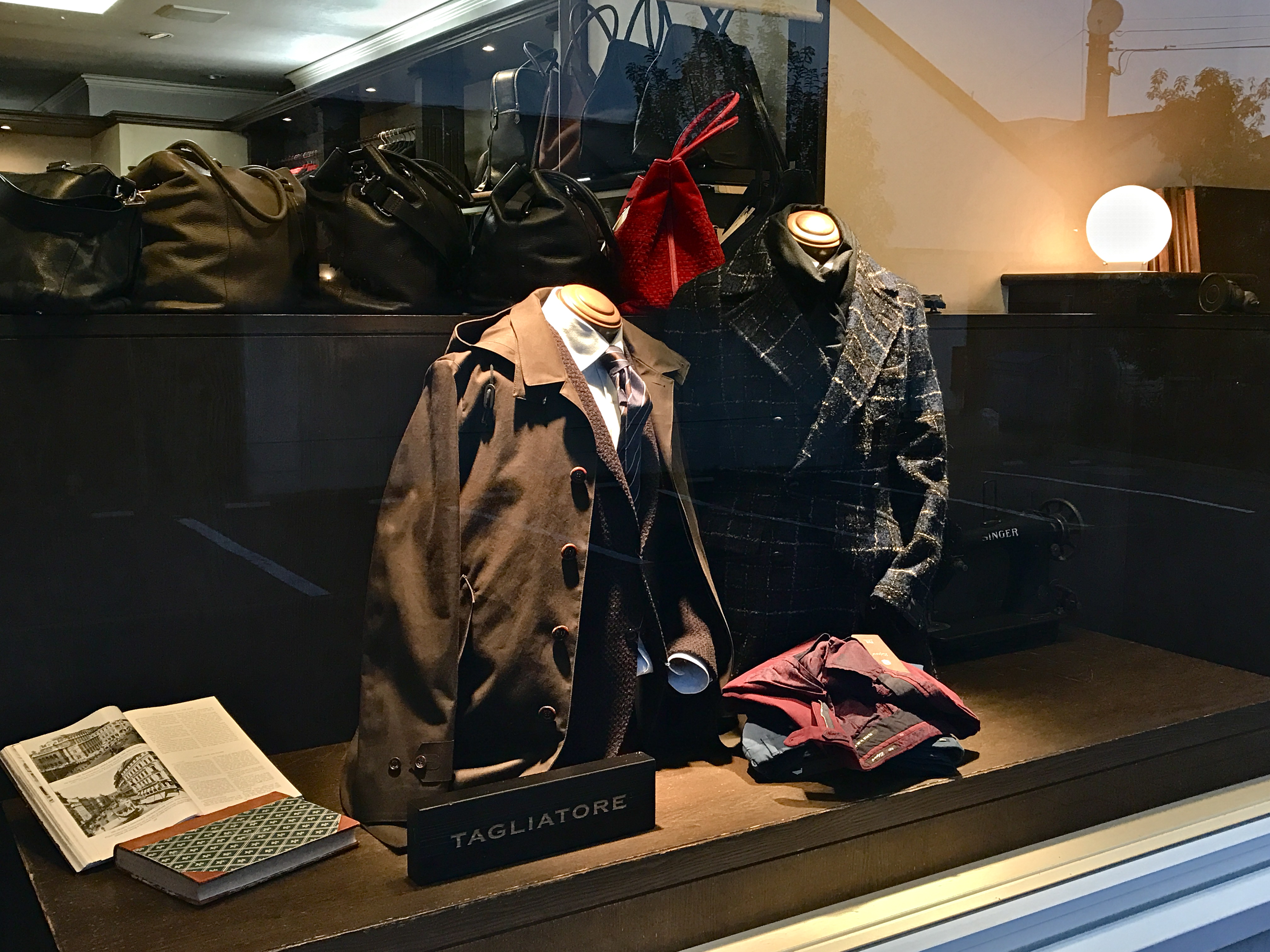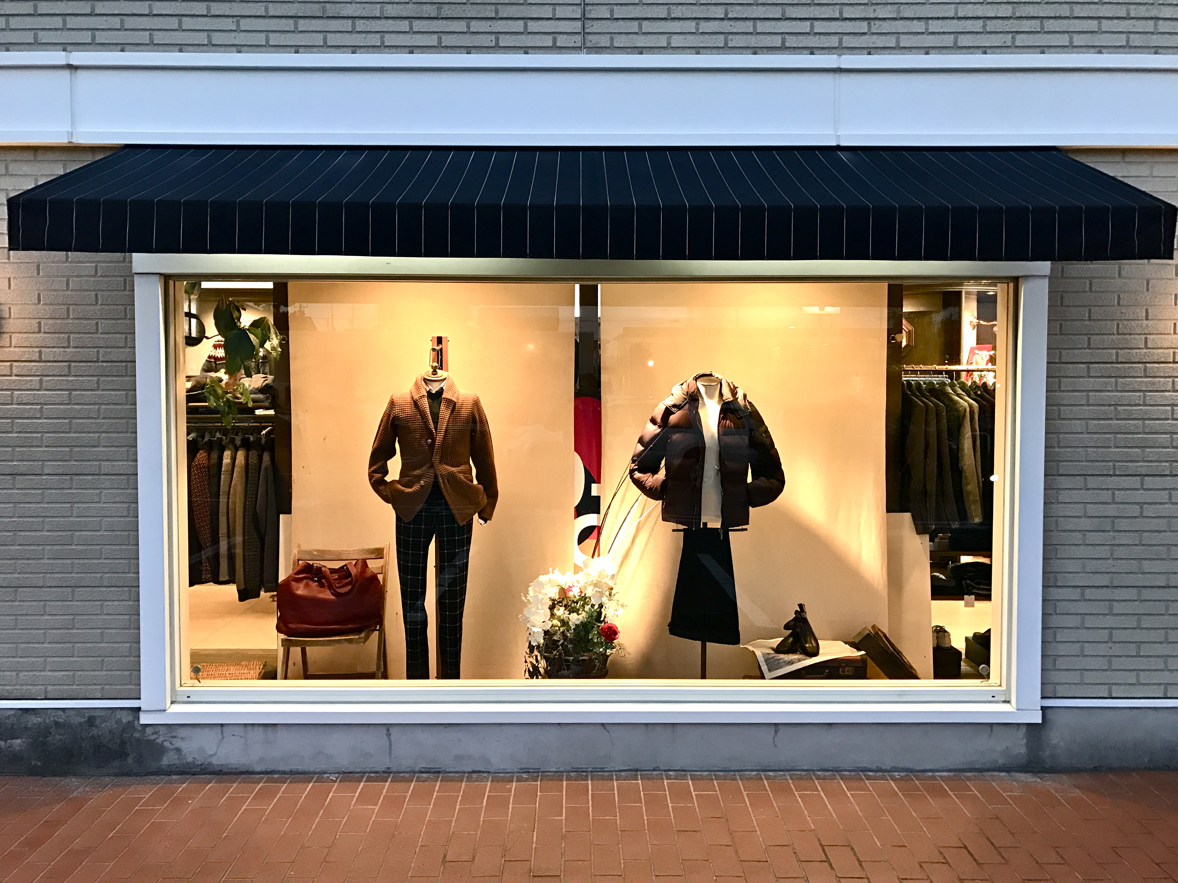 日が暮れたあとのGLORY GUY。ライトアップされた外側のディスプレイを見ていきましょう。外側のウィンドウディスプレイは、ドレスとカジュアルの2箇所に分けられています。